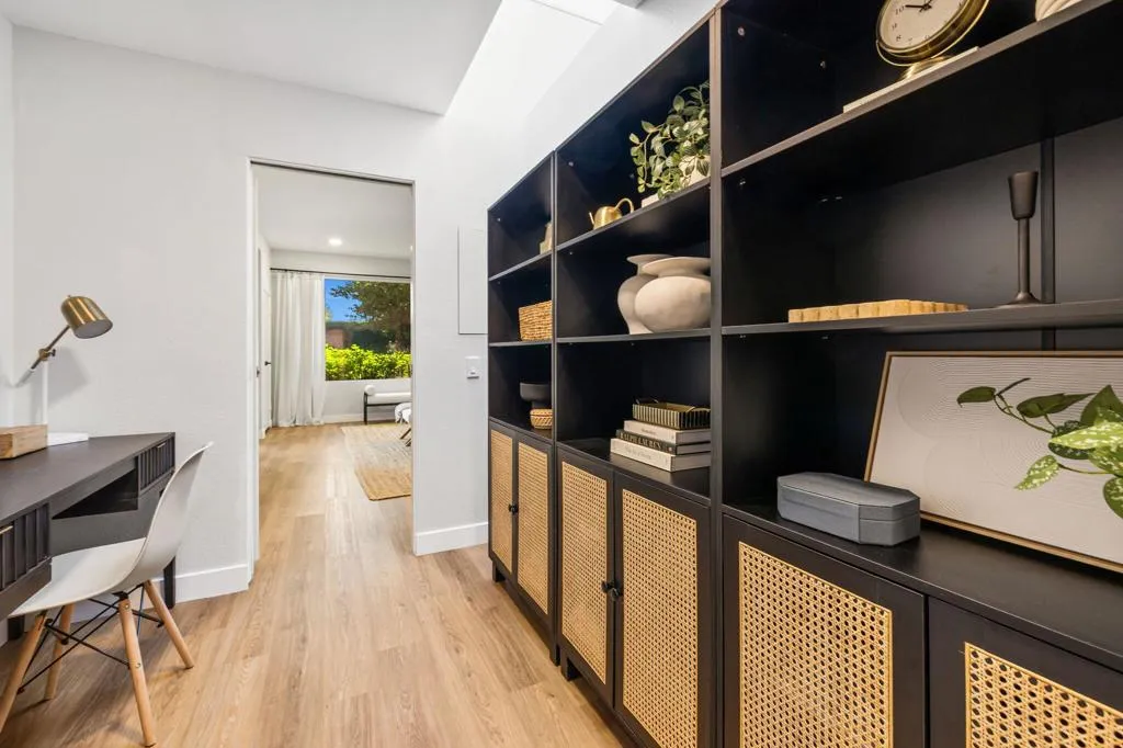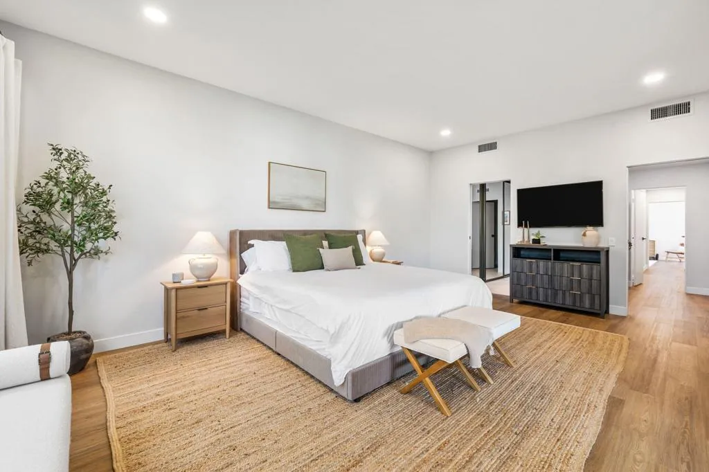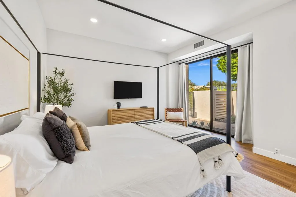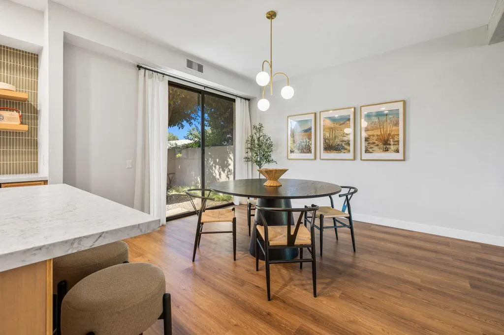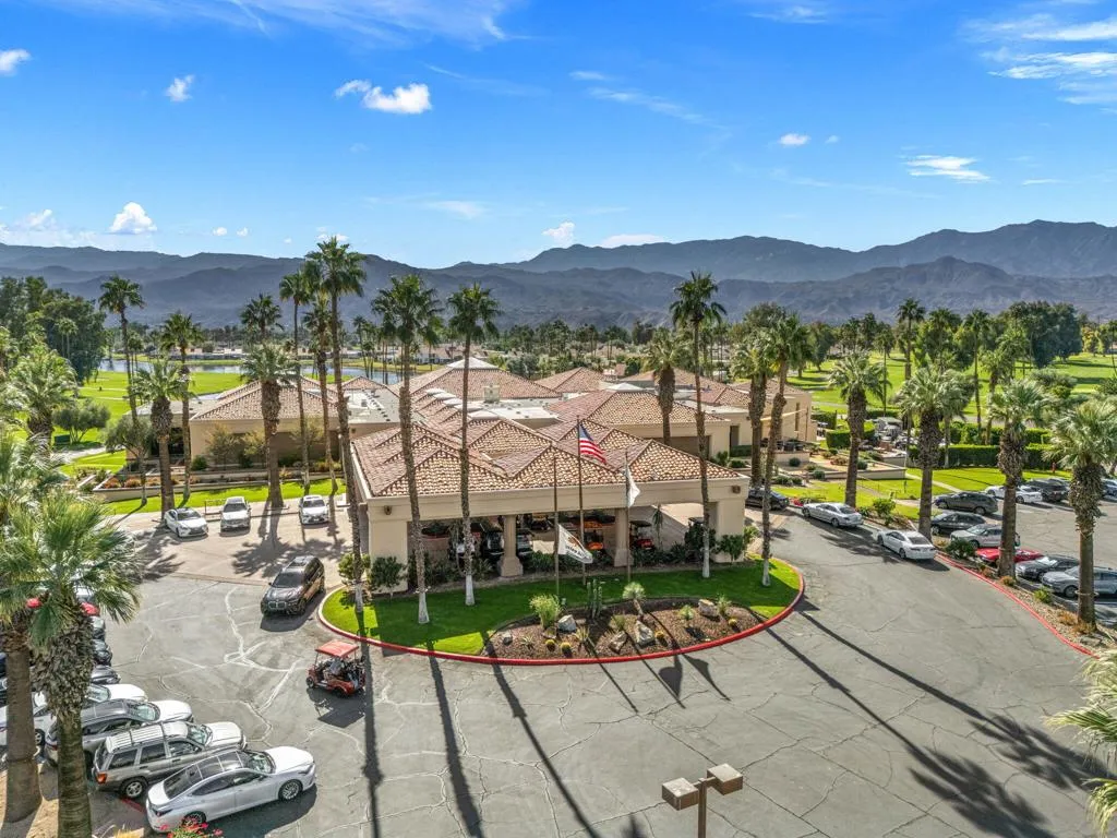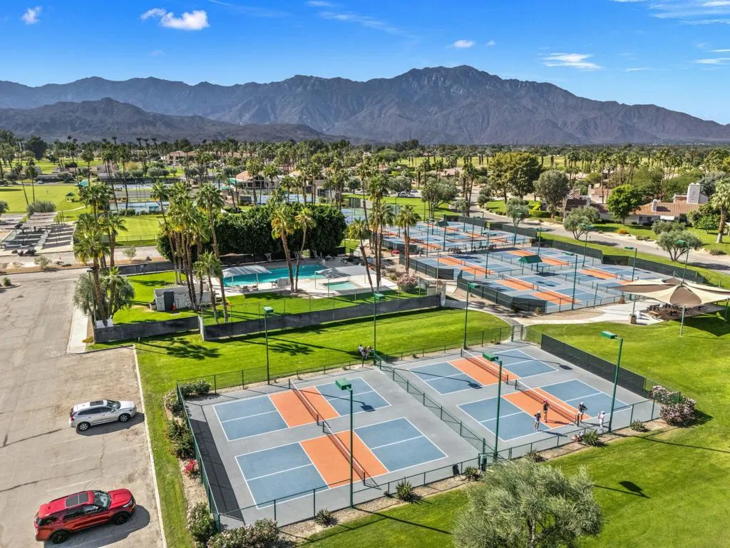 Completely redesigned by a leading Los Angeles design team, this 2-bedroom residence in Mission Hills Country Club offers a level of finish and detail that sets it apart. Warm finishes and a strong indoor-outdoor connection define the space. The living room features vaulted wood-beamed ceilings, a tiled fireplace, and a custom built-in wet bar. Large sliders open to a covered patio just steps from the community pool and spa, creating a setting that lives like a private extension of the home. The kitchen pairs clean design with quality materials, including white oak soft-close cabinetry, brass hardware, quartz countertops, stainless steel appliances, and an island suited for dining and entertaining. The dining area opens to a front patio with mountain views. The primary suite includes direct access to the back patio and a redesigned bathroom with floor-to-ceiling textured tile, dual vanities, and a walk-in shower. A reconfigured layout adds a bonus area off the suite, suitable for a sitting space, office, or reading nook. The guest bedroom also opens to the patio and is served by an updated hall bath with a soaking tub, glazed ceramic tile, and terrazzo-inspired flooring. Additional features include dimmable lighting, a laundry closet, ample storage, and a private two-car garage with dedicated golf cart space. The HOA covers Spectrum cable and internet, landscaping, trash, community pools, and roof and stucco maintenance. The land lease extends through 2121. A membership at Mission Hills Country Club offers access to three golf courses, tennis and pickleball courts, croquet lawns, fitness facilities, and multiple dining venues. Located minutes from shopping, dining, and hiking, with close proximity to El Paseo, downtown Palm Springs, and The Palm Springs International Airport. Don't miss out on this opportunity to make this property yours.