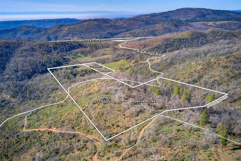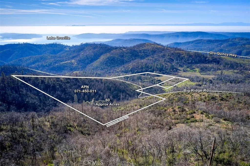 OWNER MAY CARRY: Just above the foothills surrounding Lake Oroville lies this expansive 63 acre property offering a rare blend of size, elevation, privacy, and diverse mountainous terrain. The land consists of two legal parcels; a 60-acre tract plus an additional 3 acre parcel providing flexibility for future use or long term planning. Elevations range from approximately 1,880 feet in the lower meadow areas to 2,200+/- feet at the upper reaches, creating dramatic changes in landscape and viewpoint. An old road weaves through the property, climbing toward the upper ridgeline where panoramic 360-degree views open up across surrounding mountains, rolling terrain, and even a potential distant lake view. This is an engaging and dynamic parcel with mixed topography, natural runoff ravines, and abundant land to explore. The area is known for its rich outdoor heritage with the Oroville region having a long history tied to gold prospecting, recreation, and backcountry living. The setting offers exceptional privacy once you are on the land, making it well suited for those seeking space, quiet, and separation from the everyday world. The property also presents strong potential as a recreational or hunting tract, with ample acreage for outdoor pursuits, hiking, target practice in appropriate locations, and wildlife activity typical of the area. With its size and seclusion, it could serve as an ideal location for a cabin retreat, country home, or self-sustaining property, subject to buyer due diligence and local regulations. Power lines run just adjacent to the lower 3 acre parcel. From the base of Big Ridge Road, the property is approximately 12.2 miles from Lakeside Market for fuel, supplies, and basic amenities, with a short drive beyond into town. Seller may consider owner financing on the full 63 acres with a reasonable down payment and negotiated terms; contact your agent for additional details. A rare opportunity to acquire a large, private tract of land offering views, recreation, and the freedom to create something truly your own.