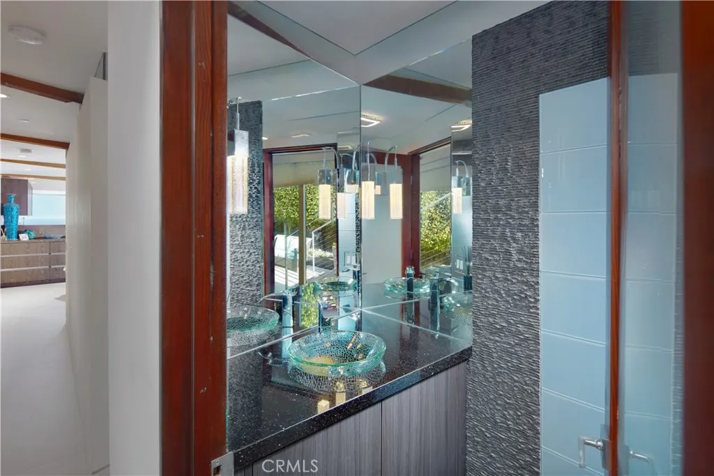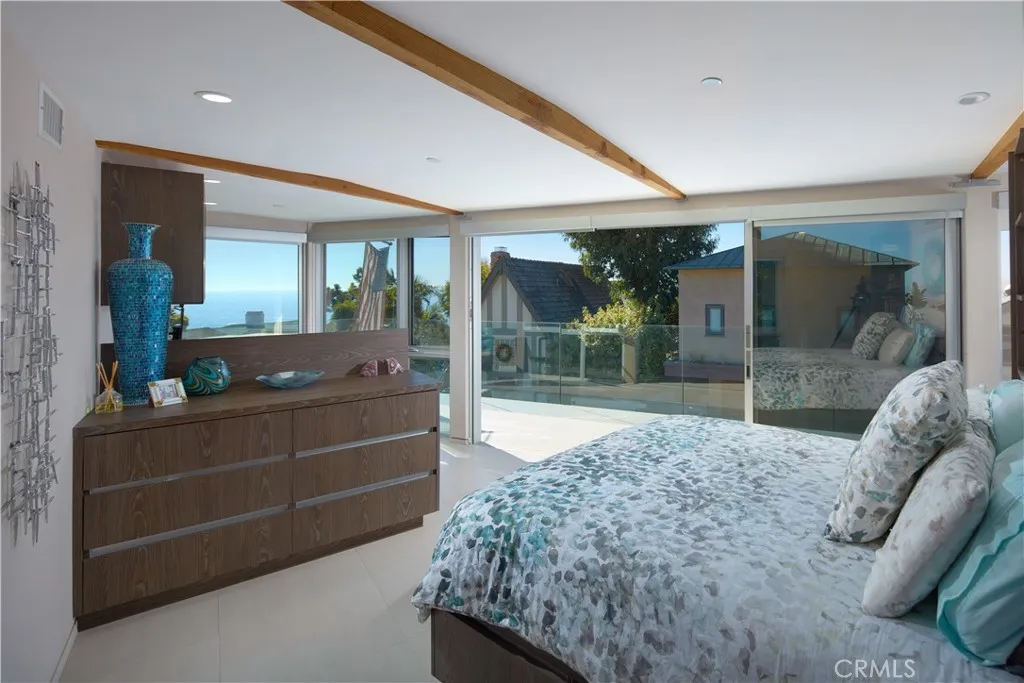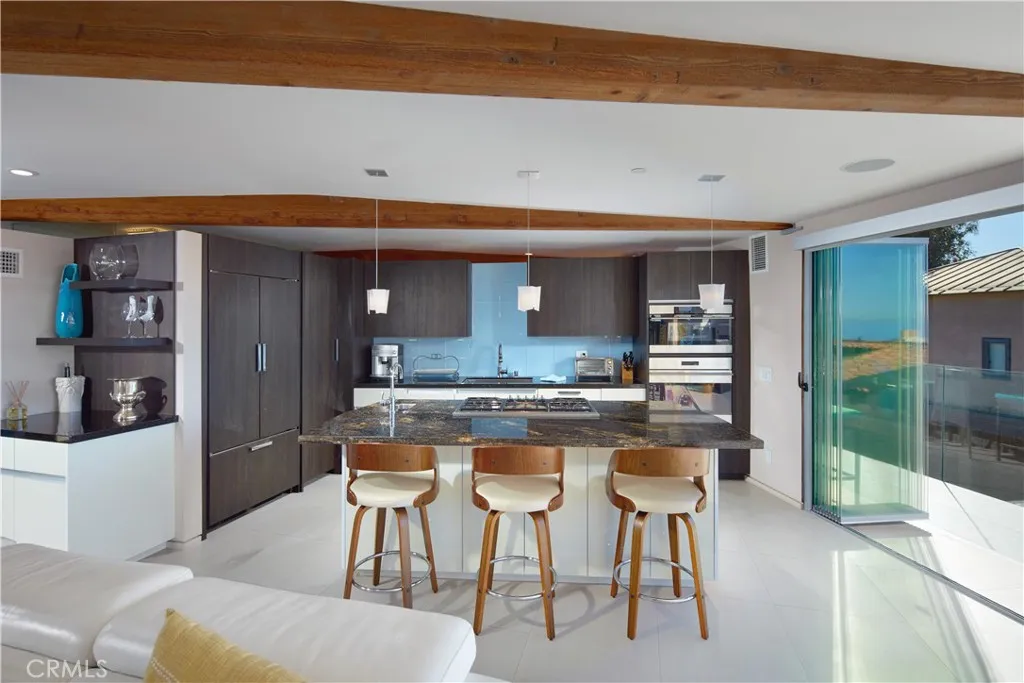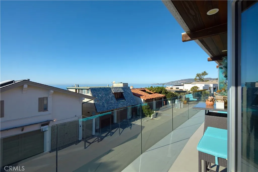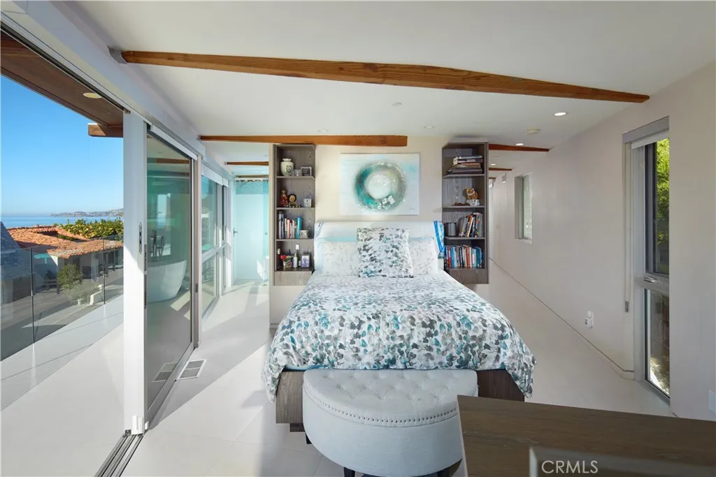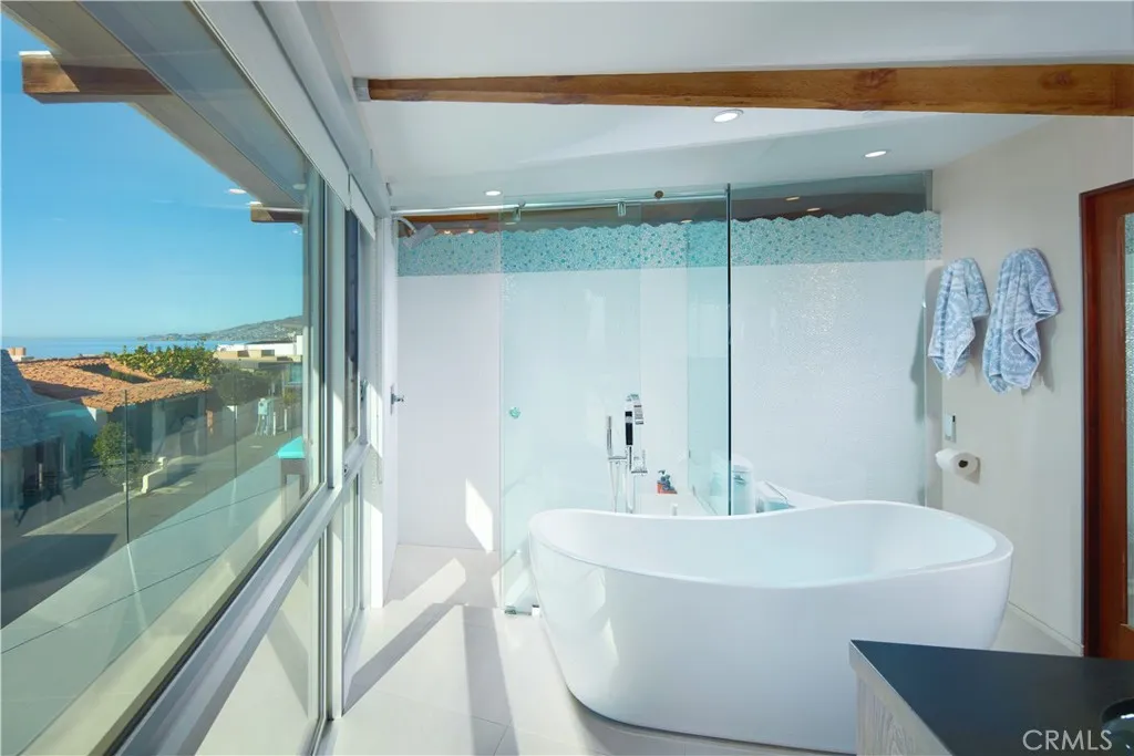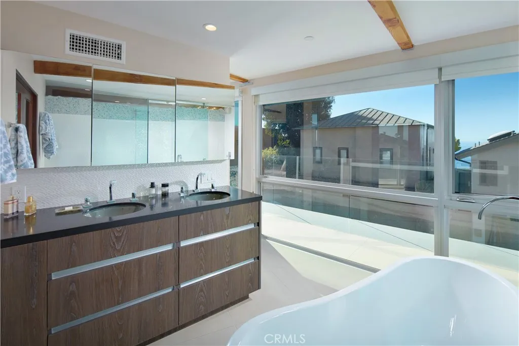 FURNISHED RENTAL. Stylish, remodeled accommodations and awe-inspiring ocean views are enjoyed in equal measure at this Victoria Beach masterpiece. Offering 180-degree ocean vistas, unobstructed Catalina sunsets, and the city lights of North Laguna Beach, this elegant home is a striking example of coastal luxury located just steps from Victoria Beach. Designed by Horst Noppenberger, it seamlessly blends contemporary design with natural, rich materials and bold, modern finishes, creating an ambiance that is both invigorating and inviting. Step inside to discover light-filled, spacious interiors featuring a great room with an 21’ premier folding glass door, exposed-beam ceilings, and floor-to-ceiling windows that open to an approximately 450-square-foot view deck. Granite countertops complement the Thermador cooktop with downdraft, dual Wolf ovens with a steamer oven, and a Sub-Zero refrigerator in the state-of-the-art kitchen. Offering approximately 1,957 square feet of living space, this well-appointed residence features three bedrooms and three-and-a-half bathrooms. The primary suite is enhanced by custom cabinetry, designer closet doors, and granite vanity tops. It also includes an office nook with custom built-ins and two workstations. Seamless porcelain tile flooring runs throughout, adding a touch of elegance to the home. Relish outdoor living with a rooftop deck accessible via dedicated stairs, a rear patio featuring a built-in firepit, and an outdoor shower—ideal for rinsing off after long, sunny days at the beach. Storage solutions abound in the three-car garage, outfitted with epoxy flooring, custom cabinets, a workbench, and overhead shelving. Thoughtfully upgraded to meet modern structural codes, the property boasts a newer electrical panel, fiber optic cable service, LED lighting, dual-zone HVAC, a tankless water heater, perimeter security wiring, and a newer fire sprinkler system.