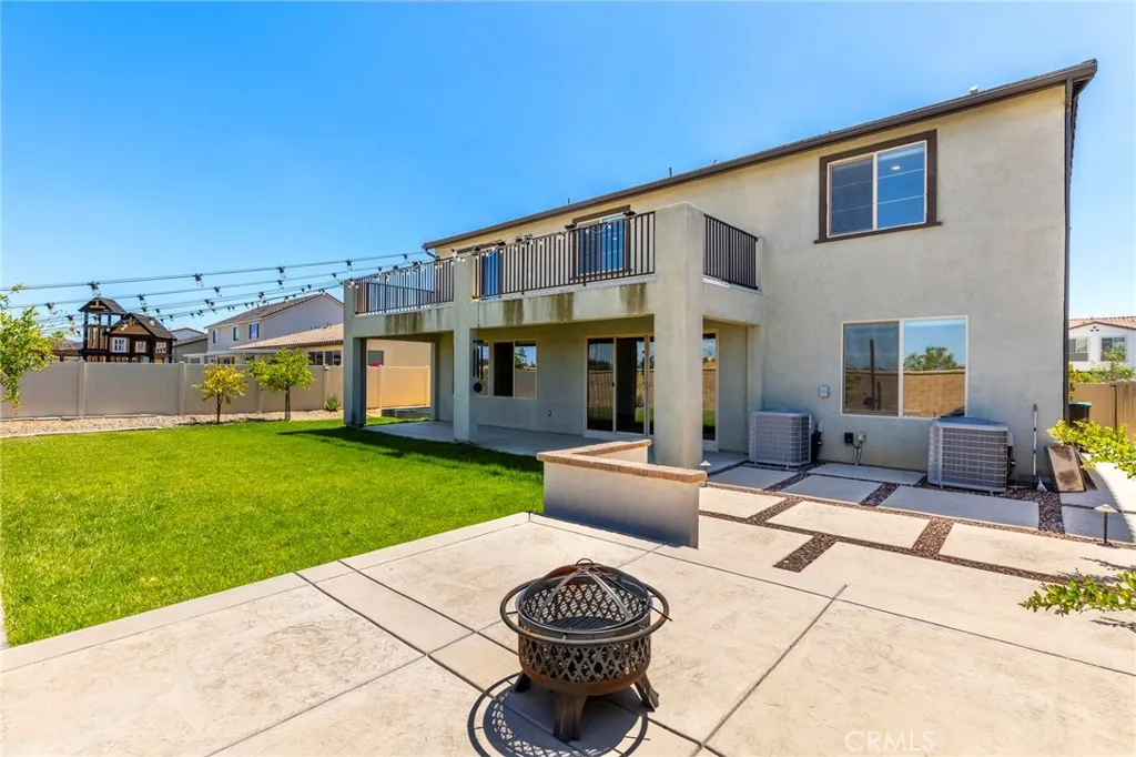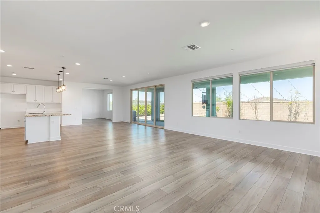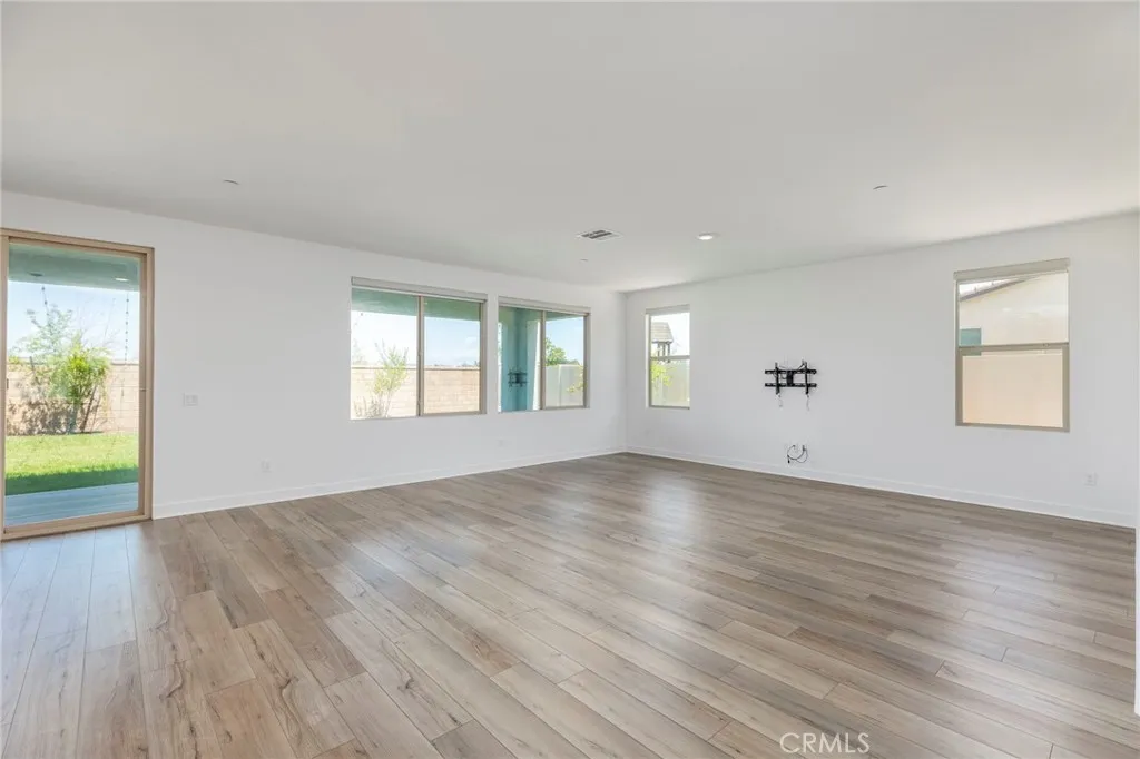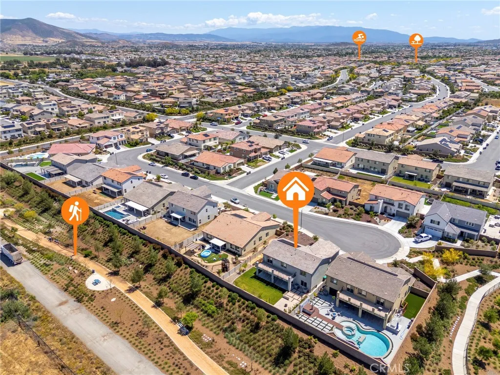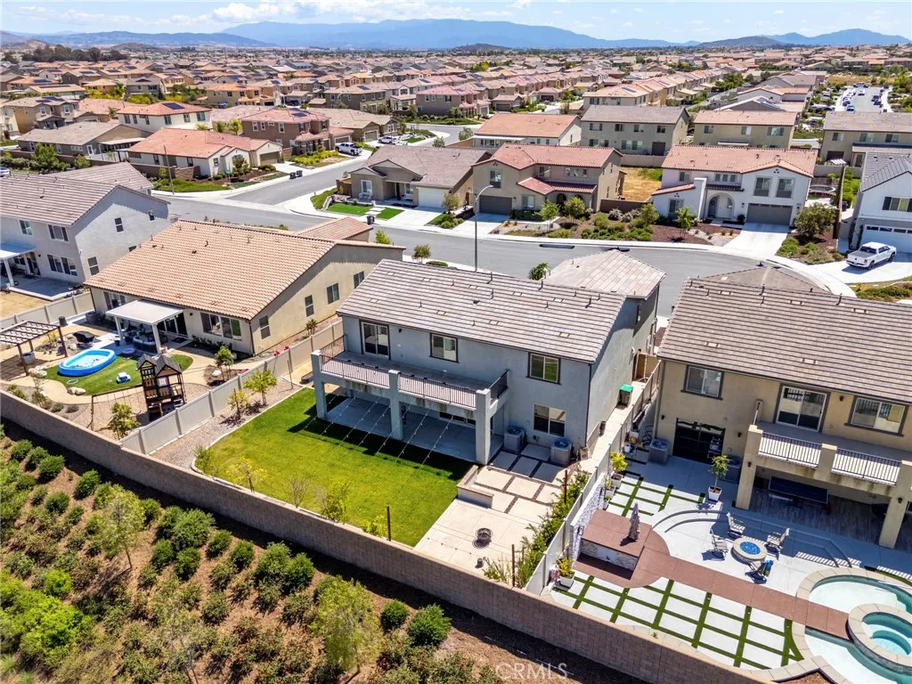 Built in 2021, this stunning Tri Pointe Home sits on a spacious 8,712 square foot cul-de-sac lot with no rear neighbors and beautiful views! The popular Magnolia floor plan features five bedrooms, including a convenient guest suite on the main level, three bathrooms PLUS a flex room adjacent to the kitchen PLUS an upstairs loft. Upon entering through the charming covered porch, you are greeted by a grand two-story entryway with an open rail staircase. The main level continues into an expansive great room with Luxury Vinyl Plank flooring and a 12-foot center-open sliding glass door that seamlessly blends indoor and outdoor living. The gourmet kitchen is a chef's dream, boasting white shaker-style cabinetry, gorgeous custom granite and quartz countertops, and a large island with seating for three. Stainless steel appliances, an undermount single-basin sink, and elegant pendant lighting complete the space. Tucked just off the kitchen is a versatile flex room perfect for a home office or playroom. The second level offers a spacious loft situated near the primary bedroom suite, which overlooks breathtaking mountain views. The primary en suite bathroom provides a spa-like experience with two separate vanities, custom tile flooring, a walk-in shower with a seat, and a generous walk-in closet. Three additional bedrooms, a third full bathroom, and a dedicated laundry room with a sink and storage shelves are located down the hall. High-tech upgrades are found throughout the home including motorized smart blinds, a tankless hot water heater, LED lighting, Whole House Fan and fully OWNED SOLAR panels. Outdoor living is elevated by a double-length balcony that provides significant shade for the backyard patio below. The yard offers multiple areas for seating or lawn games, along with ample room to build a custom pool. Living in Spencer’s Crossing grants access to world-class amenities including three resort-style pools, a spa, sports parks, scenic walking trails, and a clubhouse. This home is located near top-rated schools, premier shopping including the new Costco, upscale dining, and the 215 freeway. Come see this exceptional property today!