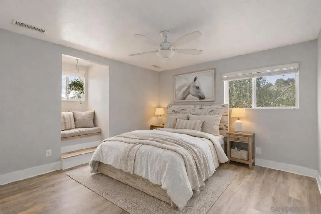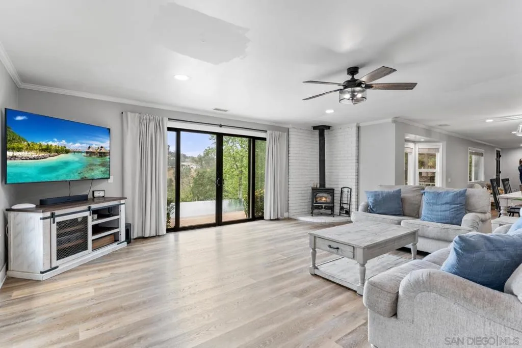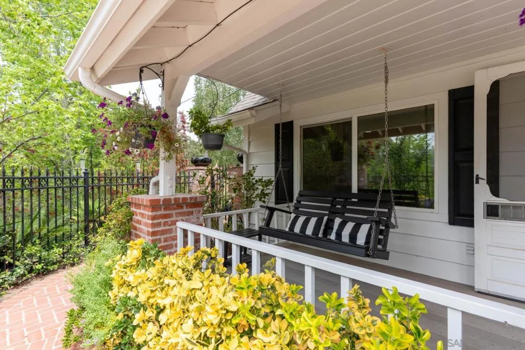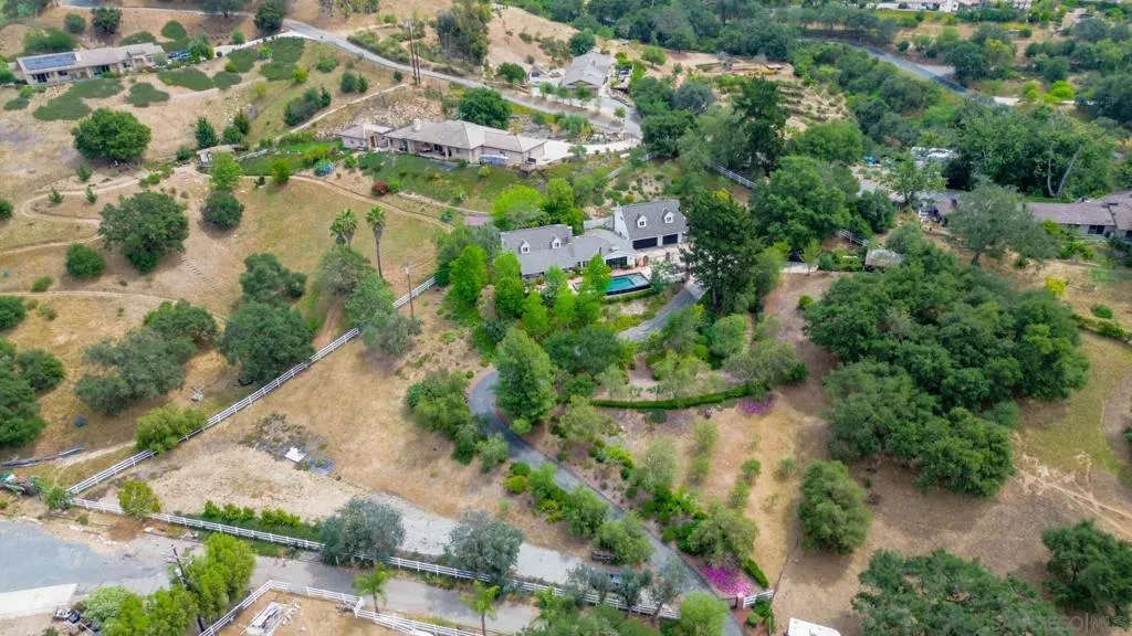 Tucked behind a gated entry, this storybook Fallbrook property unfolds across 1.62 acres, offering 5 bedrooms, 4.5 bathrooms, and 3,270 square feet of thoughtfully updated living space. Blending charm, character, and functionality, the home is designed for both everyday comfort and effortless entertaining. A long private drive sets a peaceful tone on arrival, while the fully fenced grounds provide space for animals, gardening, or simply enjoying the open setting. The main residence features an updated kitchen with white Café appliances, a walk-in pantry, and seamless flow into the living and dining areas. Warm wood flooring, a wood-burning stove, and expansive windows create a welcoming atmosphere throughout. The primary suite is conveniently located on the main level, with additional bedrooms upstairs offering flexibility for a variety of living needs. A detached guest house with its own kitchen provides a private retreat ideal for extended family, guests, or multi-generational living. The outdoor spaces are where this property truly shines. A charming covered porch, mature landscaping, and winding garden pathways create a storybook setting, while the property is designed for entertaining with an infinity edge pool, spa, outdoor kitchen, and multiple seating areas. Decks, patios, and garden spaces offer peaceful places to relax and take in the surroundings. Mountain views, RV parking, and versatile outdoor space complete this unique offering, combining charm, privacy, and lifestyle in a highly desirable Fallbrook location.