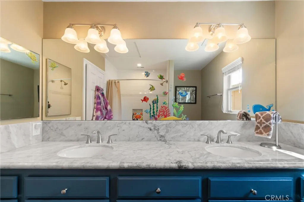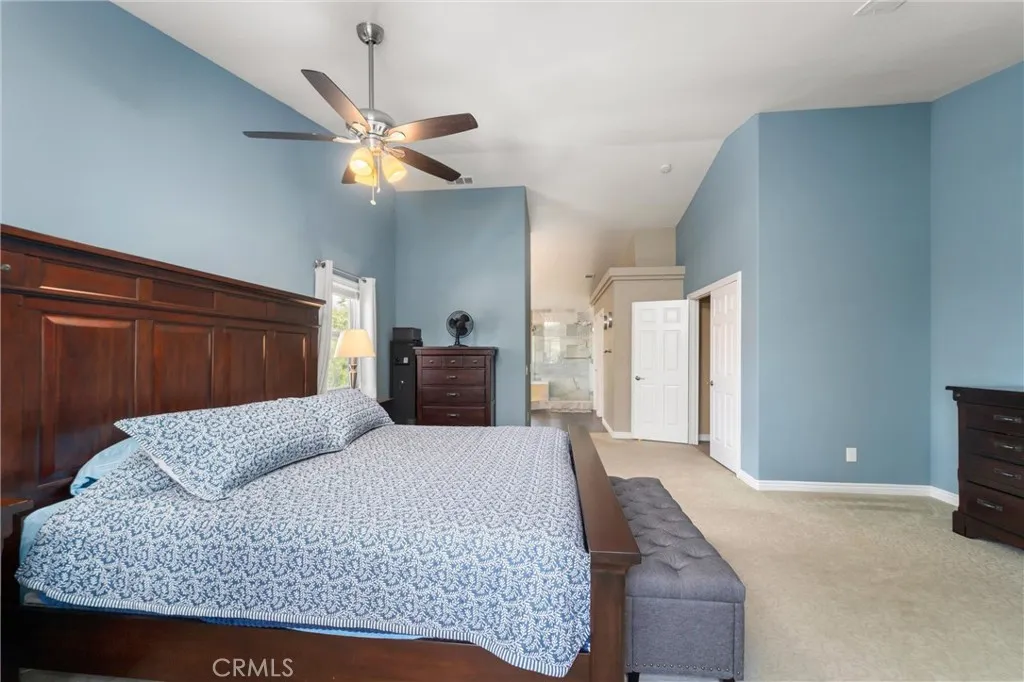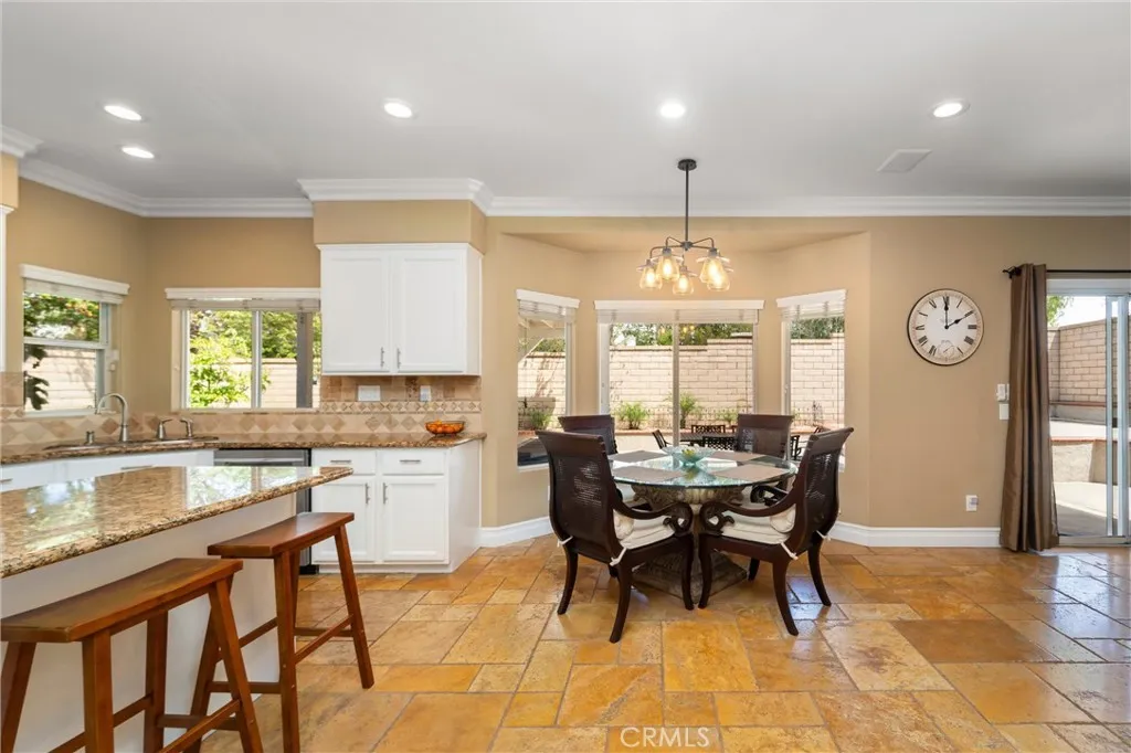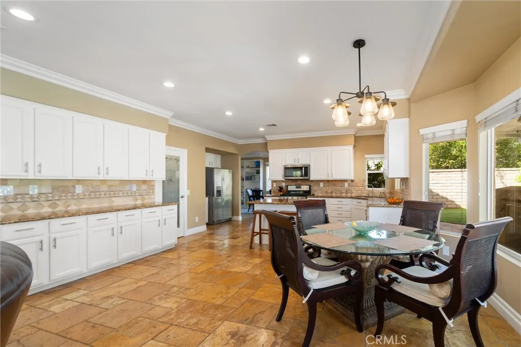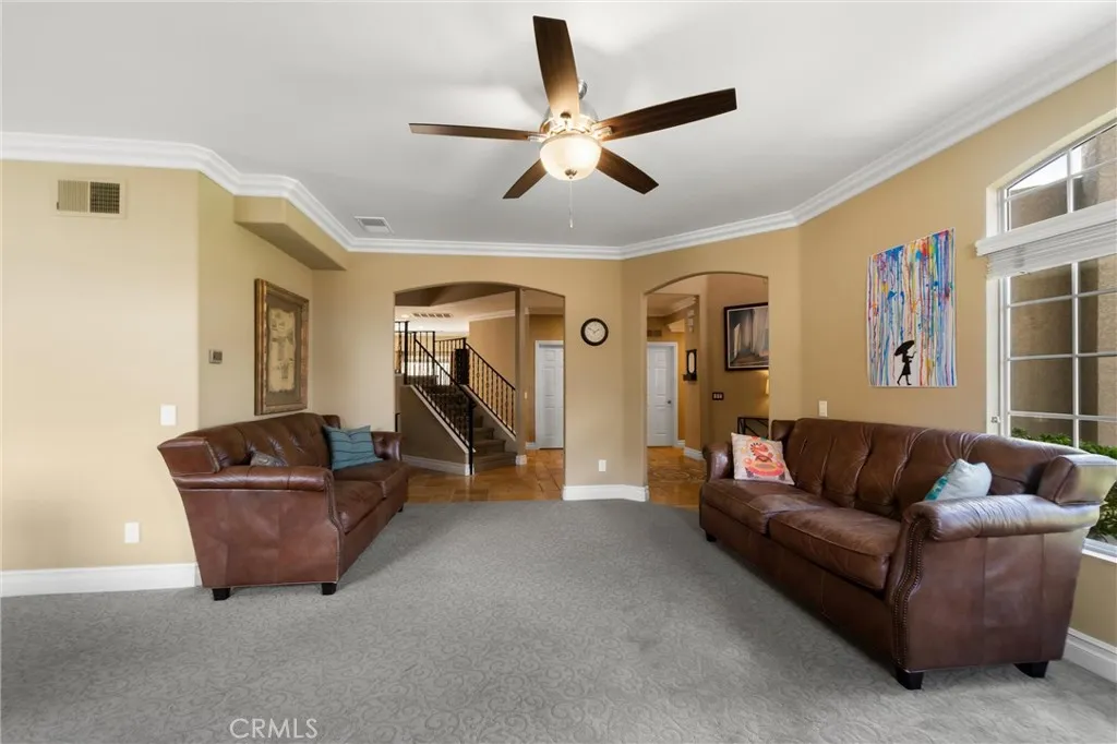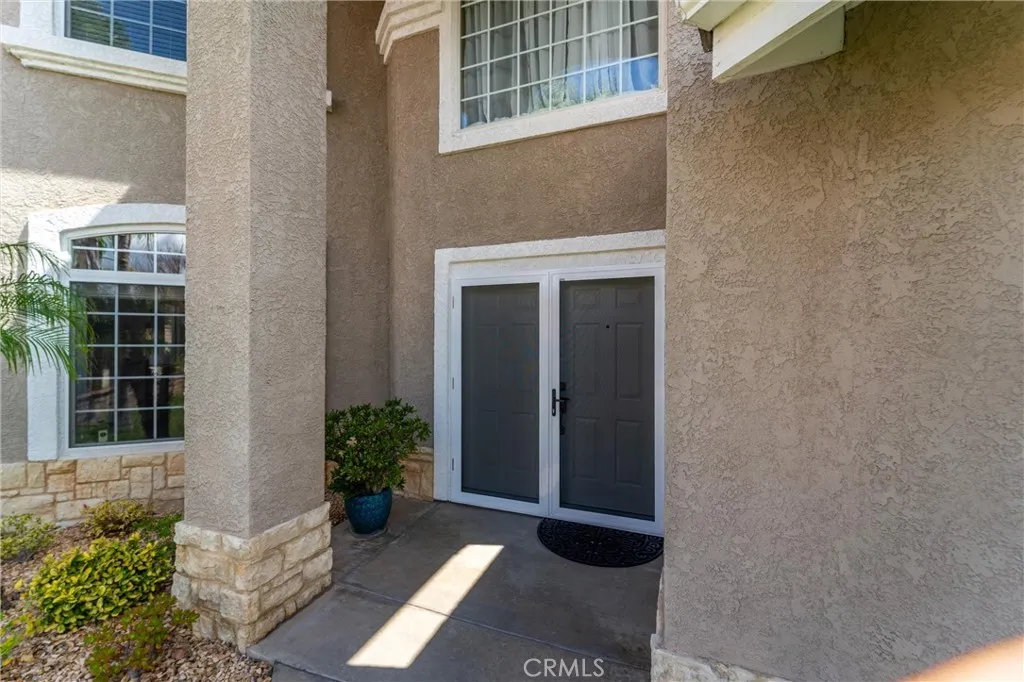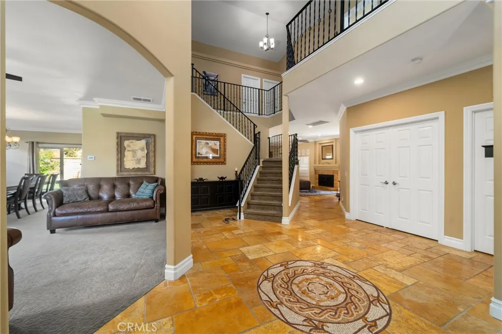 Beautifully maintained and significantly upgraded two-story single-family home offering 3,195 square feet of well-designed living space on a 7,405-square-foot (0.17-acre) lot in an established Corona neighborhood. Built in 1997, the home includes 4 bedrooms, 2.5 bathrooms, a 3-car garage, and a wood-burning fireplace. Recent major improvements include a fully owned solar system approx. 5.2 Kw, a nearly brand-new air conditioning system and a complete PEX re-pipe throughout the home deliver energy efficiency, year-round comfort, and long-term peace of mind. The entry opens to a dramatic two-story foyer finished in travertine tile with a custom mosaic medallion and a wrought-iron staircase. The adjacent formal living and dining rooms feature arched windows, crown molding, chandelier lighting, and sliding-glass access to the backyard. The family room centers on a stone-surround fireplace with built-in display niches and opens directly into the kitchen, which is finished with granite counters, white cabinetry, stainless-steel appliances, a tumbled-stone backsplash, and a center island with seating. A walk-in pantry sits behind an etched-glass door, and a bay-window breakfast nook overlooks the yard. Upstairs, the primary suite features high ceilings and neighborhood/mountain views, with an en-suite bath finished in marble counters, a deep soaking tub, a frameless-glass walk-in shower, and dual walk-in closets. Connected by an open air balcony/hallway, three additional bedrooms and a full bathroom complete the spacious upstairs living space. Outside, professional landscaping, mature palms, and tiered stone retaining walls frame the property, while the side and back yards feature a collection of mature, producing citrus trees and a thriving avocado tree. A concrete-tile roof and attached 3-car garage with vent fan system, complete the exterior. Located in Riverside County with easy access to top-rated Corona schools, shopping, dining, parks, and the 91 and 15 freeways. This home is move-in ready and thoughtfully cared for throughout.