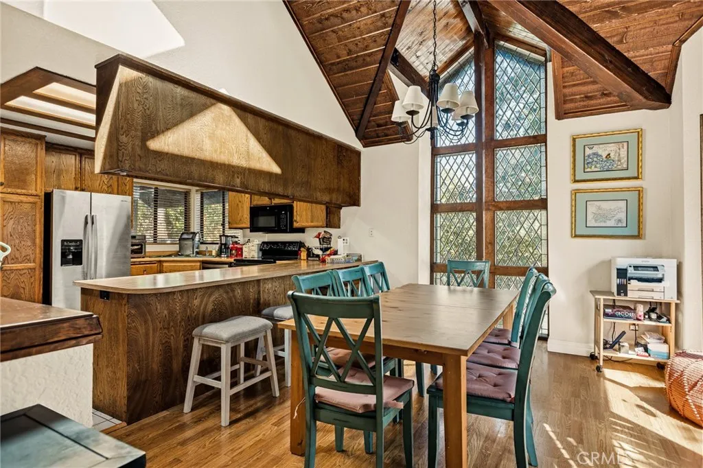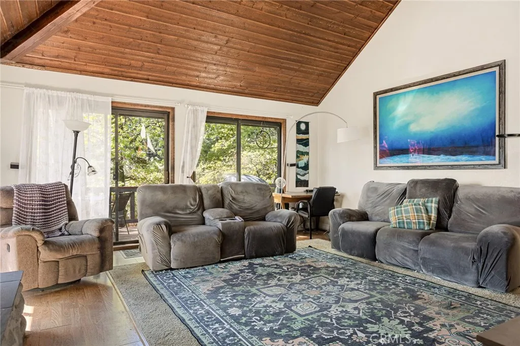 Charming mountain retreat located in the desirable Lake Arrowhead community with lake rights!. This 3-bedroom, 2-bath home offers 1,497 sq ft of living space on a 10,475 sq ft lot, surrounded by trees for a peaceful, private setting. Built in 1984, the home features classic alpine details including vaulted beamed ceilings and tongue-and-groove wood finishes throughout. Newer roof and exterior paint. Main level includes a bedroom and full bath, along with an open-concept living area. Living room is highlighted by a floor-to-ceiling river rock fireplace, creating a warm and inviting focal point. Kitchen offers a breakfast bar and flows into the dining area, ideal for everyday living and entertaining. Property includes an attached 2-car garage with level entry and an extended driveway providing ample additional parking. Enjoy tranquil forested surroundings while being conveniently located near local amenities, recreation, and all that Lake Arrowhead has to offer. Ideal for full-time living, second home, or investment opportunity.