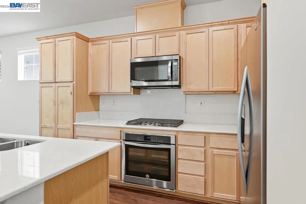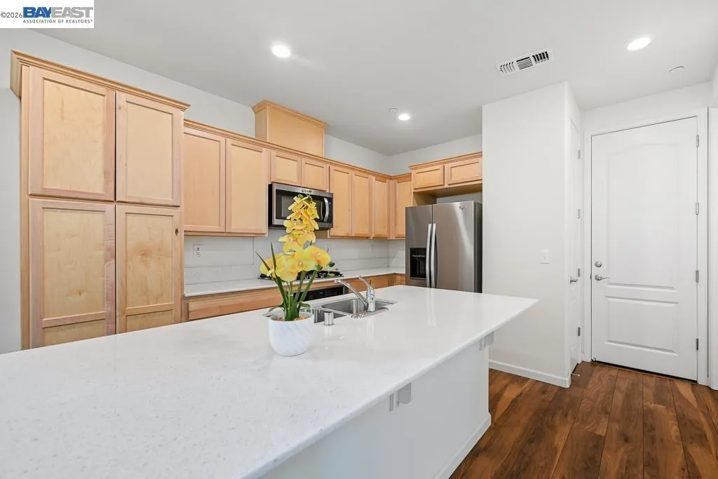 Welcome to this beautifully maintained move-in ready 3-bedroom, 2.5-bath that offers both comfort and charm. Built in 2017, like new & pristine throughout, this home has been lovingly cared for by its original owner. Step inside and be greeted by a truly beautiful gourmet kitchen with a large quartz-topped island, modern cabinetry, built-in stainless steel appliances. and extends throughout the large, bright, great room floorplan perfect for entertaining. The spacious primary bedroom features a sunny balcony and extra-large bathroom with two vanities & large walk in closet. Energy efficient with OWNED solar included in sale. Bright and airy with high ceilings, tankless water heater and attached garage. Prime commuter location close to BART station, Hwy 92/880, San Mateo Bridge and Chabot College, and just minutes to Southland Mall for great dining and shopping, newly developed Eden Shores complex and downtown Hayward. Greenwood Park is just few minutes’ walk from your front door! This turnkey home blends comfort, style, and location seamlessly. ABSOLUTE MUST SEE!