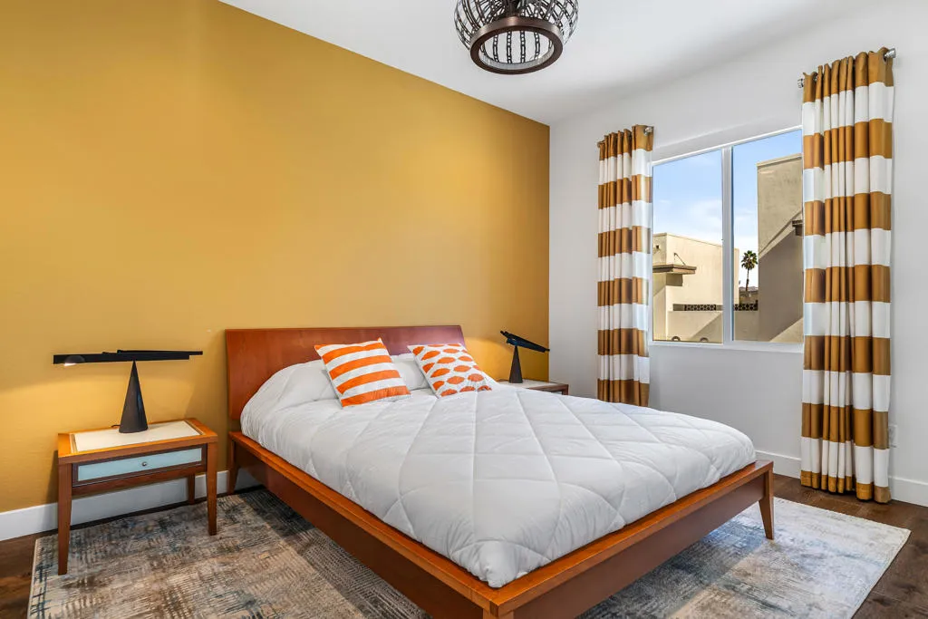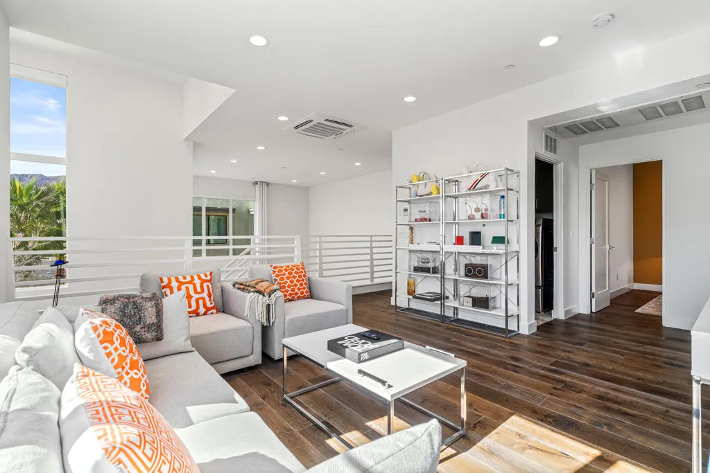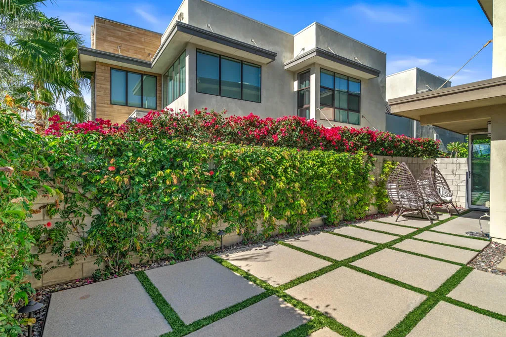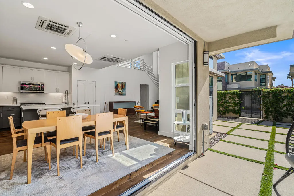 Where the cool people live...VIBE!Step into elevated desert living with this highly upgraded Plan 2 residence in the iconic Vibe community. Framed by breathtaking San Jacinto Mountain views and peek-a-boo vistas of the Bob Hope hillside in Southridge, this home delivers style, sophistication, and that unmistakable Palm Springs energy.Inside, every detail has been curated. Dakota flooring flows seamlessly through the main living areas and stairs, while Calacatta porcelain tile elevates the bathrooms and laundry space. The expanded chef's kitchen features soft-close cabinetry, sleek solid-surface countertops, and a designer backsplash--perfectly paired with recessed lighting and dimmers throughout.Designed for modern living and effortless entertaining:Wall-to-wall glass and fold-out patio doors create a true indoor-outdoor experiencePre-wired audio, TV smurf loops, and upgraded lighting enhance functionalityElectronic blinds provide instant comfort, privacy, and energy efficiencyRetreat to a luxurious primary suite featuring designer wallpaper, a frameless floor-to-ceiling shower, and polished chrome finishes. Guests will appreciate the upgraded walk-in shower and refined finishes throughout.Enjoy multiple outdoor spaces including a private front courtyard ideal for evening gatherings, plus a spacious balcony off the primary suite--your own serene escape under the desert sky.And the ultimate bonus: owned solar, delivering modern efficiency with long-term value.This is more than a home--it's a lifestyle. Welcome to Vibe.