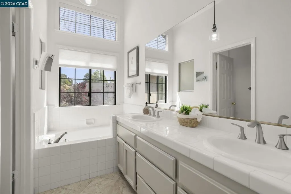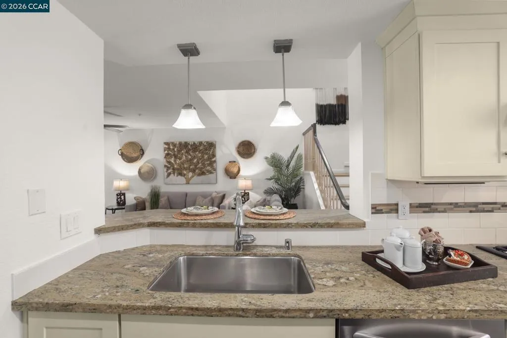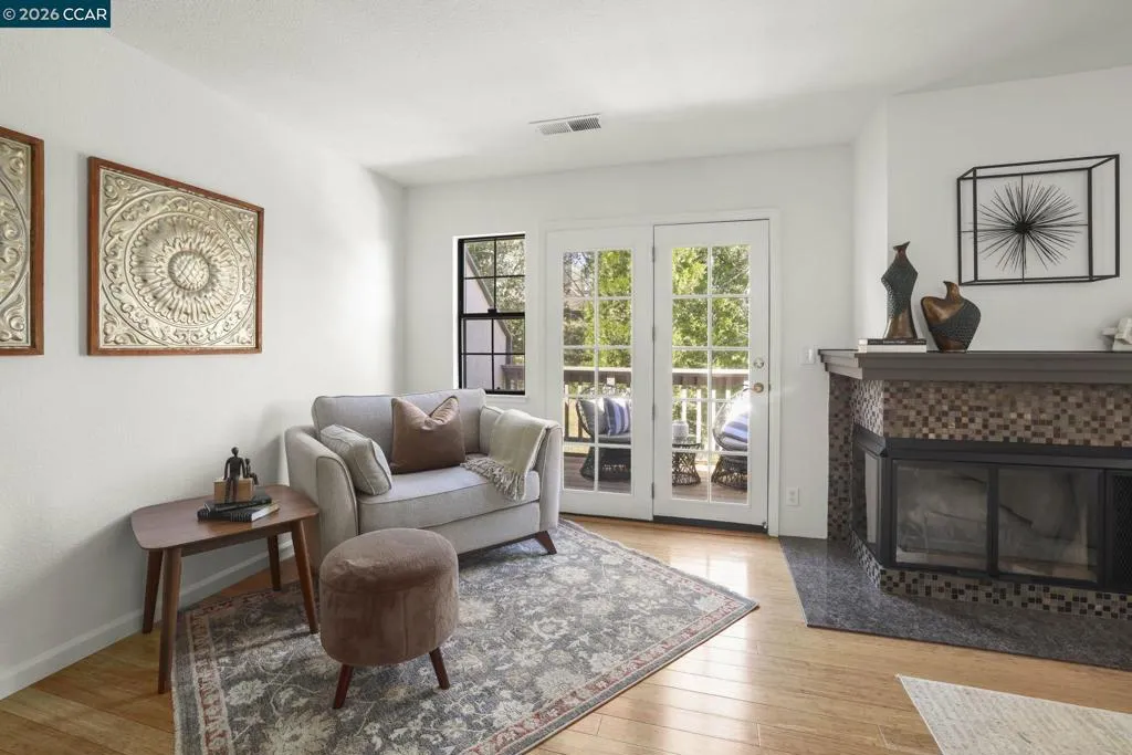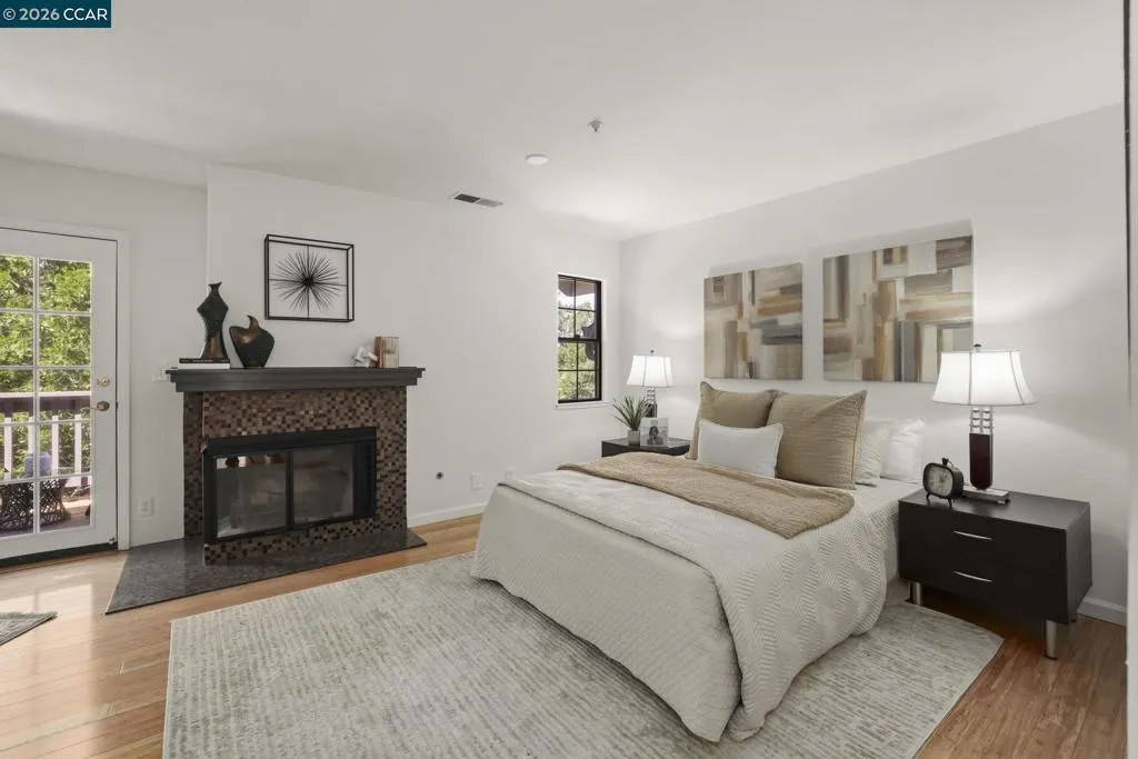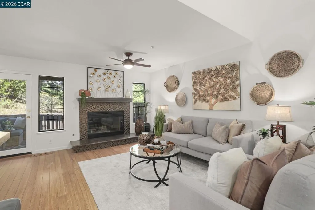 A Gem in the 40 unit sought-after Haslemere Condo Complex, surrounded by open space, provides views of the rolling Briones hills, Carquinez Strait, and Mt. Diablo from various points of the complex and community pool. This well-designed floor plan features 3 bedrooms and 3 full baths, including a flexible main-level bedroom or den (no closet). Upstairs, a junior ensuite bedroom, and a primary suite spanning the rear of the home featuring French doors to a private balcony, fireplace, dual vanities, soaking tub, separate shower and a sitting area designed for relaxation. The main living areas offer a welcoming fireplace and French doors that open to a private deck—ideal for indoor-outdoor living. The kitchen includes a gas range, granite counters, beverage refrigerator, bar seating, formal dining and a casual eating area in kitchen. Additional features include a two-car garage, central heating & air conditioning, & access to a community pool. Views: Carquinez