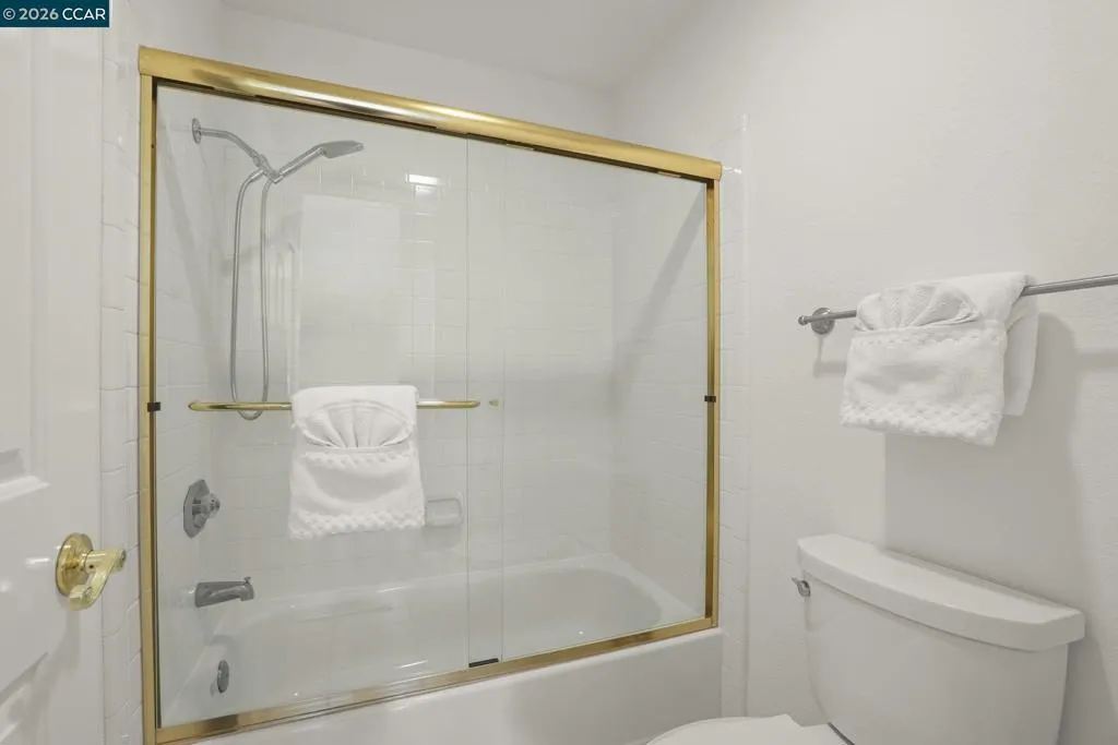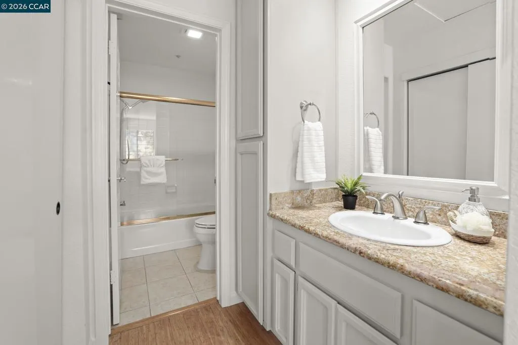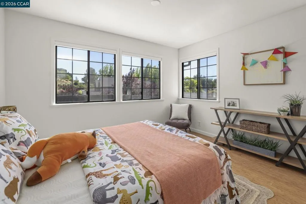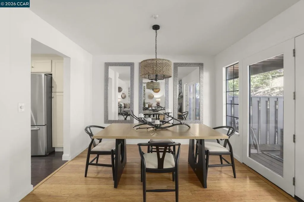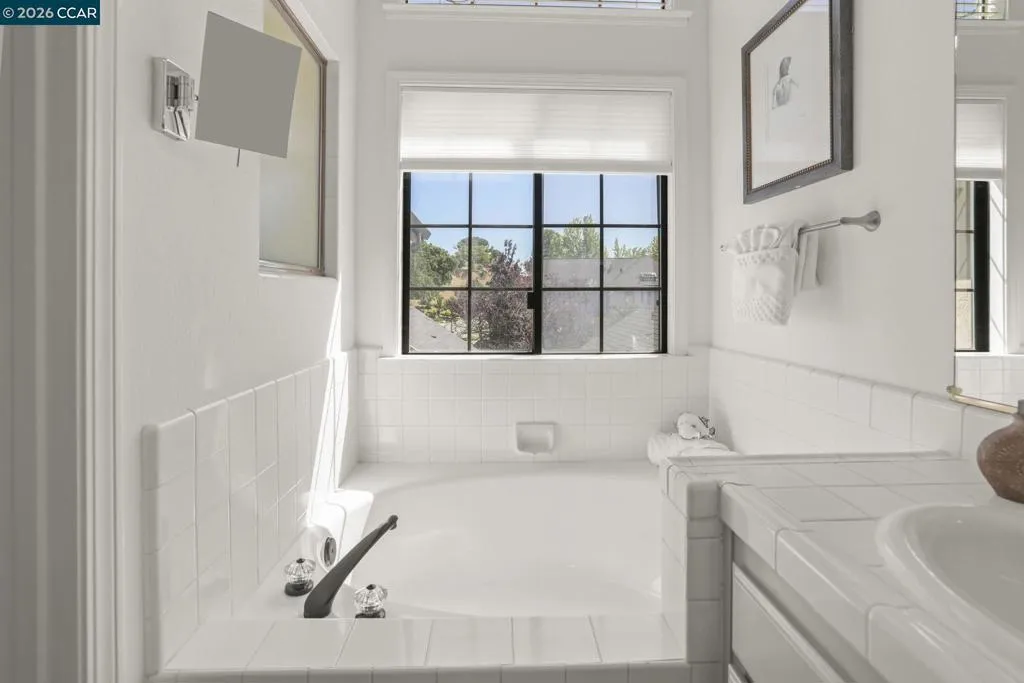 A Gem in the 40 unit sought-after Haslemere Condo Complex, surrounded by open space, provides views of the rolling Briones hills, Carquinez Strait, and Mt. Diablo from various points of the complex and community pool. This well-designed floor plan features 3 bedrooms and 3 full baths, including a flexible main-level bedroom or den (no closet). Upstairs, a junior ensuite bedroom, and a primary suite spanning the rear of the home featuring French doors to a private balcony, fireplace, dual vanities, soaking tub, separate shower and a sitting area designed for relaxation. The main living areas offer a welcoming fireplace and French doors that open to a private deck—ideal for indoor-outdoor living. The kitchen includes a gas range, granite counters, beverage refrigerator, bar seating, formal dining and a casual eating area in kitchen. Additional features include a two-car garage, central heating & air conditioning, & access to a community pool. Views: Carquinez