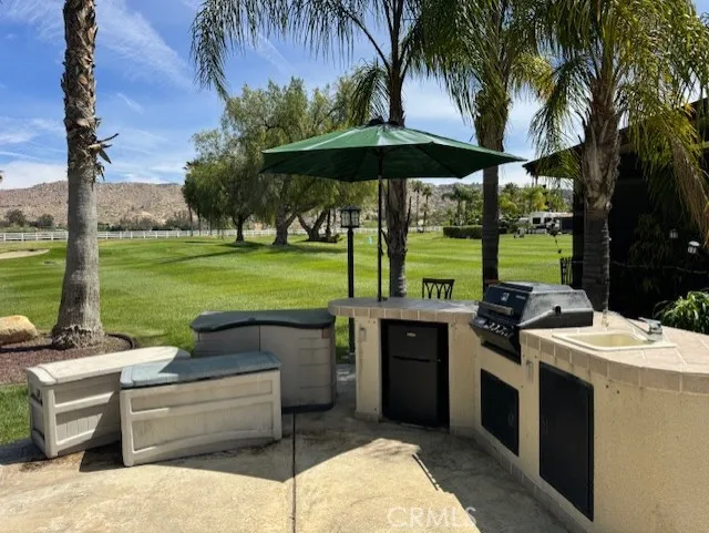 Site 124 offers beautiful panoramic views of the 13th hole of the golf course, tranquil pond, and water fountain, all set against a stunning mountain backdrop. This inviting property is designed for outdoor living and entertaining, featuring a built-in BBQ, refrigerator, and spacious island area. Extended concrete provides additional room for gatherings, patio furnishings, or extra storage. Mature trees line the property, adding charm, shade, and privacy. Ideally located near the clubhouse and owners pool/spa, this premium site combines scenic beauty with convenient access to resort amenities. Located within Rancho California RV Resort, a gated and 24/7 guard-controlled community offering resort-style amenities including a 14-hole executive golf course (free for owners with unlimited use), 5 pools and multiple jacuzzi areas, tennis courts, pickleball courts, dog park, horseshoe lawn, laundry facilities, hiking trails, clubhouse, on-site restaurant, and market. HOA includes water, sewer, trash, and common area maintenance. Bring your Class A, Super C, or 5th wheel and enjoy resort-style living in one of Southern California’s premier RV communities. Financing available.