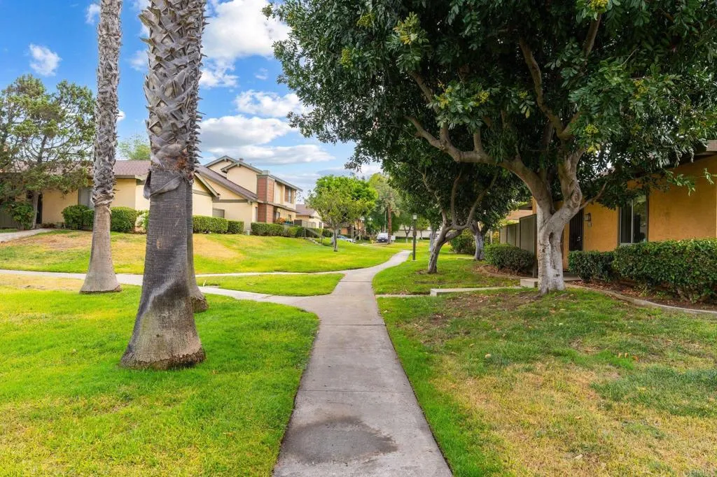 Upgraded 2 bedroom, 2 bath home in the desirable Mesa Village neighborhood of Mira Mesa. Surrounded by lush greenbelts and set along a peaceful, palm tree-lined walkway, this home offers a sense of privacy and open space. Inside, you’ll find a bright and spacious living area with laminate flooring, recessed lighting, and a cozy fireplace with a stone surround. Large windows fill the home with natural light and showcase serene greenery views. The functional layout includes two well-sized bedrooms and two full bathrooms. An attached 2 car carport provides convenient parking as well as an additional oversized storage closet. Residents of Mesa Village enjoy access to a community pool and spa, beautifully maintained grounds, and scenic paths. Ideally located between the 805 and 15 freeway and close to shopping, grocery stores, and dining. **Owner will provide washer, dryer and refrigerator - not show in photos but on order. **