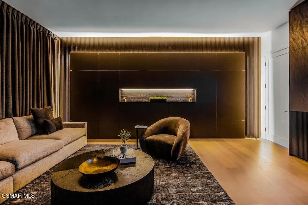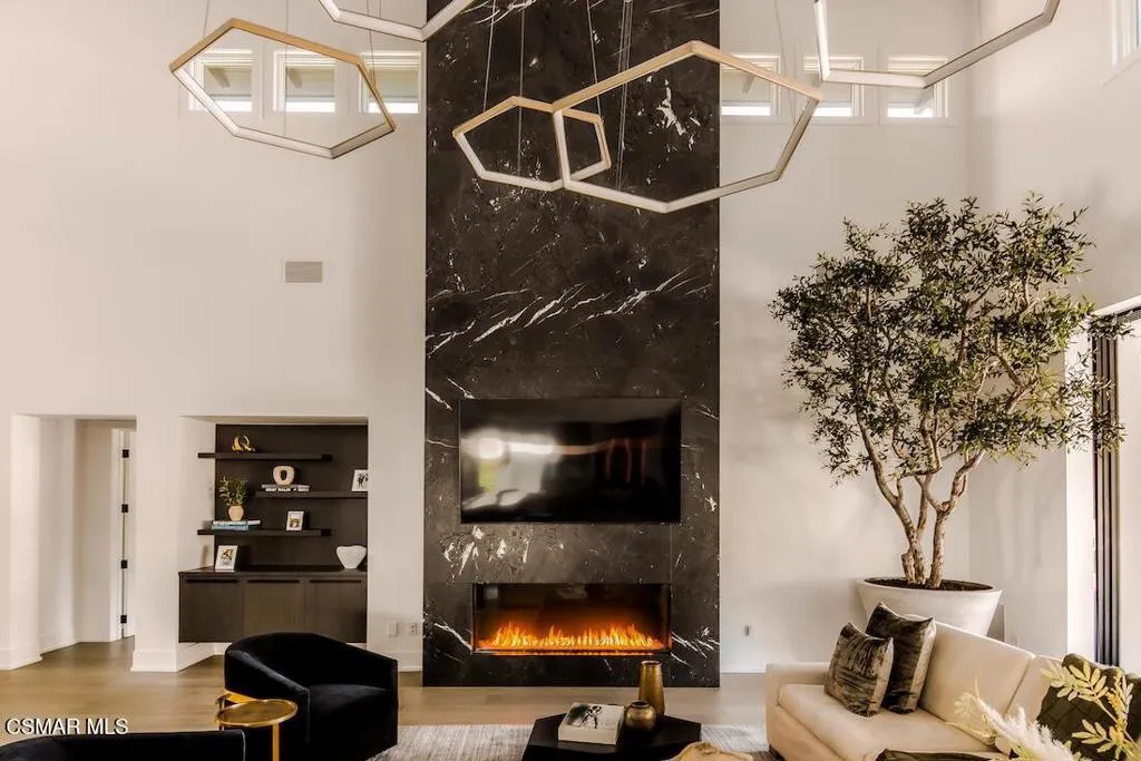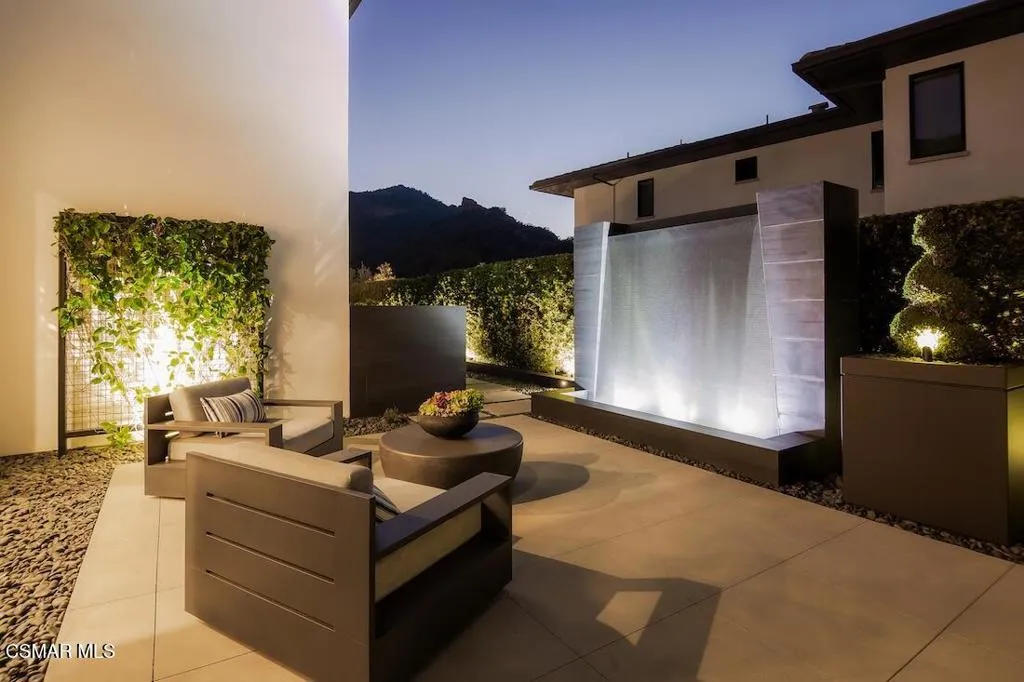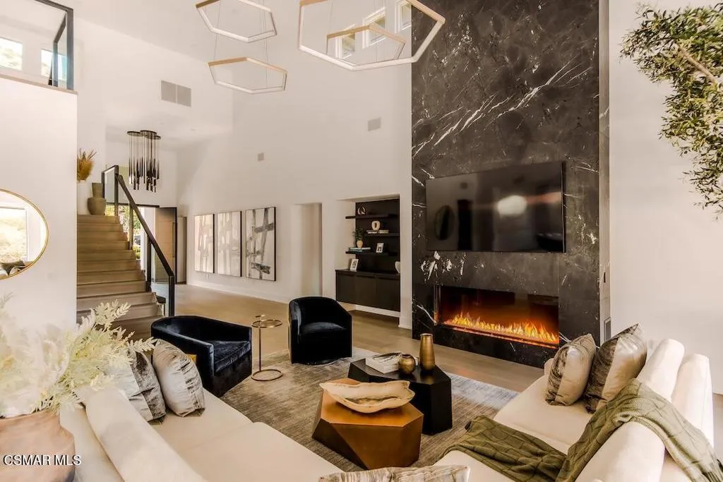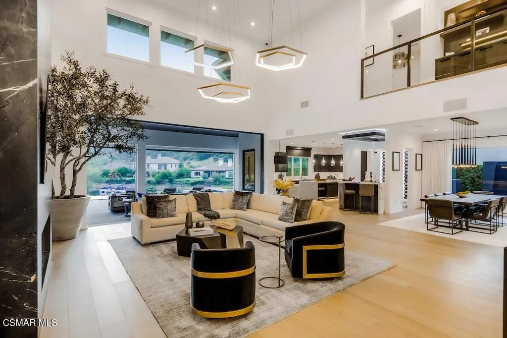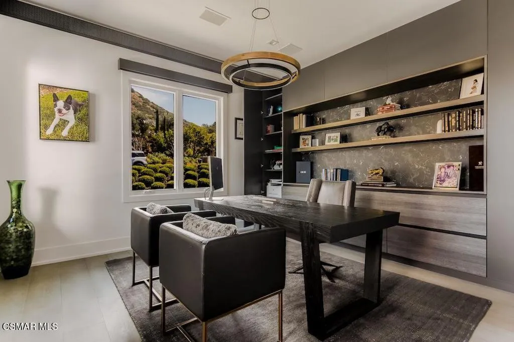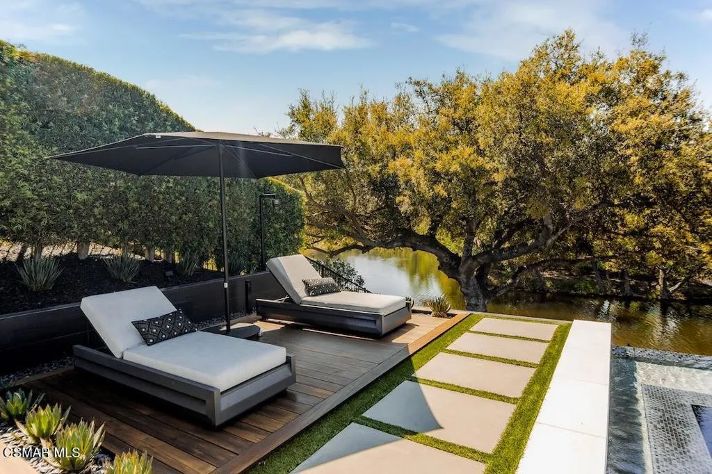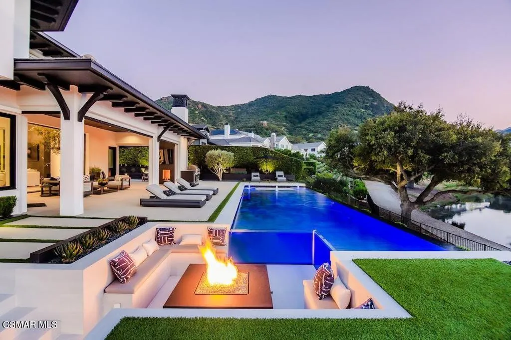Located on the coveted shoreline of Lake Sherwood within one of Southern California's most exclusive guard-gated communities, this exceptional lakefront estate blends modern architecture, privacy, and refined luxury with sweeping water views and a private dock. Meticulously maintained and completely move-in ready, the home offers an extraordinary lakeside lifestyle.A dramatic basalt driveway leads to a floating walkway with custom scuppers, creating a tranquil arrival defined by the soothing sound of water. Inside, soaring ceilings and expansive pocket doors open seamlessly to a spectacular outdoor setting featuring an approximately 53-foot infinity-edge pool and spa with multiple water jets and a commercial-grade heater. A striking recessed fire pit lounge with acrylic glass offers captivating views directly into the pool, enhancing the home's seamless indoor-outdoor entertaining experience overlooking the lake.The great room is anchored by a dramatic 20-foot black marble fireplace wall, serving as a bold architectural centerpiece, while the residence features three fireplaces, adding warmth and ambiance throughout.The main-level primary suite is a private retreat, complete with a linear fireplace, heated floors, a spa-inspired steam shower, and dual custom closets with integrated LED lighting and glass shelving.The home is fully integrated with Savant smart home technology, including a Savant intercom system, Lutron lighting, electric shades throughout the interior and select exterior spaces, under-cabinet LED lighting, and comprehensive interior and exterior security cameras. A premium Sonos audio system provides seamless, high-quality sound throughout both the interior and exterior living spaces. A large Tesla solar system with backup batteries further enhances energy efficiency.