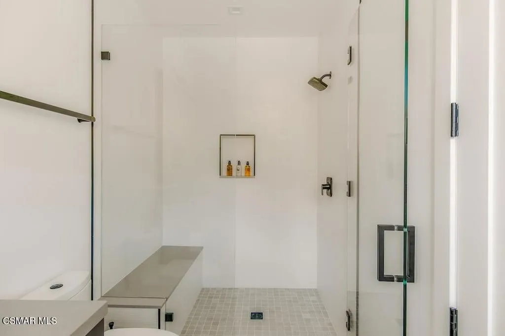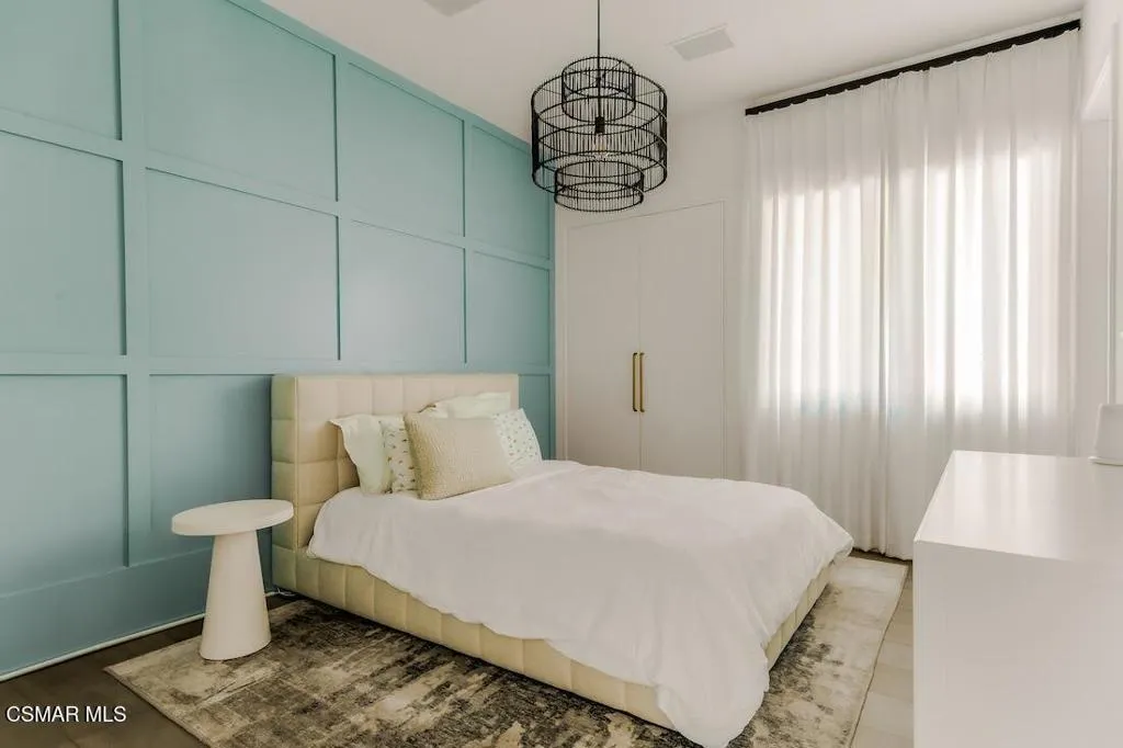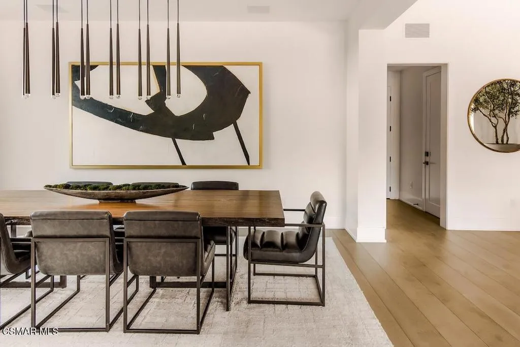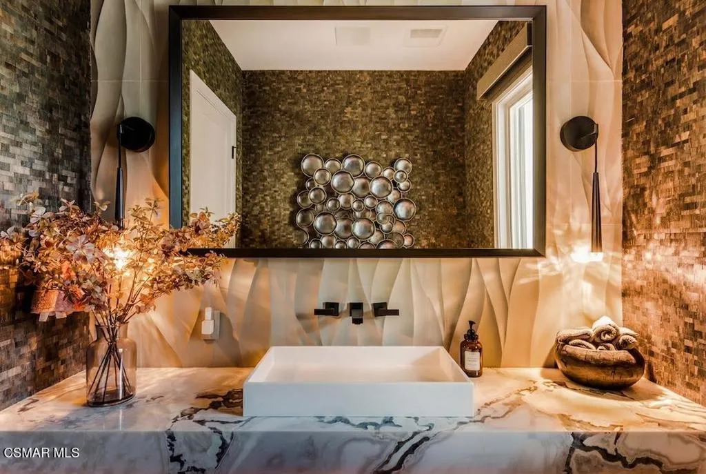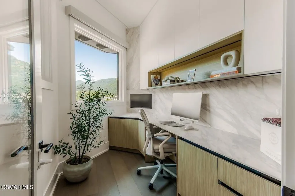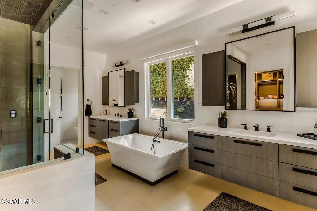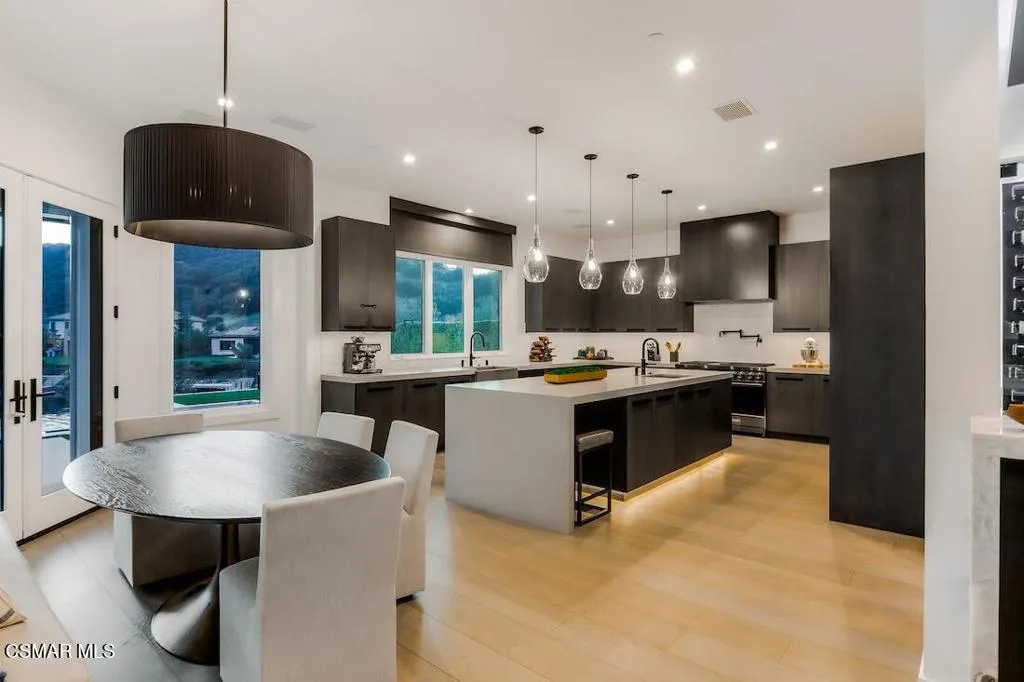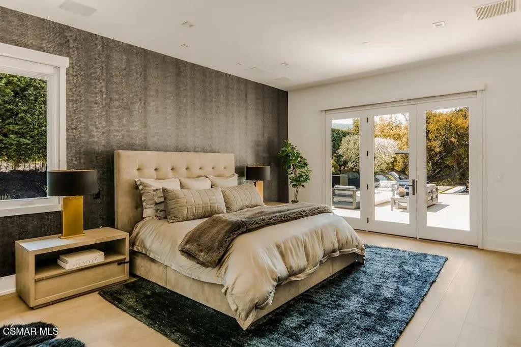 Located on the coveted shoreline of Lake Sherwood within one of Southern California's most exclusive guard-gated communities, this exceptional lakefront estate blends modern architecture, privacy, and refined luxury with sweeping water views and a private dock. Meticulously maintained and completely move-in ready, the home offers an extraordinary lakeside lifestyle.A dramatic basalt driveway leads to a floating walkway with custom scuppers, creating a tranquil arrival defined by the soothing sound of water. Inside, soaring ceilings and expansive pocket doors open seamlessly to a spectacular outdoor setting featuring an approximately 53-foot infinity-edge pool and spa with multiple water jets and a commercial-grade heater. A striking recessed fire pit lounge with acrylic glass offers captivating views directly into the pool, enhancing the home's seamless indoor-outdoor entertaining experience overlooking the lake.The great room is anchored by a dramatic 20-foot black marble fireplace wall, serving as a bold architectural centerpiece, while the residence features three fireplaces, adding warmth and ambiance throughout.The main-level primary suite is a private retreat, complete with a linear fireplace, heated floors, a spa-inspired steam shower, and dual custom closets with integrated LED lighting and glass shelving.The home is fully integrated with Savant smart home technology, including a Savant intercom system, Lutron lighting, electric shades throughout the interior and select exterior spaces, under-cabinet LED lighting, and comprehensive interior and exterior security cameras. A premium Sonos audio system provides seamless, high-quality sound throughout both the interior and exterior living spaces. A large Tesla solar system with backup batteries further enhances energy efficiency.