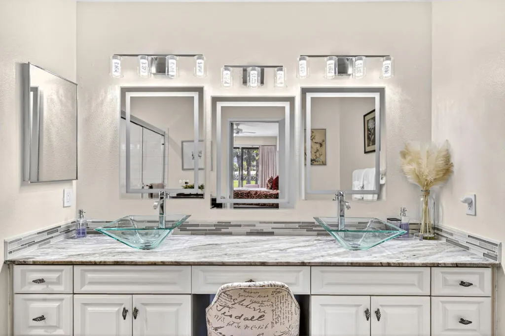 Welcome to an exceptional residence in the prestigious Palmer Private community at PGA West, showcasing the highly sought-after Champion 2 floor plan with sweeping panoramic views of the 3rd and 4th fairways. Offering 2 bedrooms, 2 bathrooms, and 1,549 square feet of thoughtfully designed living space, this home captures the essence of elevated desert living. The expansive outdoor living spaces are designed to fully embrace this extraordinary setting, creating the perfect environment to relax, entertain, and savor the beauty of the desert. Whether enjoying a quiet morning coffee or hosting unforgettable sunset gatherings under clear blue skies, the picturesque golf course setting provides both privacy and an ever-changing backdrop of natural beauty. Inside, the single-level design blends comfort and sophistication, featuring high ceilings and elegant Versailles-pattern travertine flooring throughout. Walls of glass invite natural light to pour in while framing stunning views from nearly every angle, seamlessly connecting indoor and outdoor living. The open-concept living area creates a warm, welcoming atmosphere ideal for both everyday living and refined entertaining. The kitchen is beautifully updated with rich honey-toned cabinetry, granite countertops, and stainless steel appliances--offering both style and functionality. A versatile den/office provides flexibility for guests or a private workspace, while two spacious ensuite bedrooms are thoughtfully positioned on opposite sides of the home, ensuring privacy and comfort for both residents and visitors. The HOA provides extensive coverage, including exterior maintenance, roof, paint, landscaping of all yard areas, irrigation water and equipment, trash service, cable and internet, earthquake insurance, and 24-hour guarded security--allowing for true low-maintenance ownership within one of La Quinta's premier golf communities. Offered furnished and inclusive of a golf cart, this home presents a seamless turnkey opportunity--allowing you to immediately enjoy the luxury lifestyle and world-class amenities that PGA West has to offer.