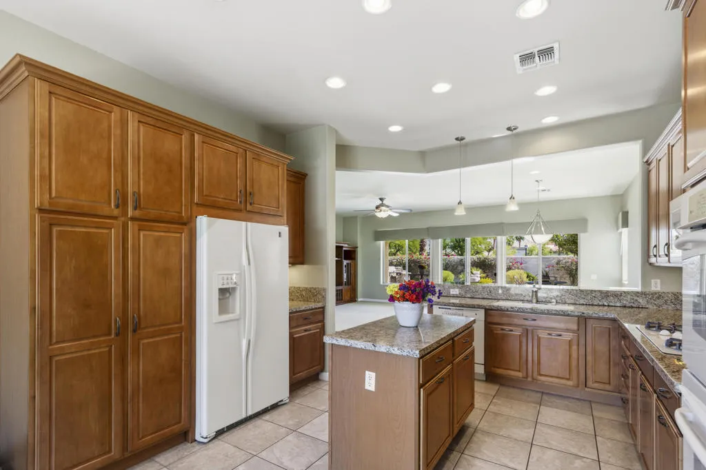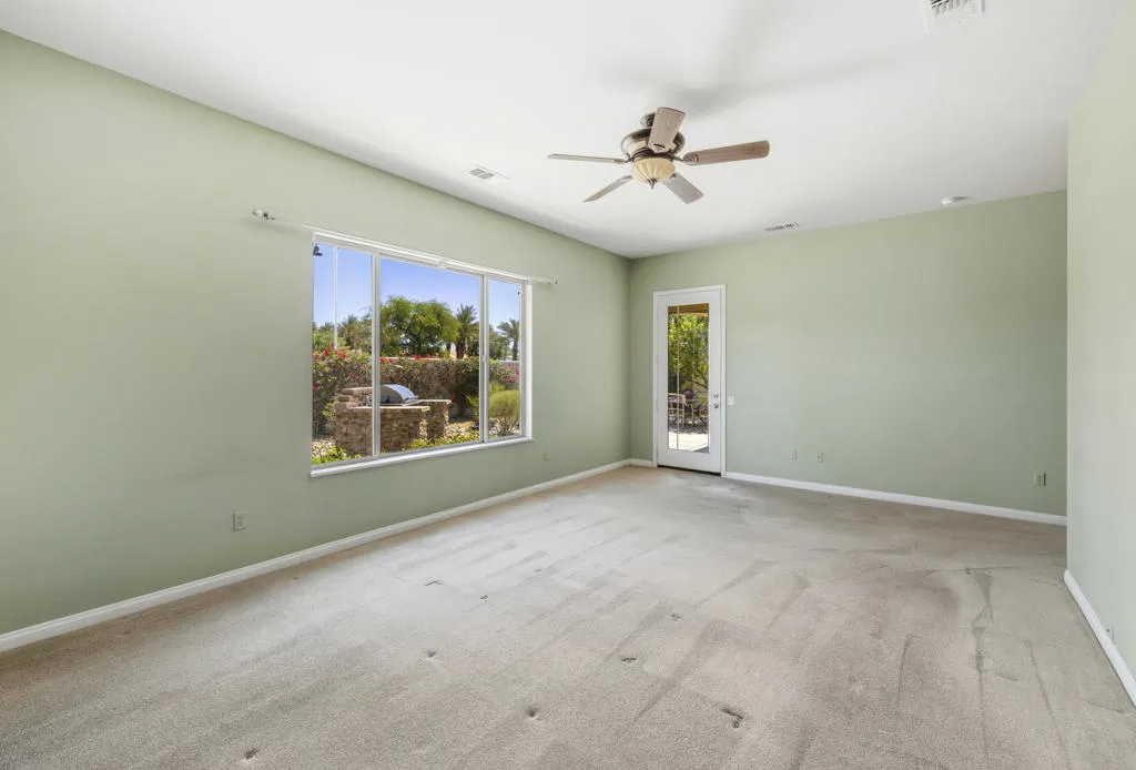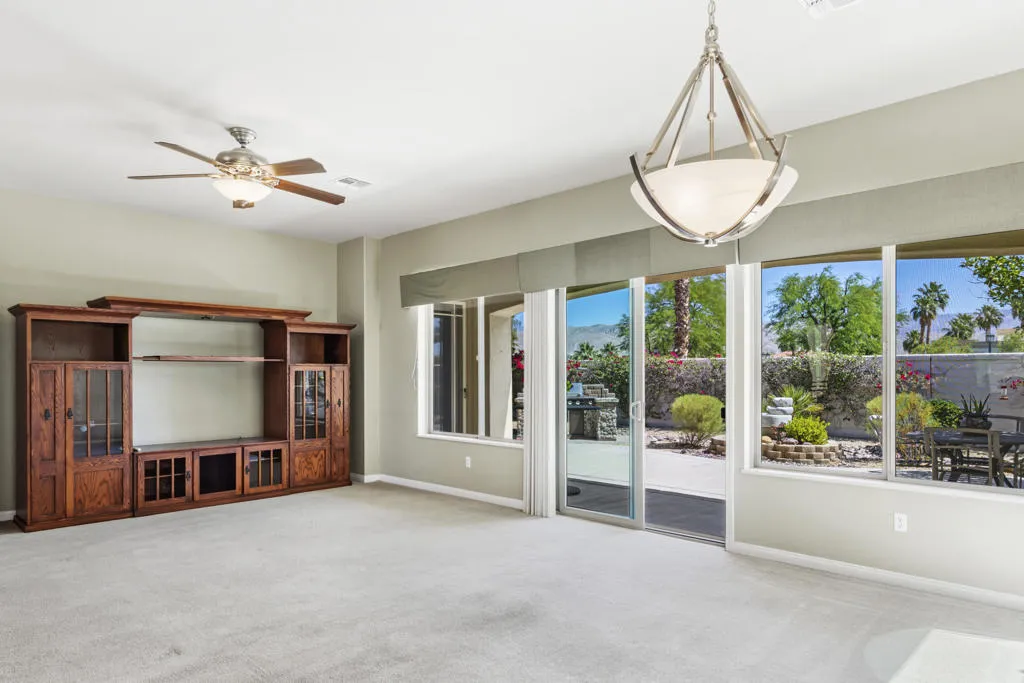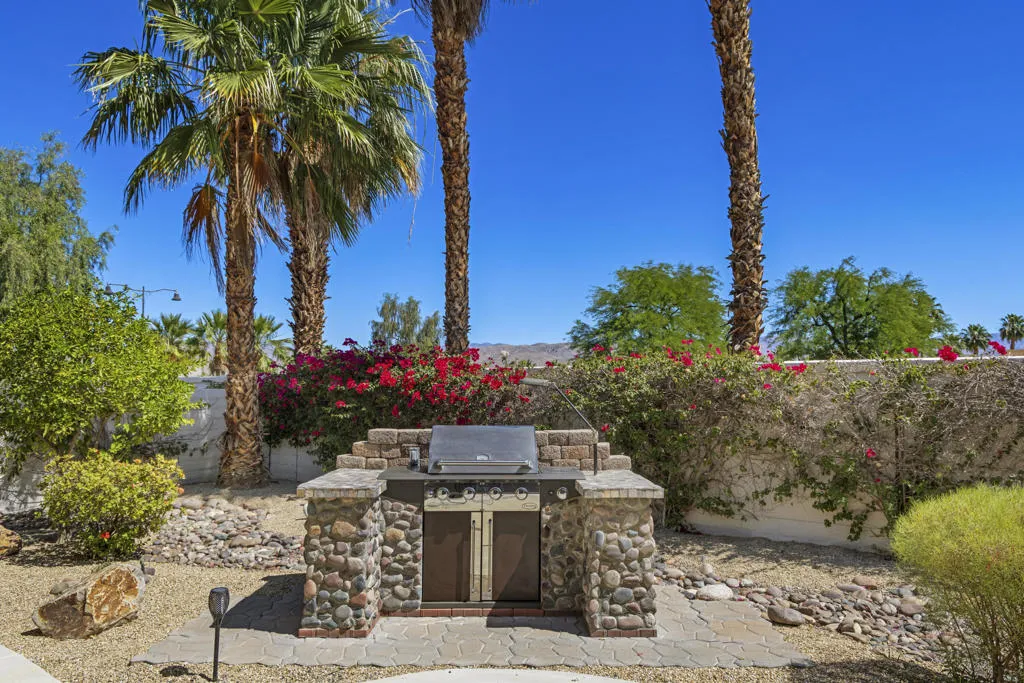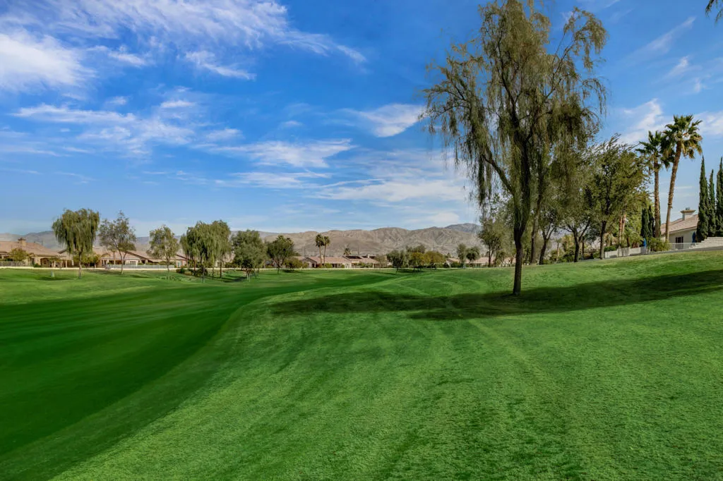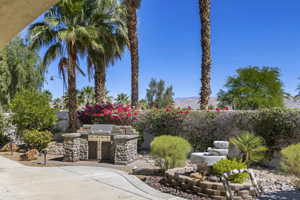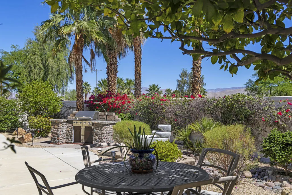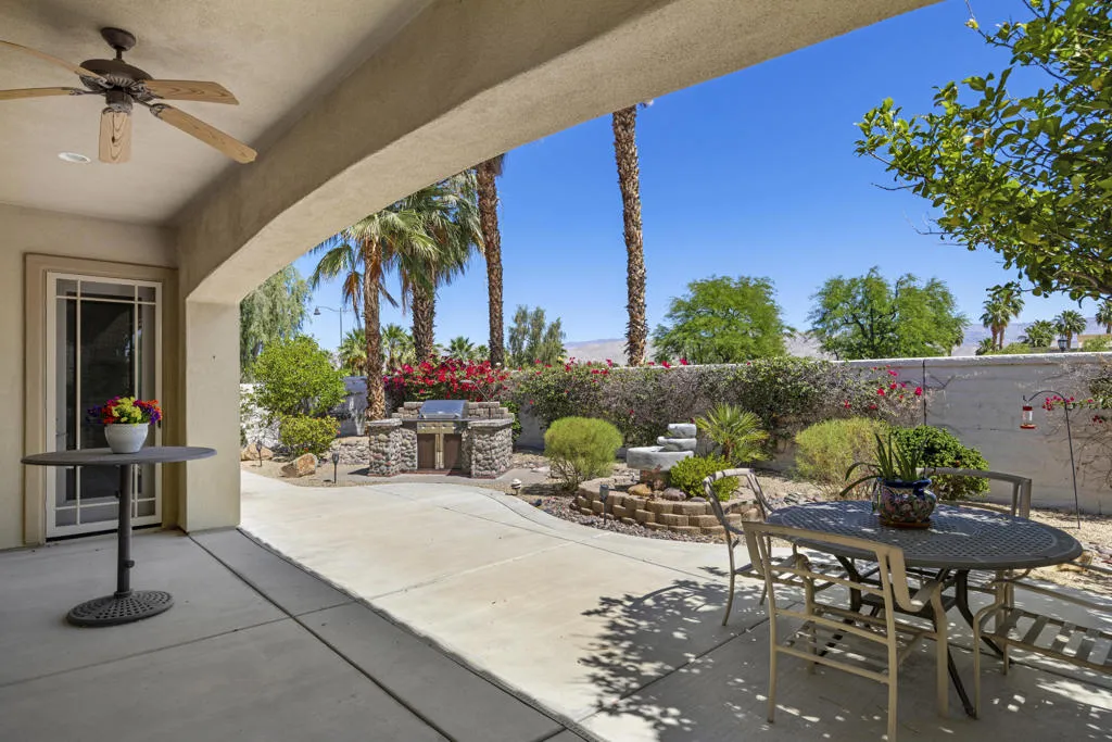 PRICED TO SELL-Don't miss this highly sought-after San Benito model with beautiful views! This spacious home offers an inviting open-concept Great Room featuring an entertainment center cabinet-perfect for relaxing or entertaining. The large primary suite includes direct access to the backyard, while the en-suite bath boasts dual vanities, a soaking tub, separate shower, and a generous walk-in closet. Additional living spaces include a guest bedroom with mirrored doors, a versatile den, bonus room, and a second bathroom-ideal for guests. Ceiling fans are thoughtfully placed throughout the home for added comfort. The well-appointed kitchen is a chef's delight, complete with slab granite countertops, a large center island, double ovens, a five-burner cooktop, built-in microwave, pull-out shelving, and a convenient trash drawer. A bright dining nook with built-in cabinetry provides extra storage and a cozy place to gather. A spacious laundry room with abundant cabinetry and a deep sink leads to the oversized two-car plus golf cart garage, also equipped with built-in storage cabinets. Step outside to your private backyard retreat featuring an extended covered patio, built-in barbeque, and a tranquil water feature-perfect foe enjoying the desert lifestyle. Located in Sun City Shadow Hills, a premier active adult community offering: Two clubhouses, Two fitness centers, a ballroom & activity rooms, a billiard room, Indoor lap pool & outdoor resort-style pools and spas. There are pickleball, tennis & bocce courts, two golf courses(championship & par-3) numerous social clubs and activities. The HOA dues are low and include internet!