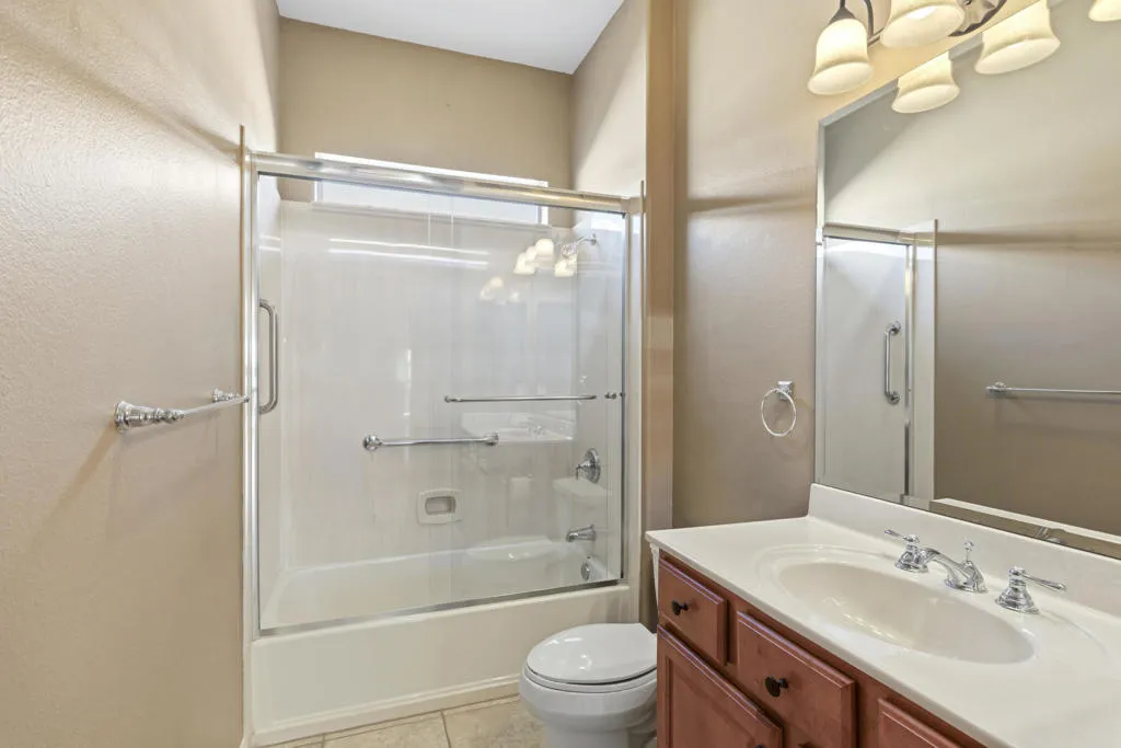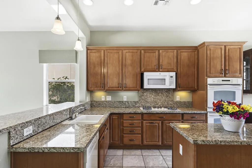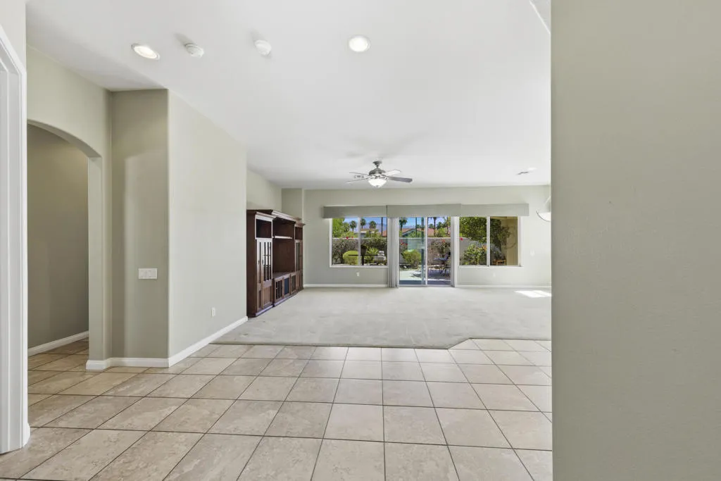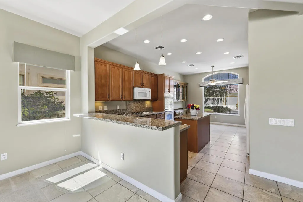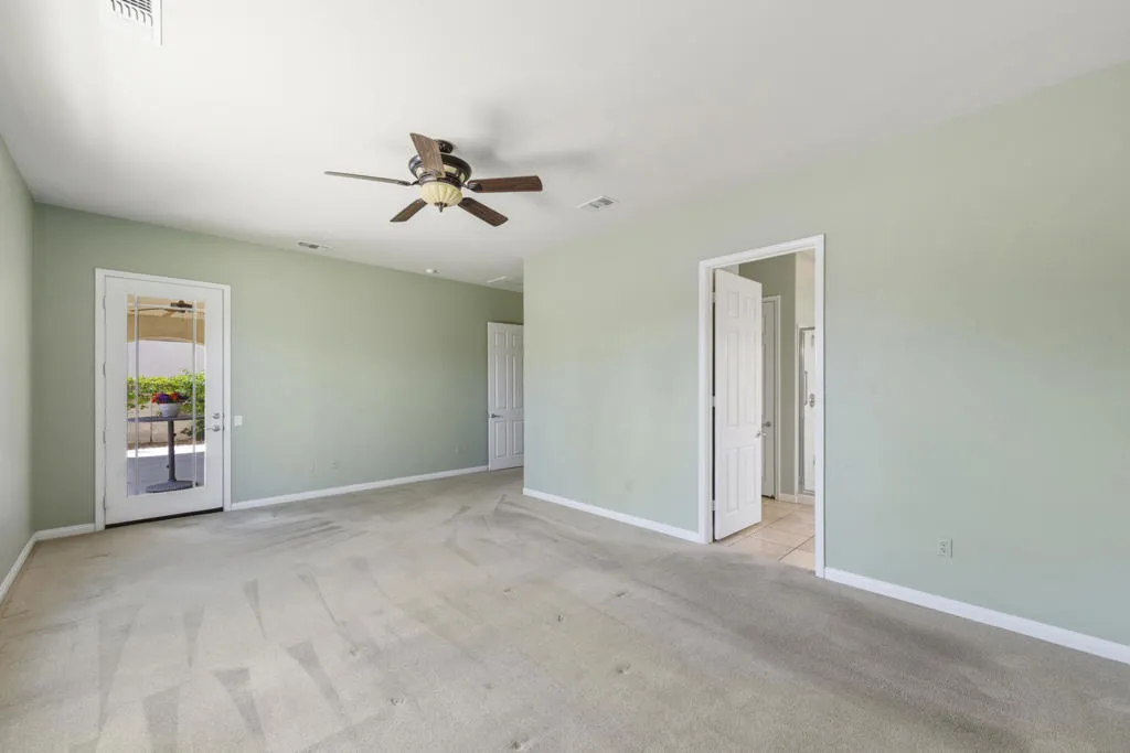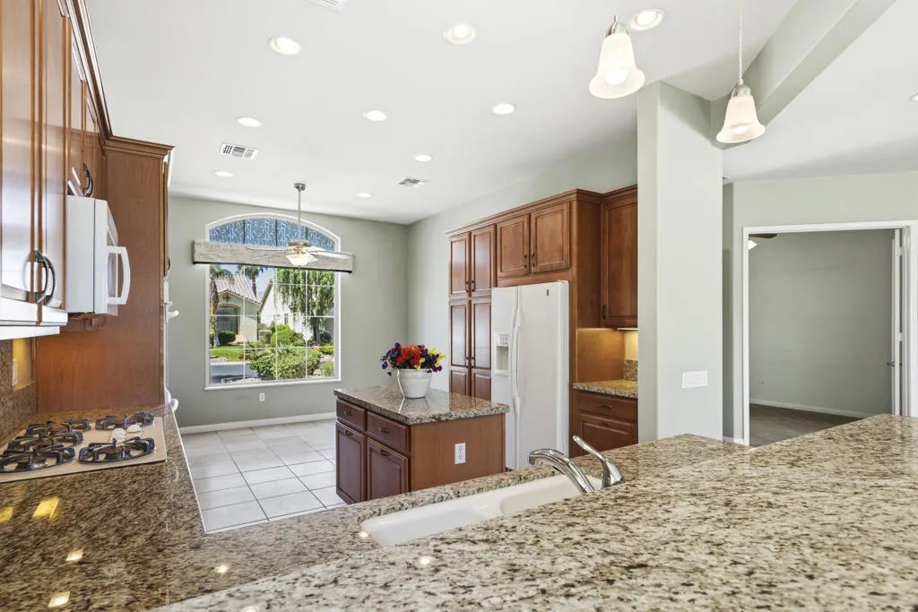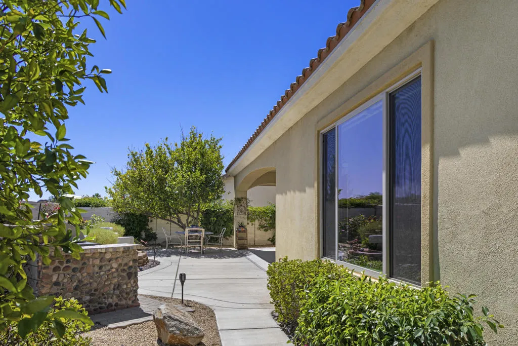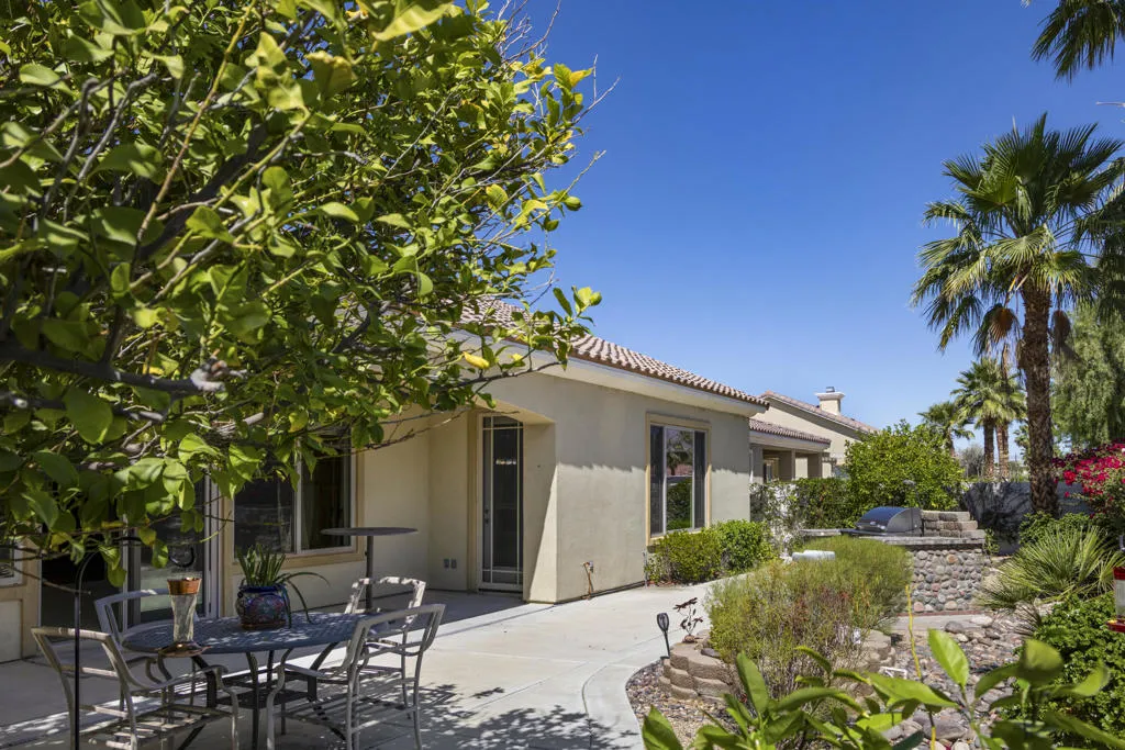 PRICED TO SELL-Don't miss this highly sought-after San Benito model with beautiful views! This spacious home offers an inviting open-concept Great Room featuring an entertainment center cabinet-perfect for relaxing or entertaining. The large primary suite includes direct access to the backyard, while the en-suite bath boasts dual vanities, a soaking tub, separate shower, and a generous walk-in closet. Additional living spaces include a guest bedroom with mirrored doors, a versatile den, bonus room, and a second bathroom-ideal for guests. Ceiling fans are thoughtfully placed throughout the home for added comfort. The well-appointed kitchen is a chef's delight, complete with slab granite countertops, a large center island, double ovens, a five-burner cooktop, built-in microwave, pull-out shelving, and a convenient trash drawer. A bright dining nook with built-in cabinetry provides extra storage and a cozy place to gather. A spacious laundry room with abundant cabinetry and a deep sink leads to the oversized two-car plus golf cart garage, also equipped with built-in storage cabinets. Step outside to your private backyard retreat featuring an extended covered patio, built-in barbeque, and a tranquil water feature-perfect foe enjoying the desert lifestyle. Located in Sun City Shadow Hills, a premier active adult community offering: Two clubhouses, Two fitness centers, a ballroom & activity rooms, a billiard room, Indoor lap pool & outdoor resort-style pools and spas. There are pickleball, tennis & bocce courts, two golf courses(championship & par-3) numerous social clubs and activities. The HOA dues are low and include internet!
