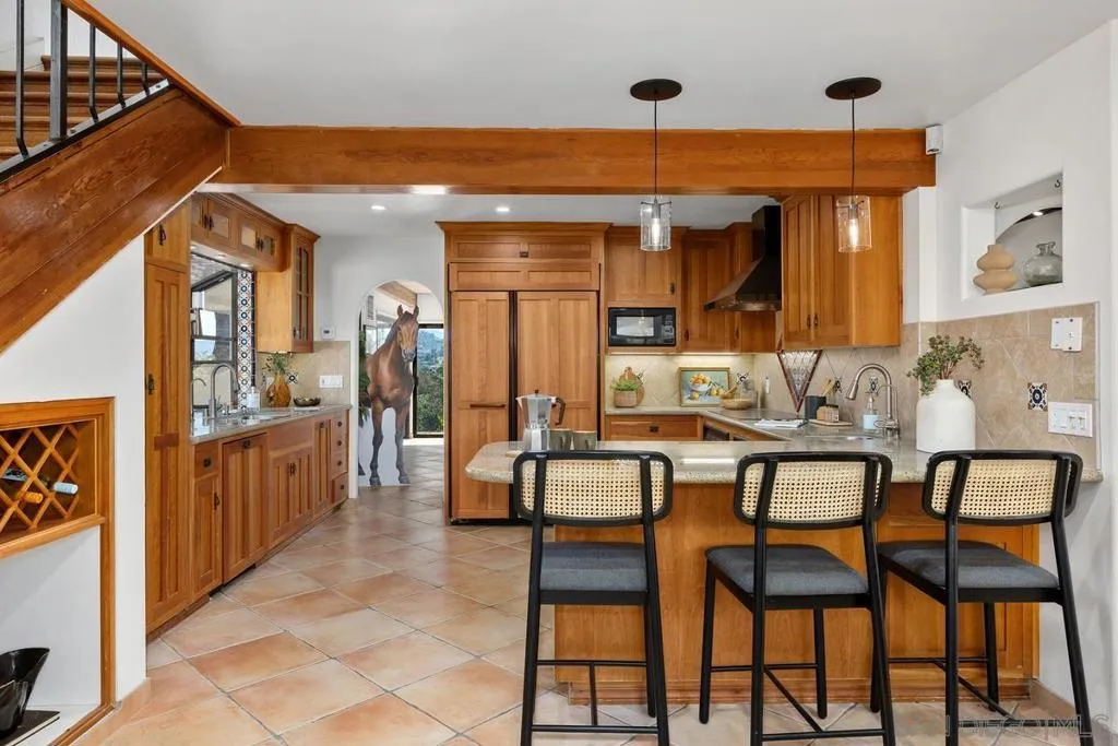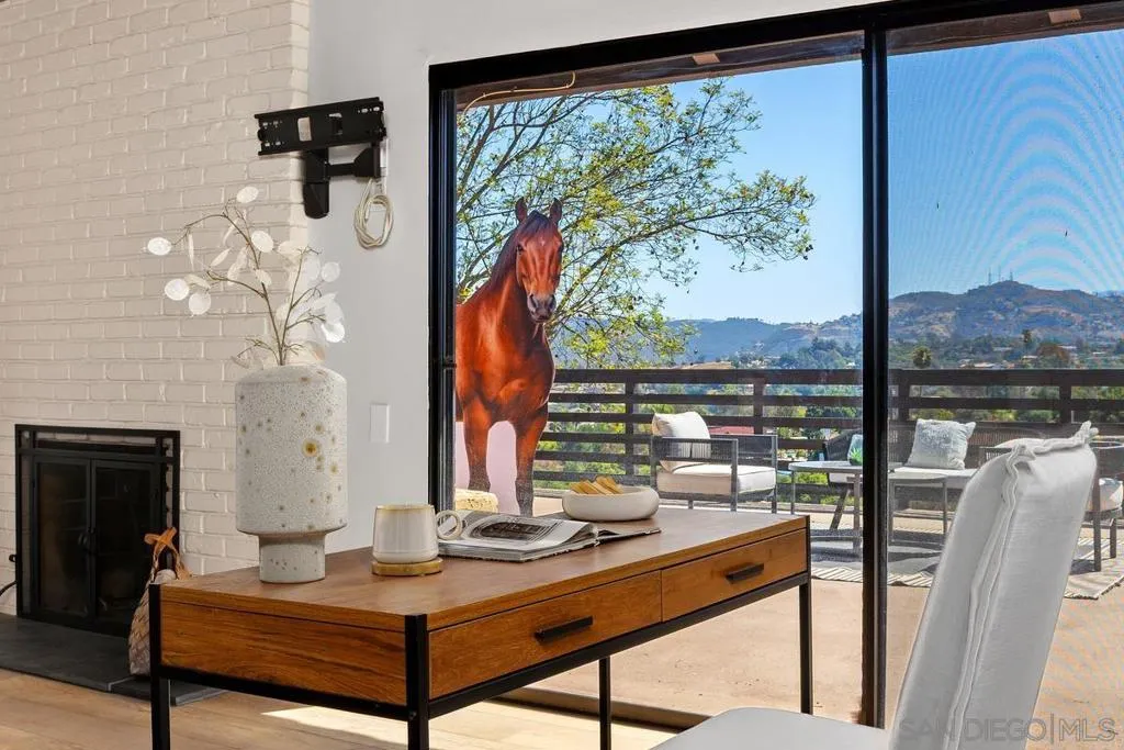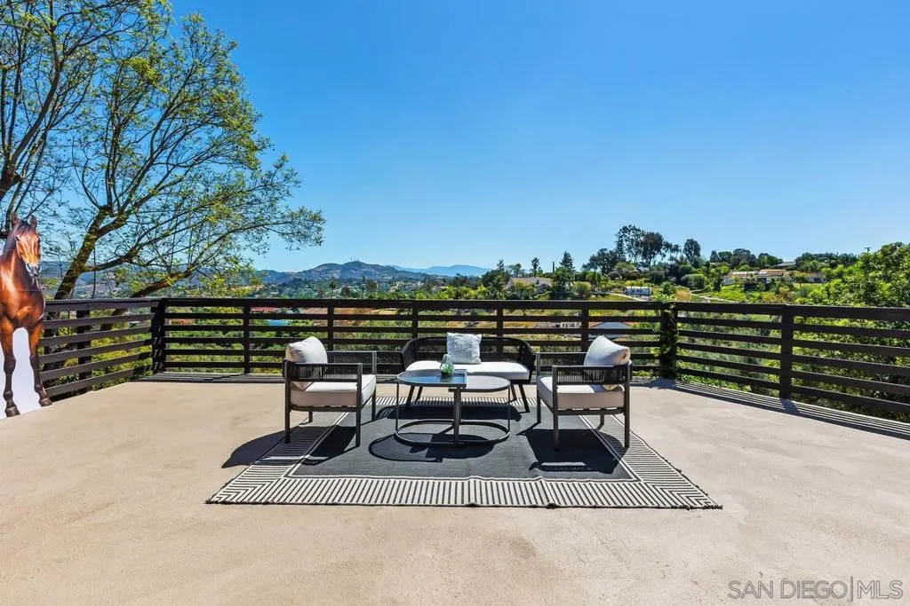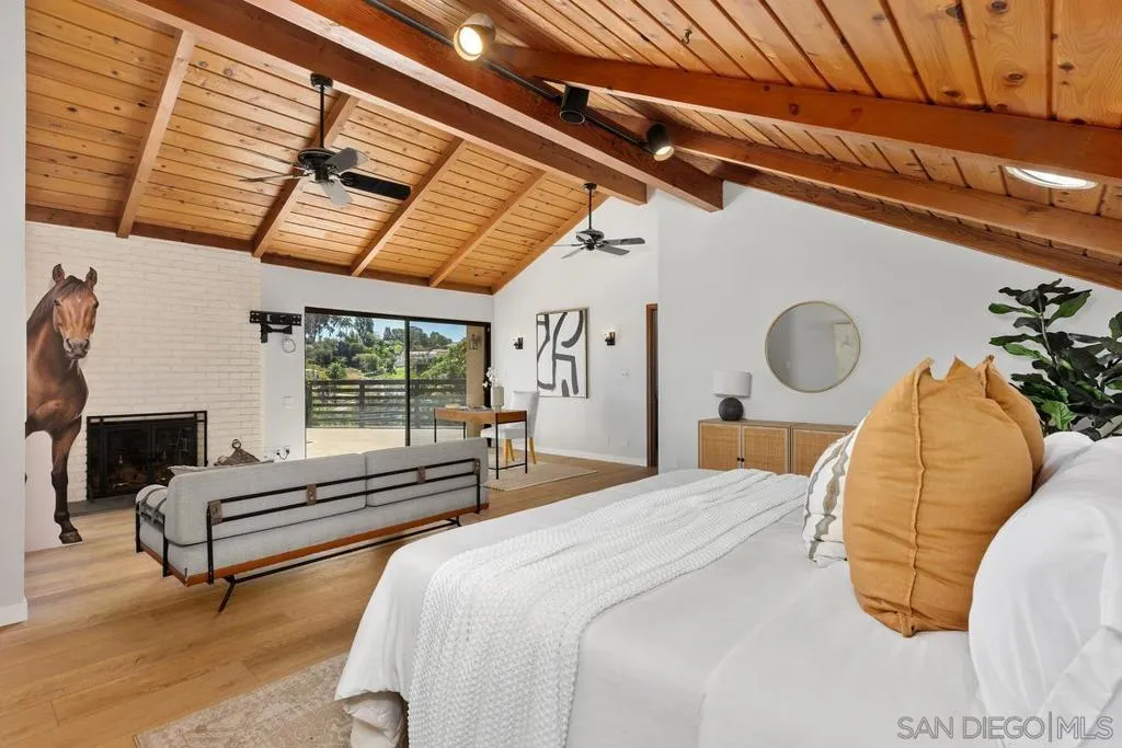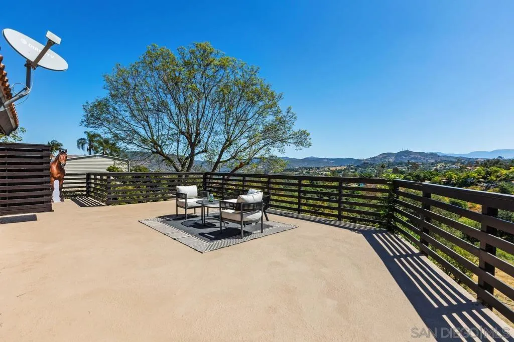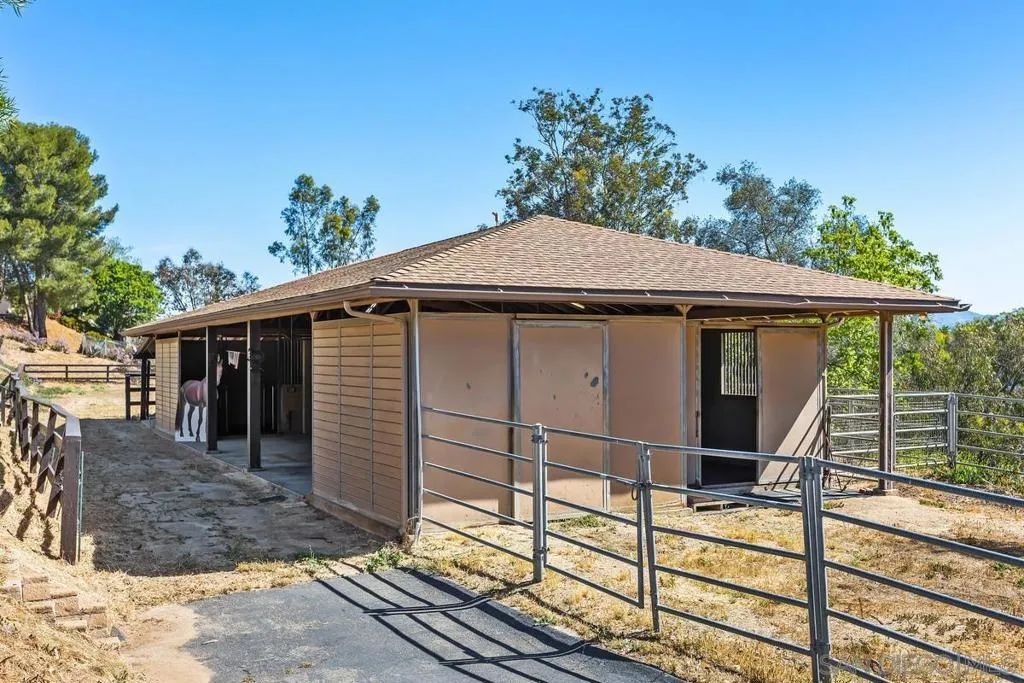 4.4-acre gated horse property with panoramic views, usable land, and a complete equestrian setup just minutes from downtown Fallbrook. This solar-powered 3BR/2BA home is designed to take advantage of the setting, with large picture windows, exposed beam ceilings, and seamless indoor-outdoor flow to an expansive view deck. The main living space centers around a fireplace and connects to a well-appointed kitchen with custom cabinetry, high-end appliances, and an eat-in dining area that works for daily living and entertaining. Upstairs, the primary suite acts as a private retreat with its own fireplace, walk-in closet, spa-style bath, and direct access to a view deck overlooking rolling hills. The property is fully equipped for horse use with a 4-stall barn (including foaling stall), tack room, wash rack, arena, and three paddocks, along with rubber-matted stalls and hot/cold water. An attached studio with bath and kitchenette provides flexible space for guests, office, or ADU/long-term occupancy. 33 owned solar panels, RV carport, storage sheds, and a well-balanced layout complete the offering.