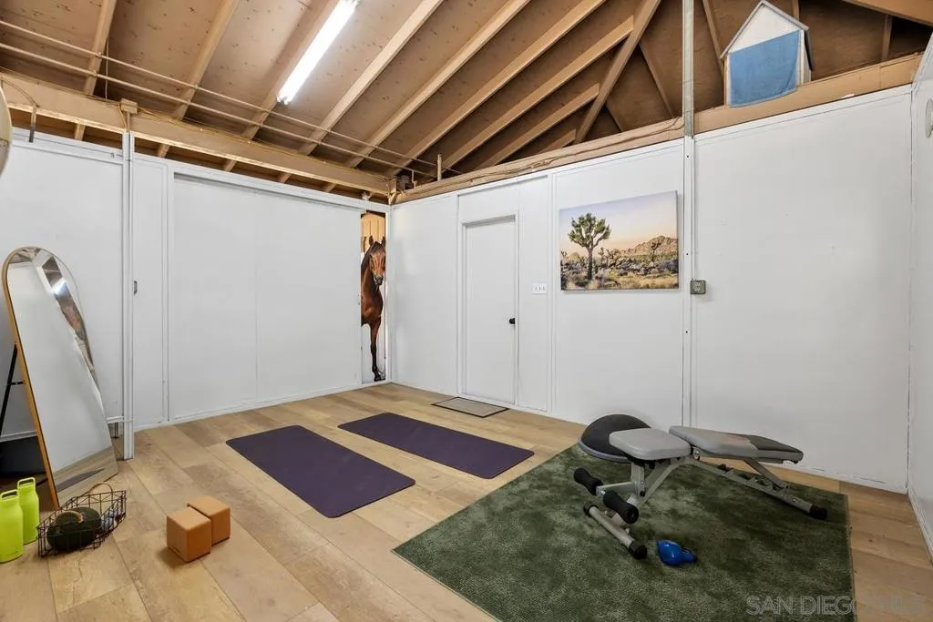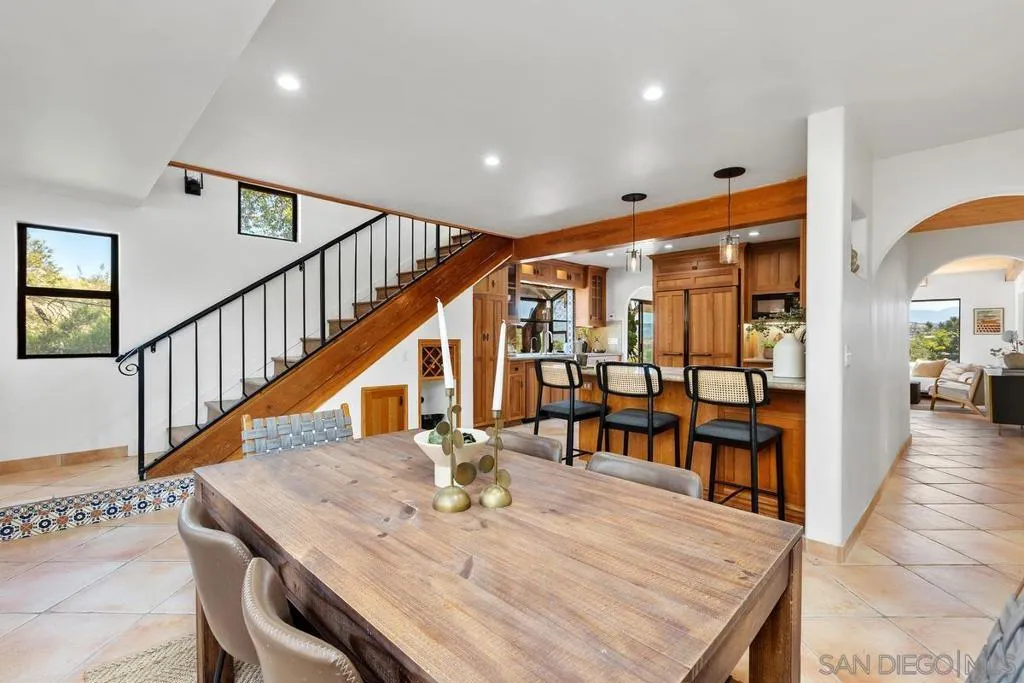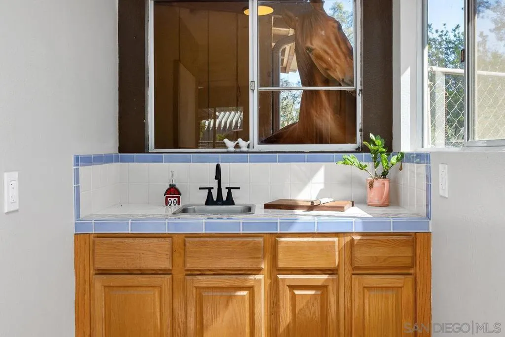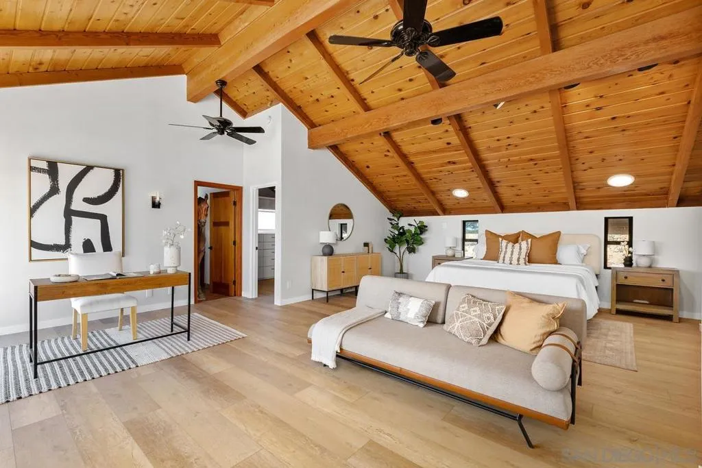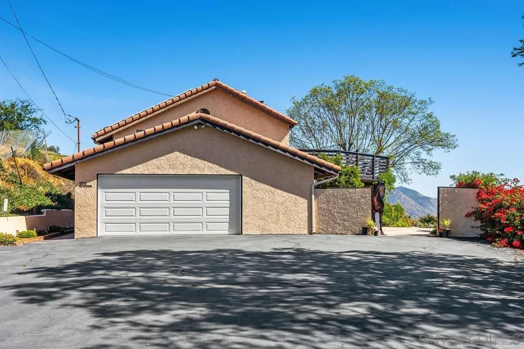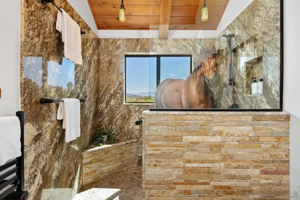 4.4-acre gated horse property with panoramic views, usable land, and a complete equestrian setup just minutes from downtown Fallbrook. This solar-powered 3BR/2BA home is designed to take advantage of the setting, with large picture windows, exposed beam ceilings, and seamless indoor-outdoor flow to an expansive view deck. The main living space centers around a fireplace and connects to a well-appointed kitchen with custom cabinetry, high-end appliances, and an eat-in dining area that works for daily living and entertaining. Upstairs, the primary suite acts as a private retreat with its own fireplace, walk-in closet, spa-style bath, and direct access to a view deck overlooking rolling hills. The property is fully equipped for horse use with a 4-stall barn (including foaling stall), tack room, wash rack, arena, and three paddocks, along with rubber-matted stalls and hot/cold water. An attached studio with bath and kitchenette provides flexible space for guests, office, or ADU/long-term occupancy. 33 owned solar panels, RV carport, storage sheds, and a well-balanced layout complete the offering.