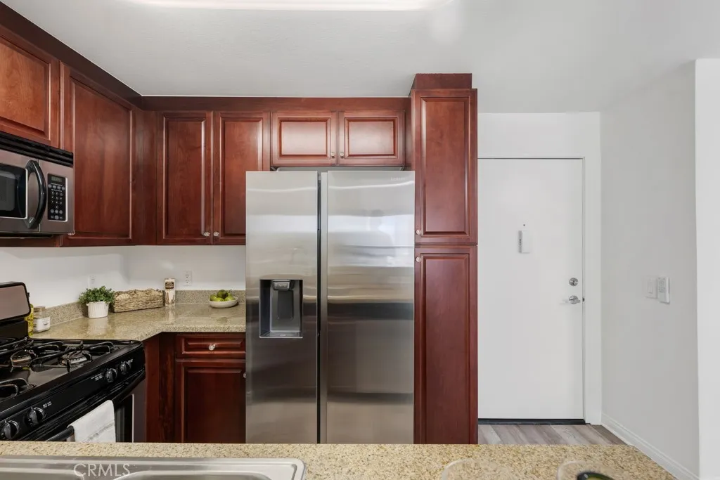 Welcome to this stunning 3rd floor corner unit at the highly sought-after MET community in Woodland Hills. This stunning unit features soaring vaulted ceilings, clean crisp architectural lines, and an abundance of natural light. Spanning approximately 610 sq ft, this thoughtfully designed 1-bedroom, 1-bathroom condo lives larger than its footprint thanks to an open-concept layout that seamlessly connects the living, dining, and kitchen areas. The well-appointed kitchen features rich cherry wood cabinetry, granite countertops, and a full suite of stainless steel appliances including a gas range and French door refrigerator perfect for everyday cooking and entertaining. The inviting living room centers around a cozy fireplace and opens via sliding glass doors to a private balcony with peaceful treetop and courtyard views, ideal for morning coffee or winding down in the evening. The generously sized primary bedroom offers hardwood-style flooring, a ceiling fan, and a large window framing lush greenery, complemented by an en-suite bath with granite vanity and tub/shower combo. Adding exceptional value, this unit comes with a rare 3 dedicated parking spaces, a truly standout feature in any HOA community. Residents of the gated MET enjoy resort-style amenities including a pool, spa and a fitness center, all just moments from Ventura Boulevard's dining and shopping, Warner Center, and easy 101 freeway access.