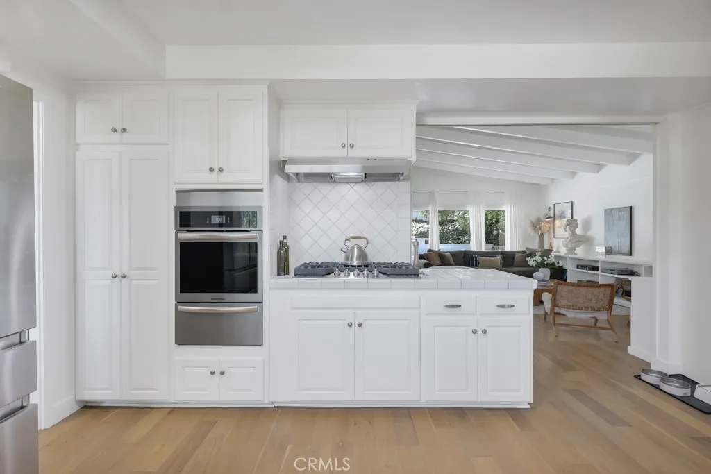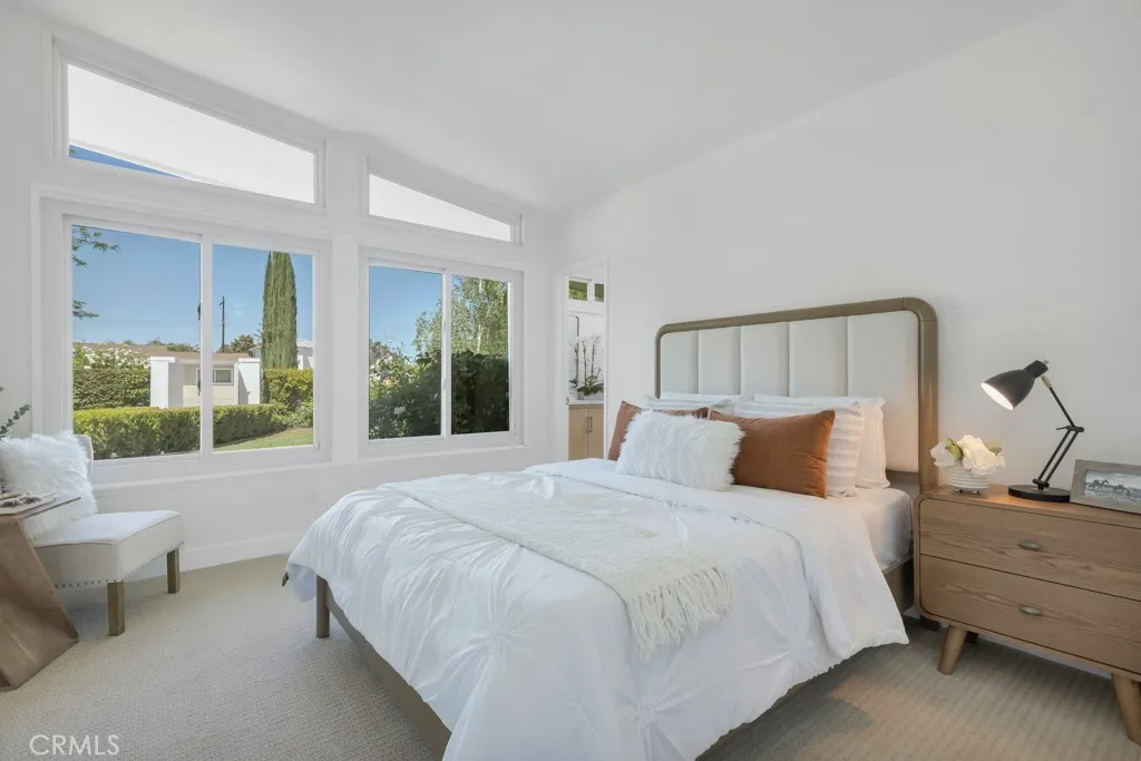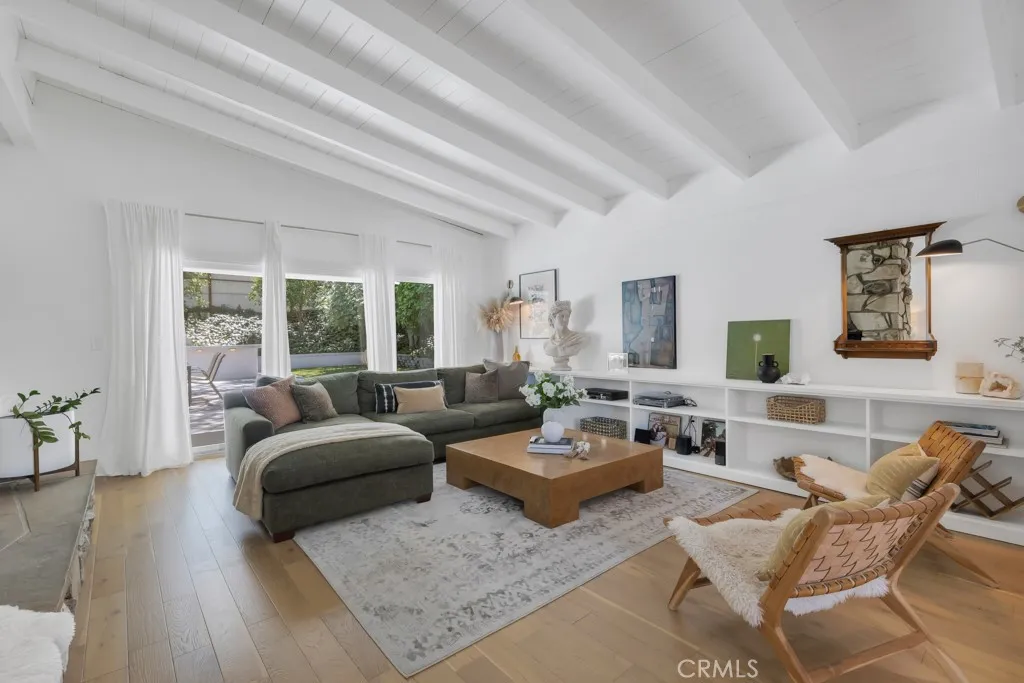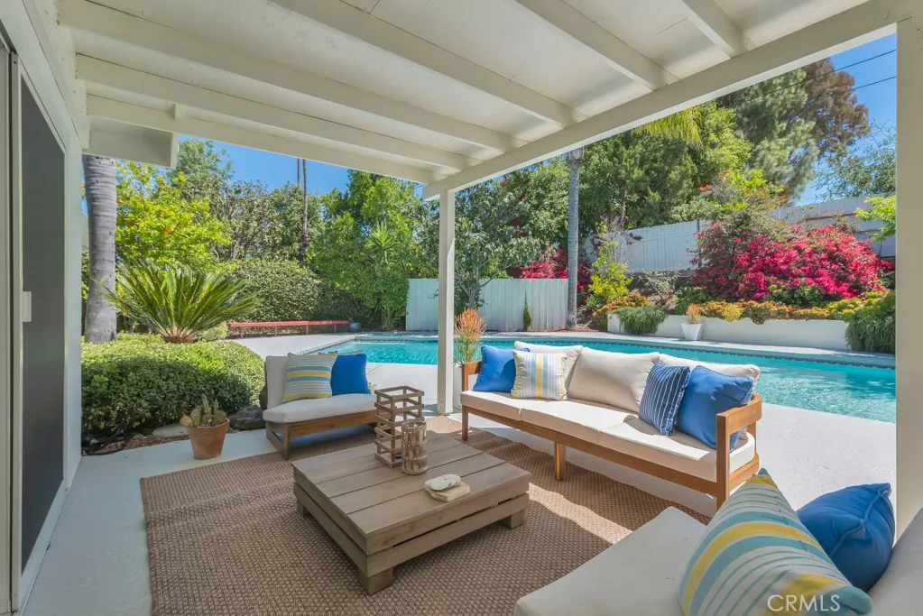 This stunning Charles Du Bois-designed Contemporary Ranch offers 2,115 sq ft of living space on a generous 11,703 sq ft lot in one of Woodland Hills' most sought-after neighborhoods. All the iconic Du Bois signatures are on full display: a striking stone facade, classic double entry doors, a low-pitched roofline with overhanging eaves, and a seamless indoor-outdoor flow that defines the best of mid-century California living. Inside, the sun-drenched open great room is anchored by a dramatic floor-to-ceiling stone fireplace, white-painted wood beam ceilings, and gleaming hardwood floors that connect the living and dining areas with effortless style. The updated kitchen features crisp white cabinetry, a diamond tile backsplash, a gas cooktop, and stainless appliances. The home's two designer bathrooms are showstoppers in their own right, one boasts a freestanding soaking tub, rich deep-green zellige tile, a walnut vanity, and classic penny tile floors, while the other features a dual-sink marble vanity and a glass-enclosed shower. Four well-proportioned bedrooms and a 2-car attached garage round out the interior, while the gated front yard with manicured hedges and lawn provides privacy and outstanding curb appeal. Out back, the resort-worthy yard is an entertainer's dream, a large sparkling pool, an expansive grass area, and a generous covered patio perfect for al fresco dining or relaxed outdoor seating, all framed by vibrant bougainvillea and mature trees for total seclusion. Ideally situated with close proximity to the El Camino Shopping Center, The Commons at Calabasas, easy 101 freeway access, and nearby hiking trails, this is Southern California living at its finest.