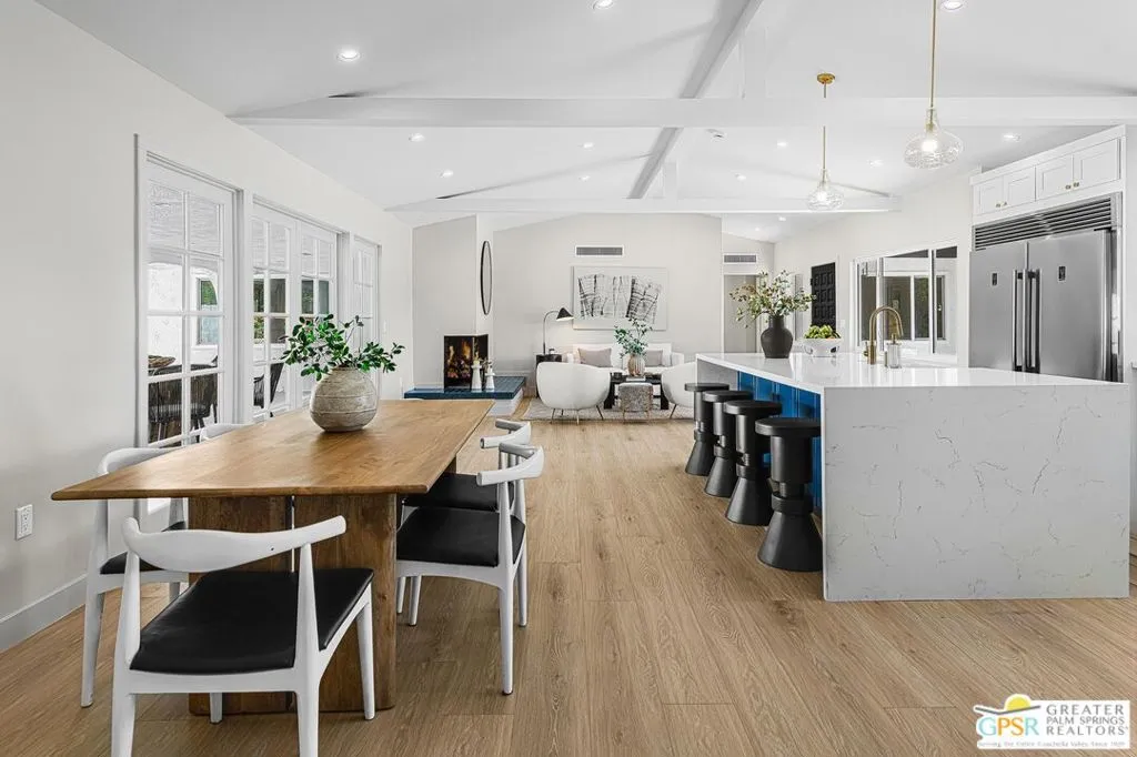 Set against a dramatic backdrop of mountain views, 1433 N Fiesta Road blends sleek updates with warm, livable spaces made for gatherings and quiet moments alike. A chef's kitchen equipped with dual sinks, a wine fridge, and an 8-burner gas range with double ovens serves as the anchor of the main living area. The main spaces are open and inviting, enhanced by ceilings rising over 10 feet. A family room and flexible office or den extend seamlessly from this core of the home. The primary suite features a spa-like ensuite bath with dual vanities and a generous walk-in rain shower complete with body jets. One guest bedroom includes a private full bath with a soaking tub, while two additional bedrooms are complemented by a full bath with dual vanities. A centrally located powder room enhances the home's livability and convenience for guests. Outdoors, a covered patio, pool, and multiple seating areas capture striking views of Mt. San Jacinto. An attached garage and pull through driveway complete this desert retreat, which offers a balance of comfort, privacy and a refined Palm Springs lifestyle.