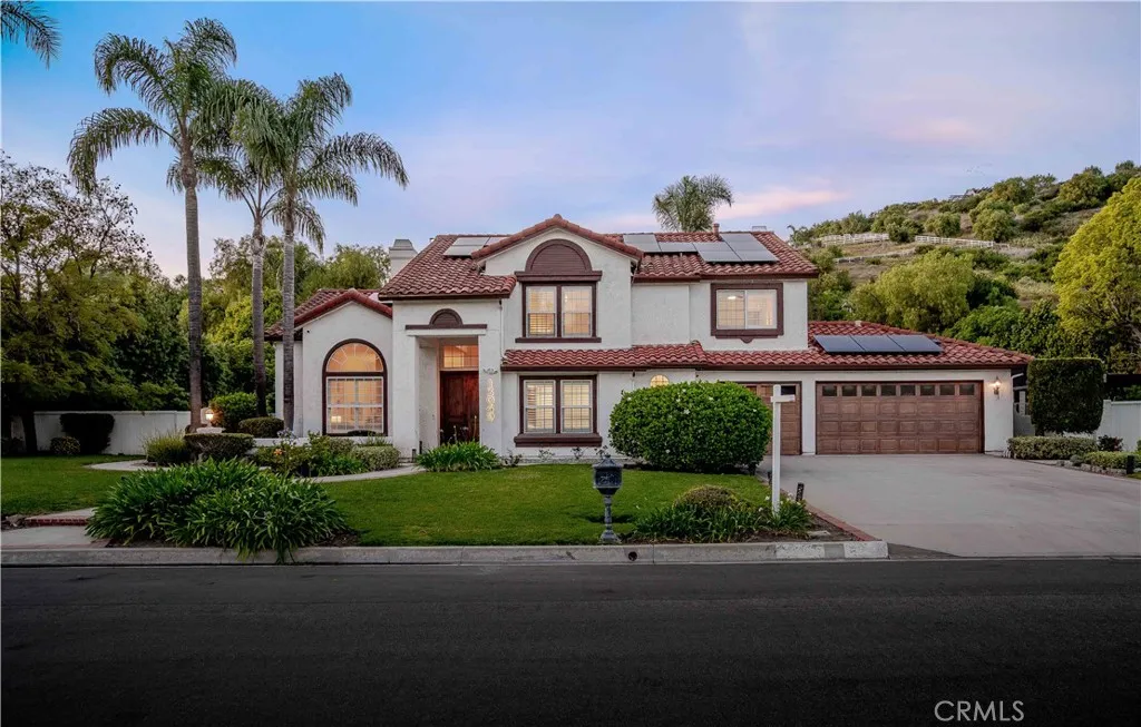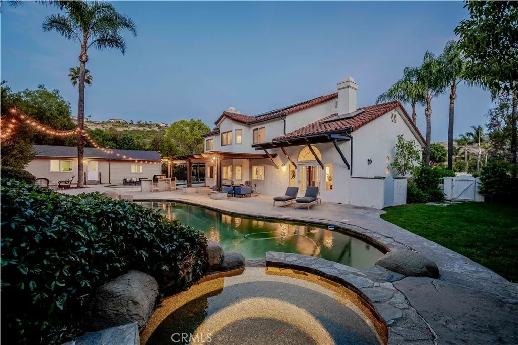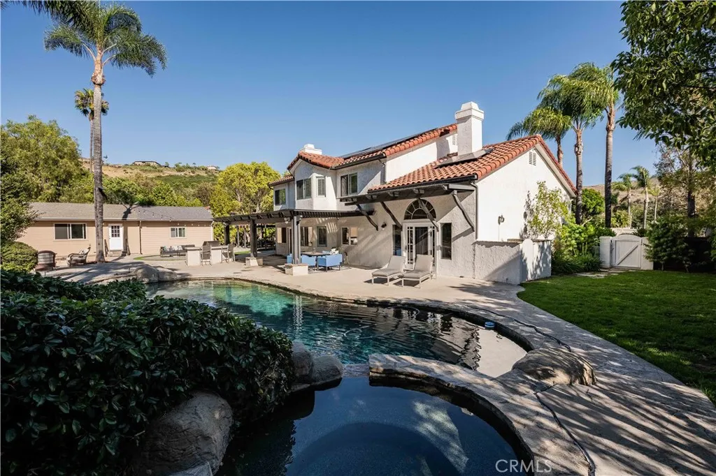 Beautiful Bridlewood home with detached independent studio, in-ground pebble pool and spa, with thoughtful modern upgrades nestled in the desirable Bridlewood community of Santa Rosa Valley, this stunning remodeled estate sits on a 1.45 acres land, offers privacy & quiet luxury, seamless indoor-outdoor living. This elegant two-story residence offers 3,080 sq. ft. of refined living space ideal for both relaxation and entertaining. A dramatic two-story foyer welcomes you with a soaring ceilings and a picturesque staircase. Upgrades include a brand new gorgeous wooden entry double-door, newly interior exterior paint, outdoor Security camera system, Halo water filtration throughout, Govee outdoor decorative lights, Leased solar panels with Tesla backup batteries and EV charger. The living and dining rooms share a double-sided fireplace capturing the view of pool/spa. The remodeled kitchen features Taj Mahal quarts countertops, stainless appliances, farmhouse sink, a large island, a walk-in pantry, breakfast bar and a cozy nook. Kitchen opens to the family room with a second fireplace and direct yard access, creating the perfect great-room environment. A main-floor 4th bedroom sits adjacent to a remodeled bathroom, and a bonus room added a space for office use or nanny's room. Upstairs, the primary suite offers vaulted ceilings, sitting area, a soaking tub, steam shower, dual vanities, and a large walk-in closet. Two additional bedrooms and another remodeled bath complete the upper level. The resort style grounds include the highly desirable detached 42'x17' studio with separate entry provides excellent value and flexibility, additional highlights: backyard offers covered patios and sitting areas, firepit, BBQ island ideal for entertaining, biking/hiking and horse trails in the community added value to this phenomenal location location neighborhood. This dream home has it all.