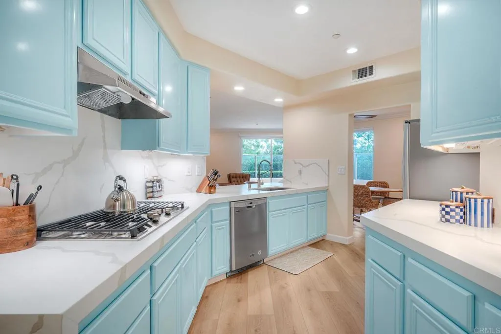 WEST OF THE 5 FREEWAY, discover resort-style living in this stunning, completely renovated corner end-unit, in the exclusive, gated Ocean Pointe community. Located just steps from the Agua Hedionda Lagoon and a short walk to Tamarack beach and Carlsbad Village, this spacious 1,704 sq. ft. residence offers the perfect blend of luxury, comfort, and coastal convenience. Every inch of this single-level home has been meticulously updated with premium finishes, including new laminate flooring, custom trim, modern lighting, and 60” ceiling fans throughout. The chef’s kitchen includes brand-new quartz countertops and backsplashes, painted cabinetry with under-lighting, and top-tier GE stainless steel appliances, including a gas cooktop. The spa-inspired bathrooms offer two primary en-suites that feature brand-new luxury vanities, Kohler soaking tubs, new tile work, and high-end hardware plus a remodeled guest 1/2 bathroom. This smart home includes Google Nest Thermostat (4th Gen), Ring video doorbell, and Schlage electronic smart lock for ultimate peace of mind. Custom storage includes brand-new custom closet systems by The Container Store. In the living room, there is tranquil wooden tiled accent walls with a quartz hearth and a full-motion TV mount ready for your home theater setup. This home offers an exceptional layout & community amenities and is offered fully furnished. This expansive floor plan features two generous primary en-suite bedrooms, a versatile den, a large great room, and an open dining area. The covered patio has views of the serene hillside, greenery and lagoon along with private a private storage room. This is an unbeatable location situated west of I-5, with direct access to the Harbor Drive Trail for walking and biking to the beach and lagoon. It offers convenience & security with gated entry, secure underground parking with two dedicated spots near the elevator, and additional storage. Ocean Pointe offers resort amenities that include a community pool, spa, lush green spaces, BBQ areas, and breathtaking coastal views. This is a rare opportunity to own a turnkey, high-end residence in one of Carlsbad’s most desirable gated communities.