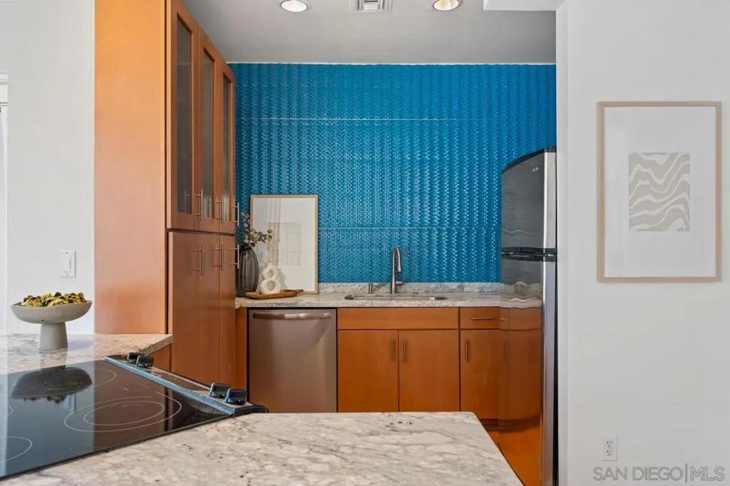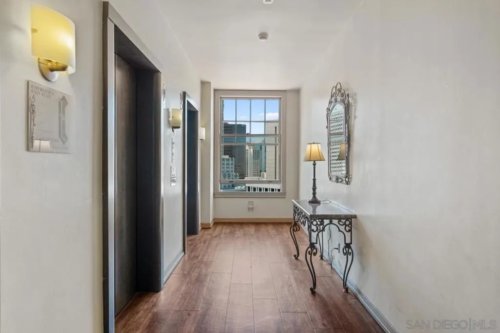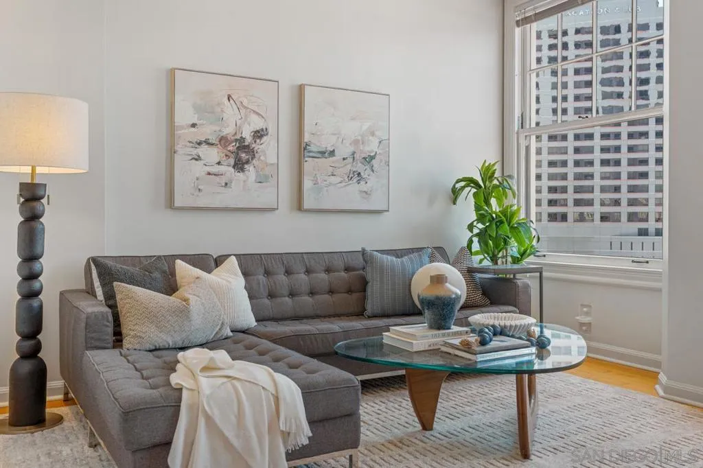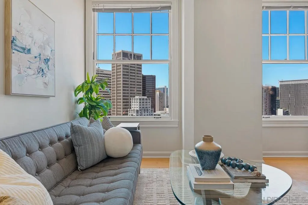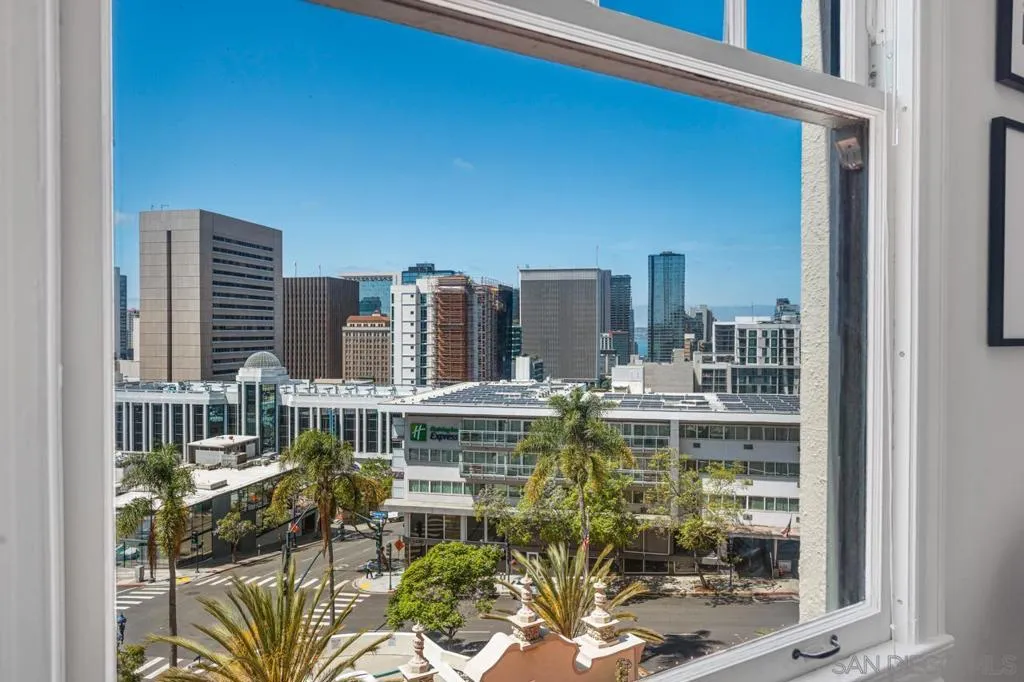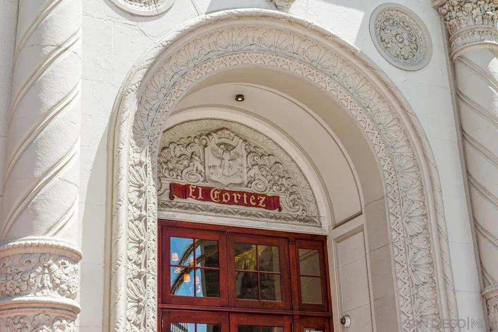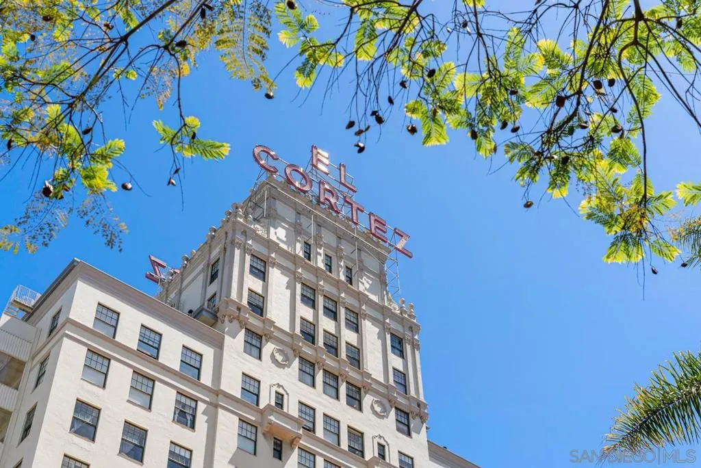Perched within the iconic and highly sought-after El Cortez, this rare west facing one-bedroom, two-bath residence blends timeless character with modern comfort in downtown San Diego. This spacious layout offers an open living and dining area filled with natural light, soaring ceilings, and classic architectural details that honor the building’s storied heritage, all complemented by captivating views of downtown and the bay. The generously sized primary suite offers a walk in closet and additional storage, along with an en-suite full bathroom. The kitchen features updated countertops and a striking backsplash, adding a vibrant, contemporary touch. The inviting living area provides a functional and comfortable layout ideal for both everyday living and entertaining while a second full bathroom offers added convenience for guests. Custom recessed lighting throughout elevates the space. El Cortez amenities include a pool, fitness center, and the beautifully landscaped gardens that define this landmark property. Located just steps from Balboa Park, Little Italy, and Gaslamp Quarter, this home offers an exceptional blend of historic charm and urban convenience. With the Mills Act in place, this property also offers significant property tax savings. A rare opportunity to own a true piece of San Diego history!