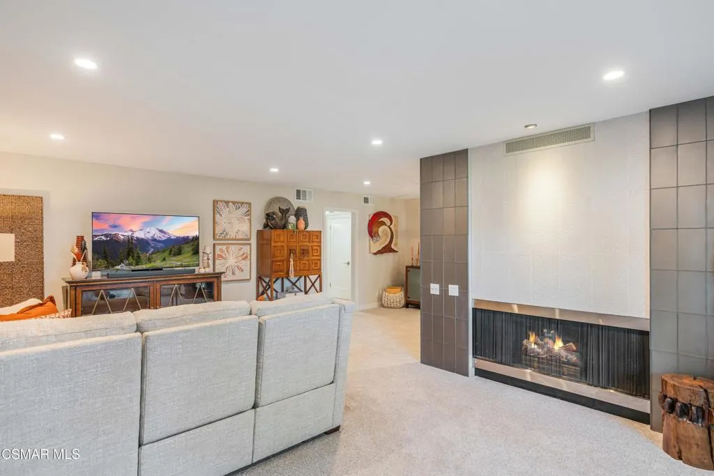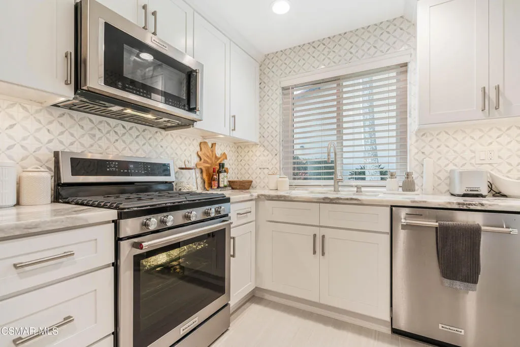 This is an amazing home! Thousands of dollars spent on top of the line upgrades! Located in prestigious Westlake Village, this tastefully, TOTALLY REMODELED, one bedroom CONDO is STUNNING! Located on the GROUND FLOOR, every square inch of this unit has been updated. BRAND NEW AC, freshly painted neutral interior with new carpet in the primary and family rooms, and recessed lighting through-out. The KITCHEN is a delight with newly added 'soft close' Koville cabinetry (not found in original units), marble countertops with waterfall, porcelain tile flooring, and new kitchen window. ALL NEW STAINLESS STEEL KitchenAid appliance package with a 5 burner range, new pantry door, cast iron sink, and microwave with outside venting, and full tile wall for easy cleaning. The beautifully REMODELED BATHROOM has DUAL VANITIES WITH ADDED STORAGE, MARBLE COUNTERTOPS, Duravit sinks, porcelain tile floor, custom designer lighting fixtures with dimmers, new window, new fan, dual medicine cabinets, and new designer mirrors. The frameless shower enclosure is adorned in custom marble from floor to ceiling and there is a motion sensor exhaust fan. Also, a TOTO toilet w/self cleaning flush and designer glass and nickel towel bars. The cozy dining room has a custom light fixture and is open to the family room. The oversized primary bedroom has a new custom MINKA ceiling fan with remote, tall ceilings with recessed lighting, and mirrored closet doors. The lovely family room has a beautiful custom tile wall with FIREPLACE. Open the sliding doors in the family room onto your outdoor PRIVATE ENCLOSED PATIO, which expands your living area and you can sit and enjoy the privacy. Additionally, there is a community POOL and SPA, green belts, and it's close to shops, dining, golf course, (across the street), Four Seasons and Westlake Village Inn! GREAT LOCATION! The owners have spent many thousands of dollars on this unit, it's not one that has just had a slap of paint! YOU WILL NOT FIND ANOTHER UNIT AS BEAUTIFUL AS THIS!