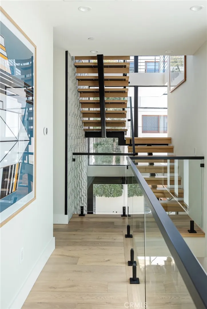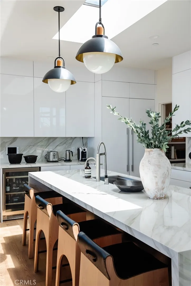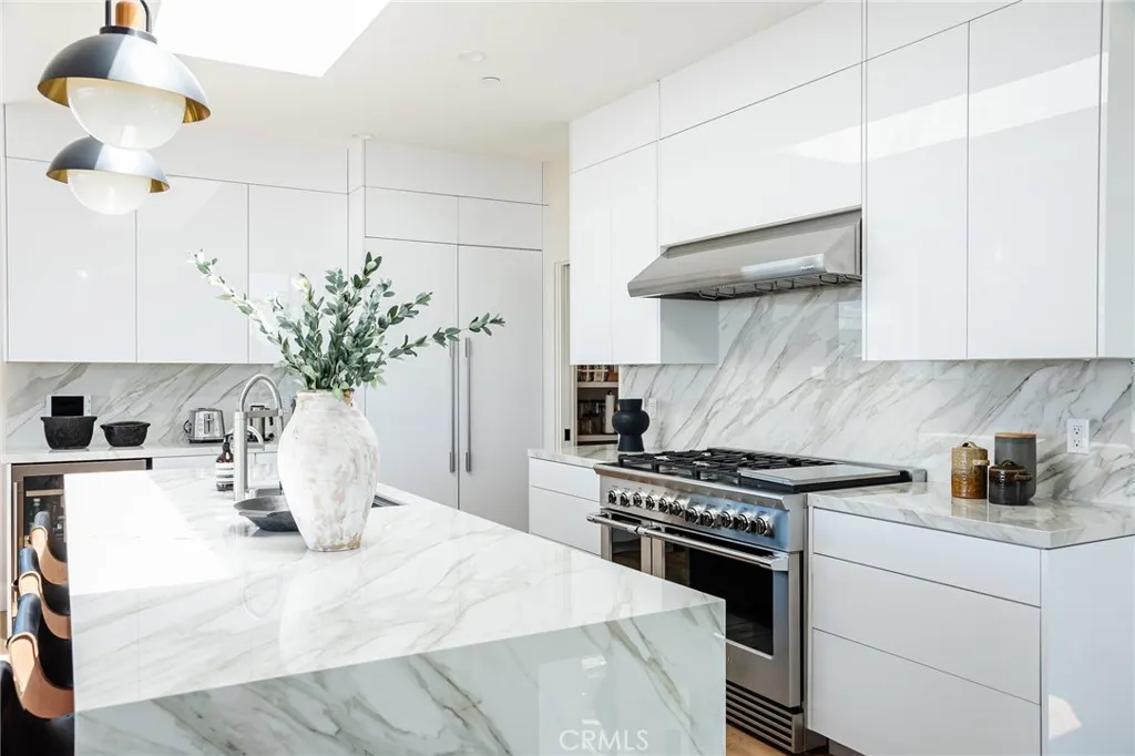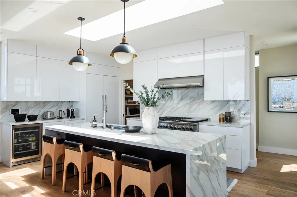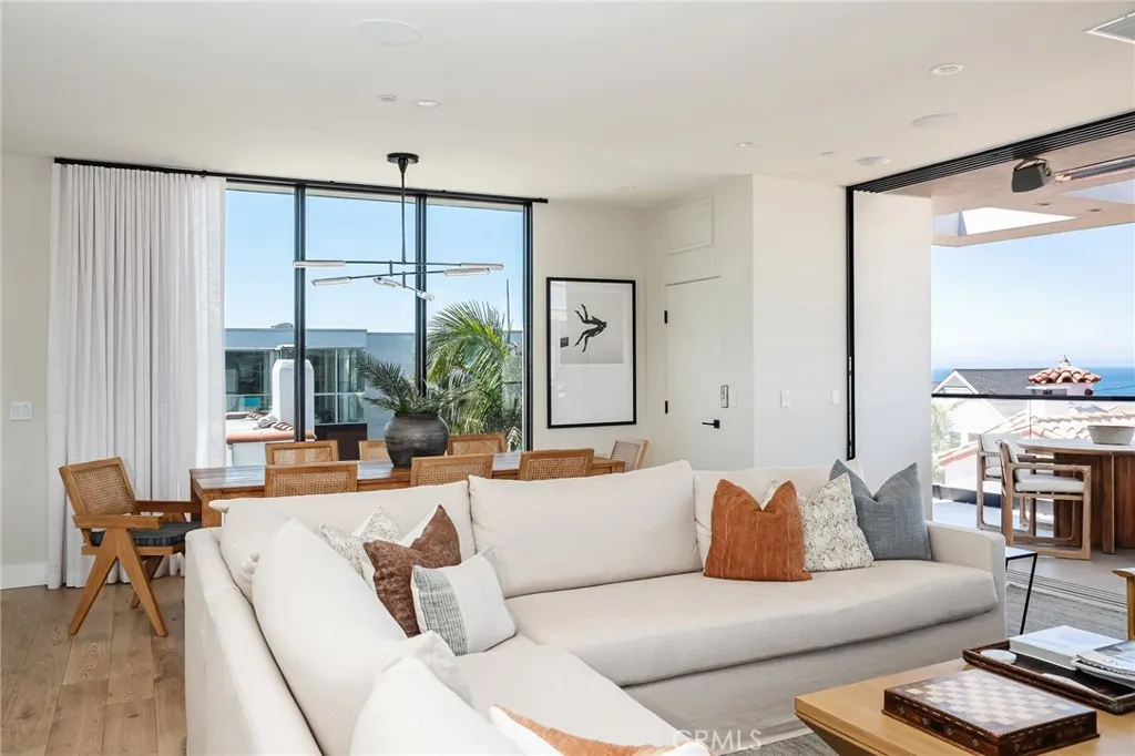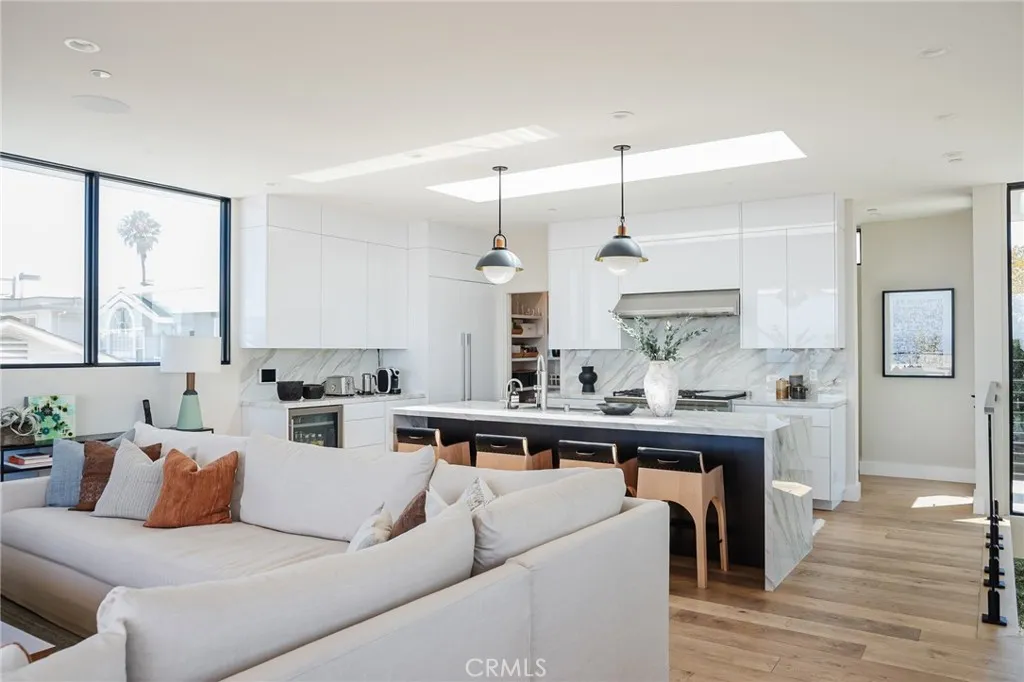 Set just a few blocks from the sand, this custom-built modern residence offers protected ocean views, elevated design, and a seamless indoor-outdoor coastal lifestyle that feels both refined and effortless. Thoughtfully reimagined by Kate Lester Designs, the home is defined by clean lines, soaring ceilings, and walls of glass that flood the interiors with natural light. White oak floors run throughout, grounding the space in a warm, organic palette that perfectly complements the coastal setting. The top-level great room is the true showpiece—an open-concept living, dining, and kitchen space where panoramic ocean views take center stage from nearly every angle. Expansive pocket doors disappear completely, opening the home to ocean breezes and golden sunsets, creating a setting that feels as much like an experience as it does a living space. The kitchen is both functional and striking, featuring Neolith Calcutta countertops, high-end appliances, and an oversized island designed for gathering. A floating staircase and 4-stop elevator connect all levels, leading to a serene primary suite complete with a private ocean-view balcony, fireplace, walk-in closet, and a spa-inspired bath with soaking tub and oversized shower. Each space throughout the home has been curated with intention—balancing modern design with everyday livability. The lower level offers a flexible entertainer’s suite - ideal as a media room, gym, or guest retreat—adding versatility to the home’s already thoughtful layout. With multiple outdoor spaces, high-end finishes throughout, and a rare height restriction easement protecting the views, this home captures the essence of South Bay living—where architecture, light, and the ocean come together in a way that feels both elevated and completely at ease.