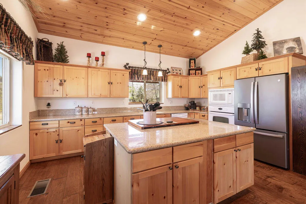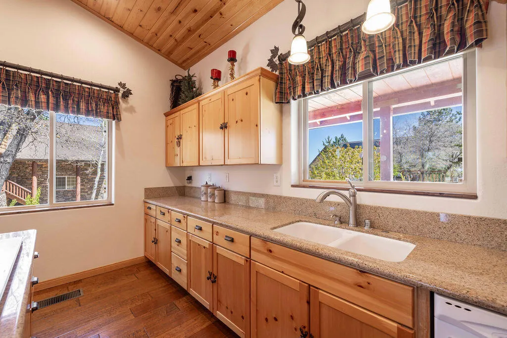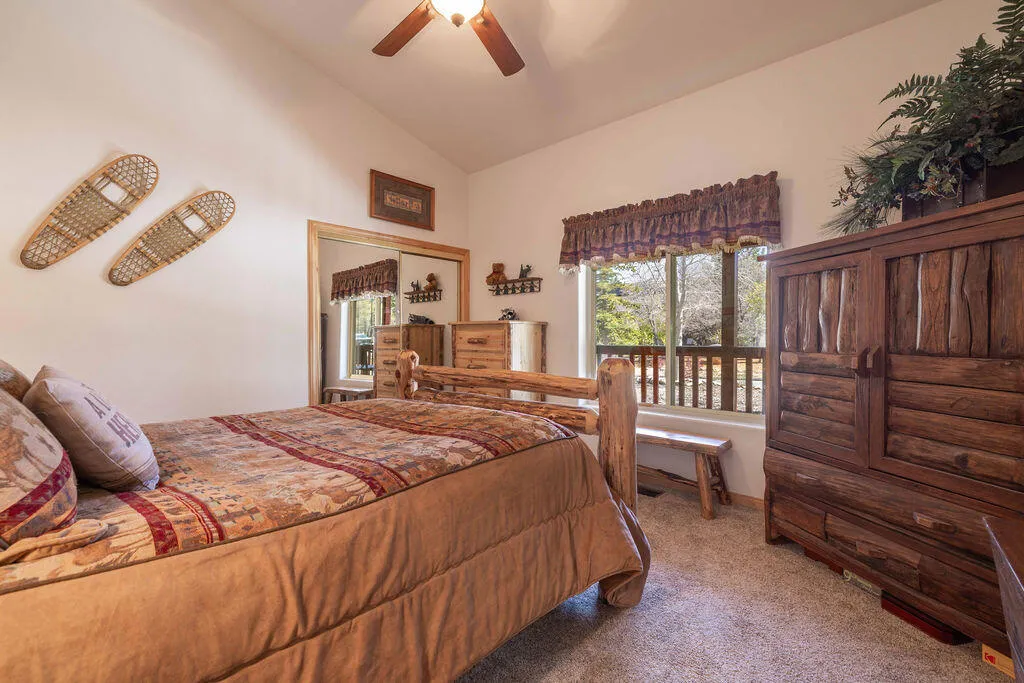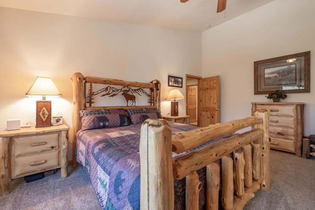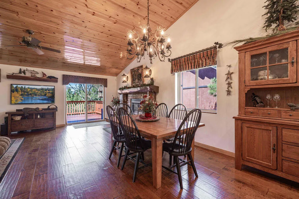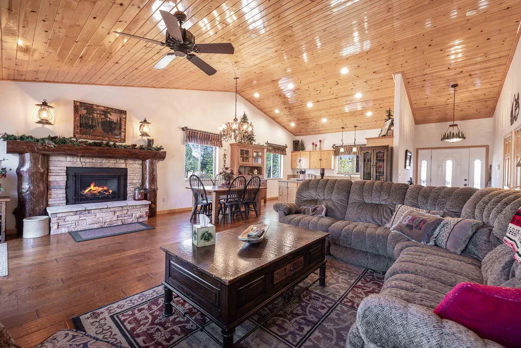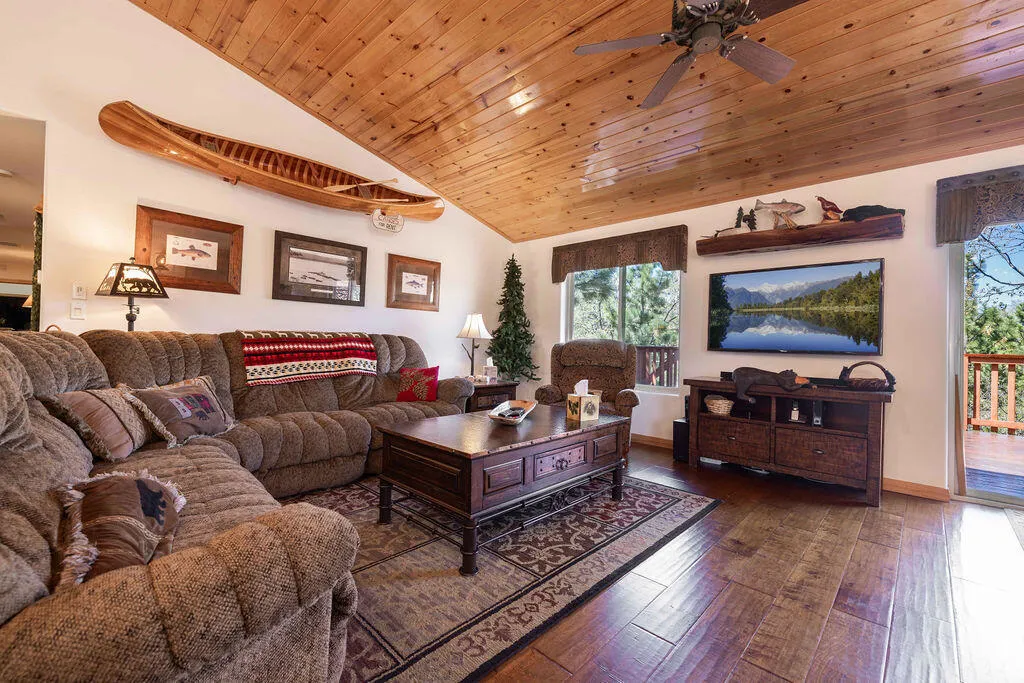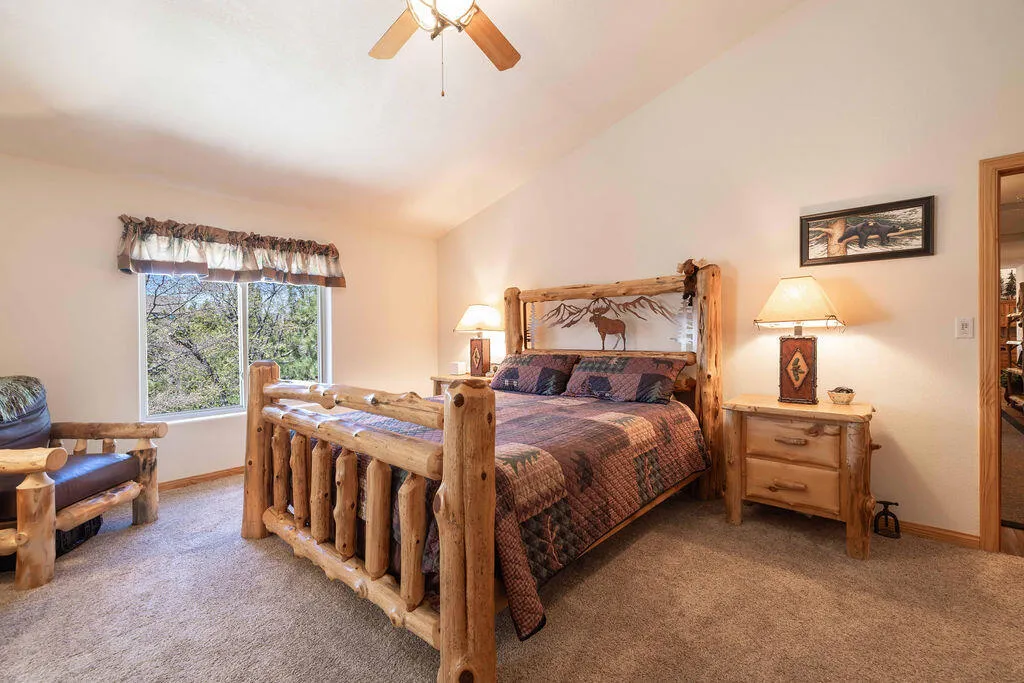 Located in the desirable High Timber Ranch neighborhood of Upper Moonridge, this well-maintained ranch-style home offers spacious single-level living with an open great room floor plan. The kitchen features knotty pine cabinets, granite countertops, and an island with cooktop, flowing seamlessly into the living area highlighted by vaulted tongue-and-groove knotty pine ceilings that create a warm mountain ambiance. Situated on a large 25,500 sq ft lot, the property offers a level driveway, landscaped yard, and a fenced backyard designed for low maintenance with turf and paver hardscape. The home includes 4 bedrooms and 3 bathrooms, with vaulted ceilings in all bedrooms. Two bedrooms--including the primary suite--feature en-suite bathrooms, providing added comfort and privacy for family or guests. Recent improvements include a new roof installed in 2023, new carpet in 2024, and a brand-new thermostatically controlled natural gas fireplace installed in 2026. The home is also equipped with a whole house fan, water softener, and a 2023 hot water tank with a hot water circulating system for quick delivery. Energy-efficient Hunter Douglas top-down/bottom-up honeycomb window shades were installed in 2026, along with new glass in the windows on the backside of the home. Additional features include an owned solar system, Generac natural gas generator, underground utilities, a covered front porch, oversized two-car attached garage, custom storage shed, and dedicated RV/boat parking. A rare combination of space, functionality, and mountain charm in one of Upper Moonridge's most sought-after neighborhoods.