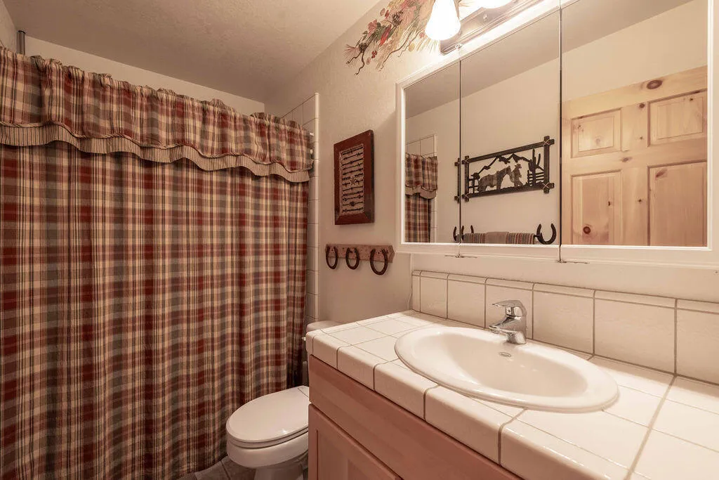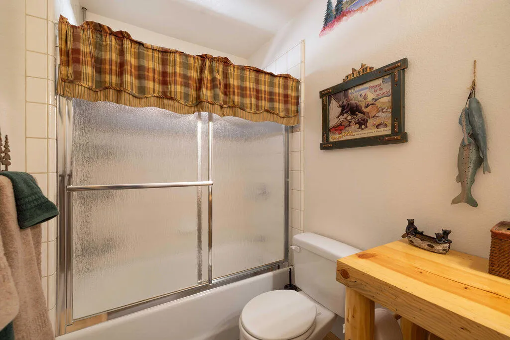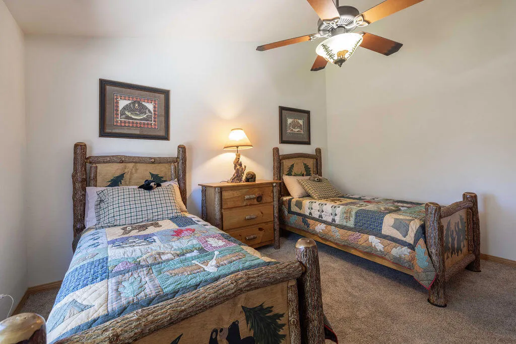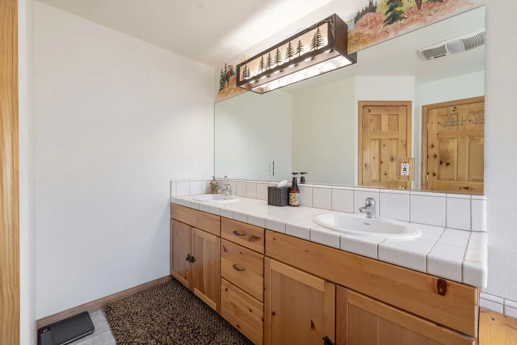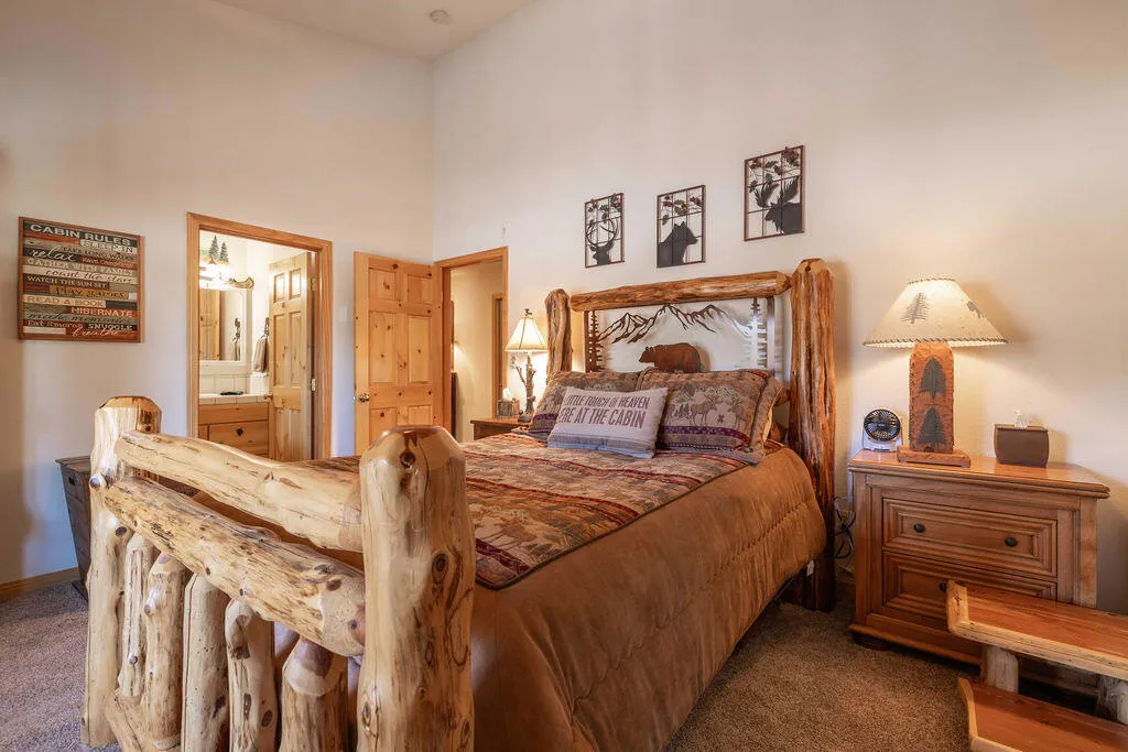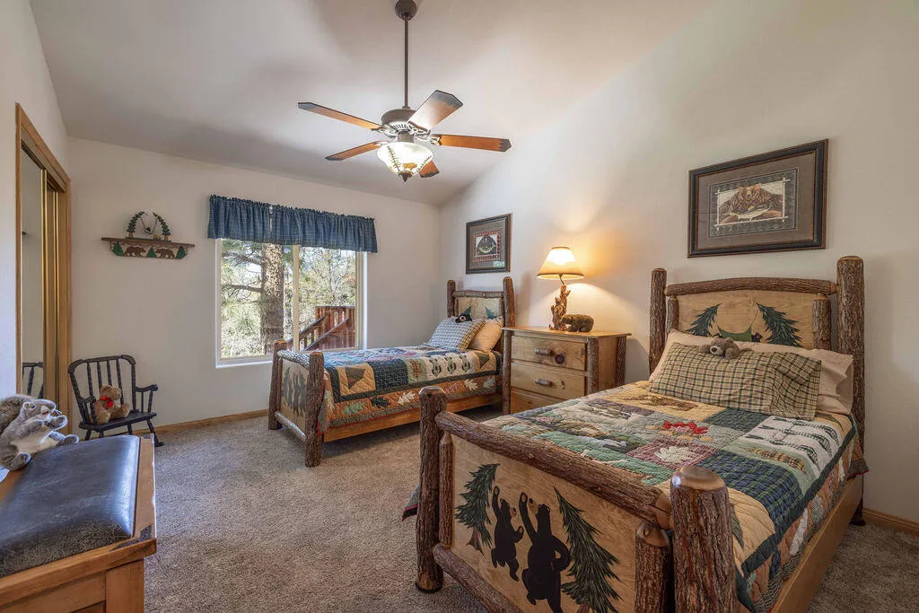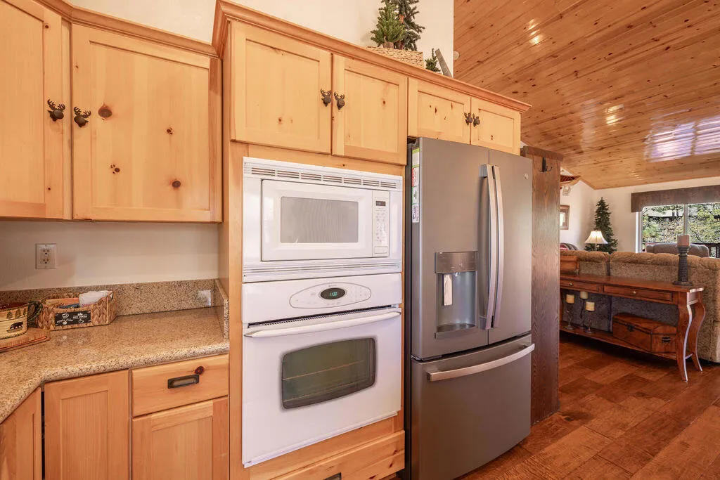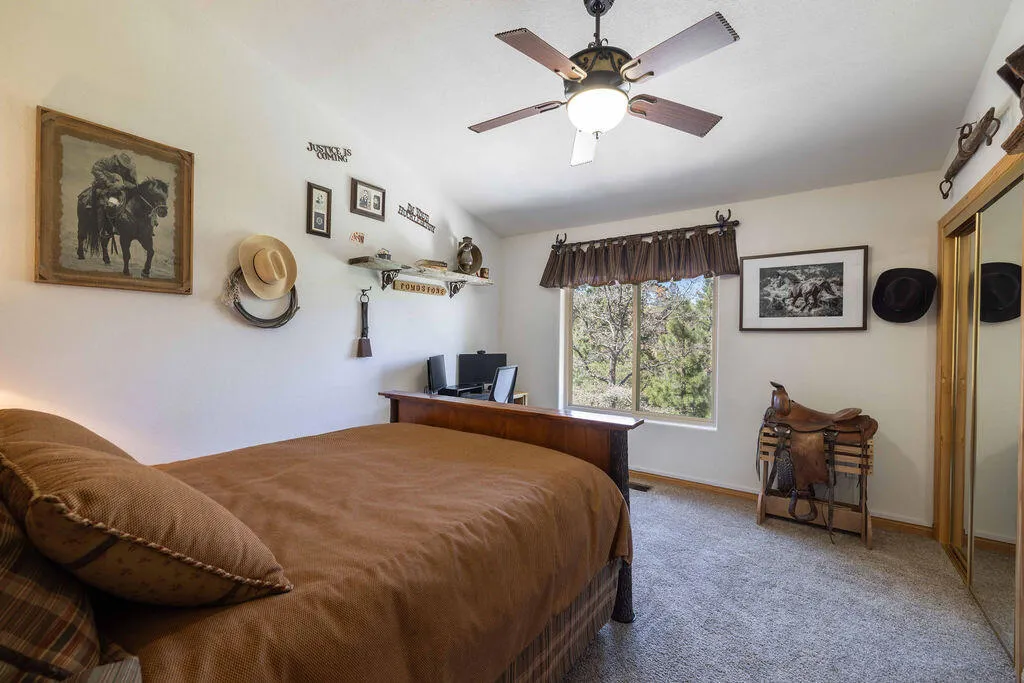 Located in the desirable High Timber Ranch neighborhood of Upper Moonridge, this well-maintained ranch-style home offers spacious single-level living with an open great room floor plan. The kitchen features knotty pine cabinets, granite countertops, and an island with cooktop, flowing seamlessly into the living area highlighted by vaulted tongue-and-groove knotty pine ceilings that create a warm mountain ambiance. Situated on a large 25,500 sq ft lot, the property offers a level driveway, landscaped yard, and a fenced backyard designed for low maintenance with turf and paver hardscape. The home includes 4 bedrooms and 3 bathrooms, with vaulted ceilings in all bedrooms. Two bedrooms--including the primary suite--feature en-suite bathrooms, providing added comfort and privacy for family or guests. Recent improvements include a new roof installed in 2023, new carpet in 2024, and a brand-new thermostatically controlled natural gas fireplace installed in 2026. The home is also equipped with a whole house fan, water softener, and a 2023 hot water tank with a hot water circulating system for quick delivery. Energy-efficient Hunter Douglas top-down/bottom-up honeycomb window shades were installed in 2026, along with new glass in the windows on the backside of the home. Additional features include an owned solar system, Generac natural gas generator, underground utilities, a covered front porch, oversized two-car attached garage, custom storage shed, and dedicated RV/boat parking. A rare combination of space, functionality, and mountain charm in one of Upper Moonridge's most sought-after neighborhoods.