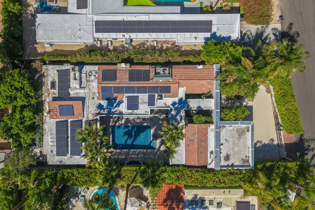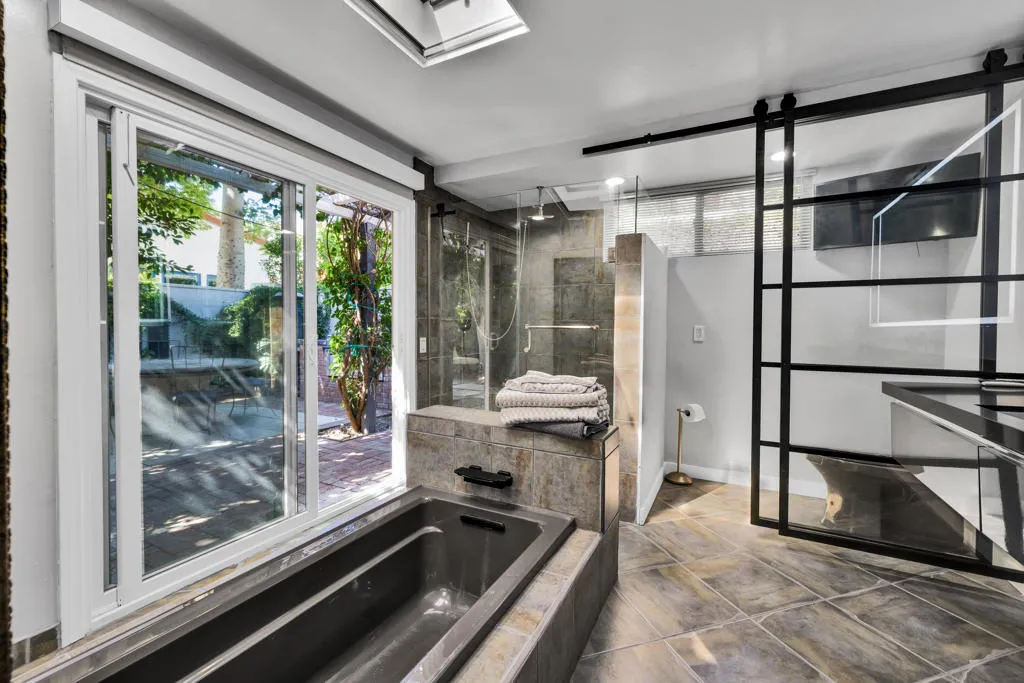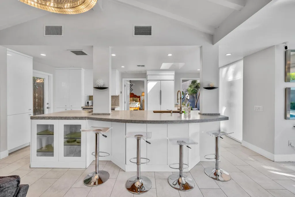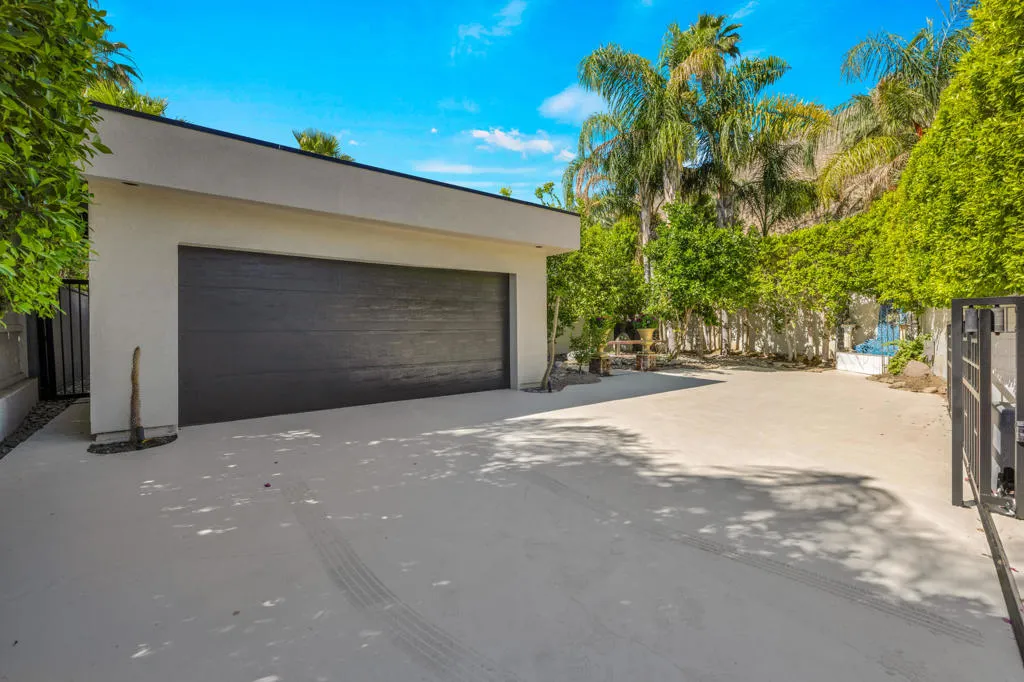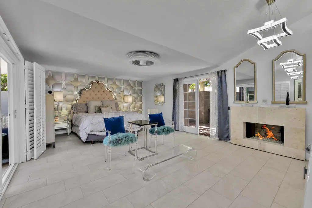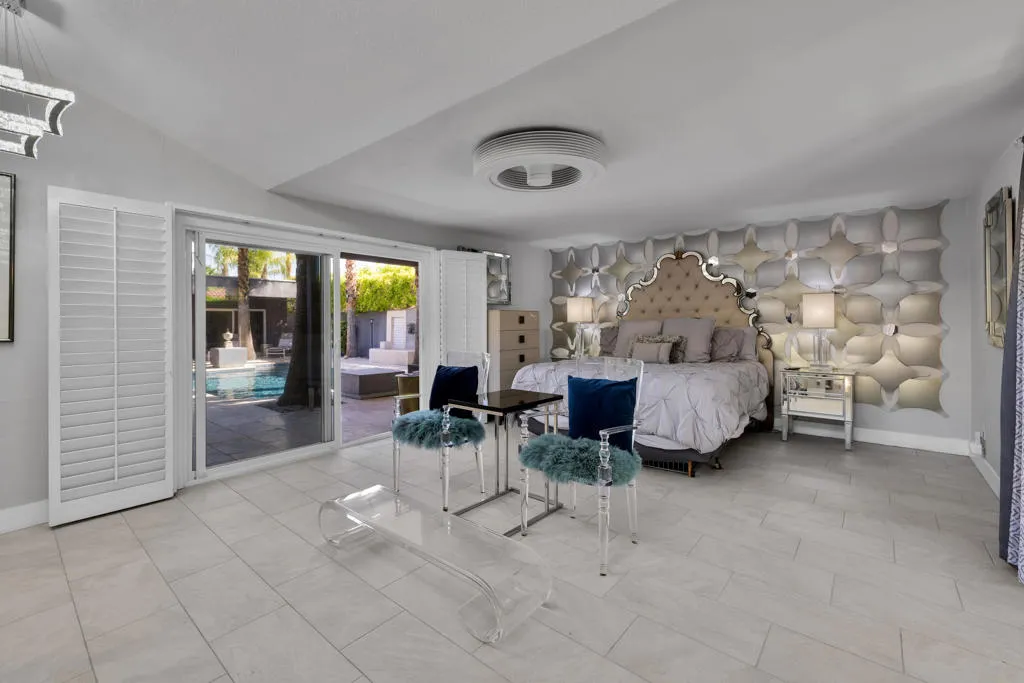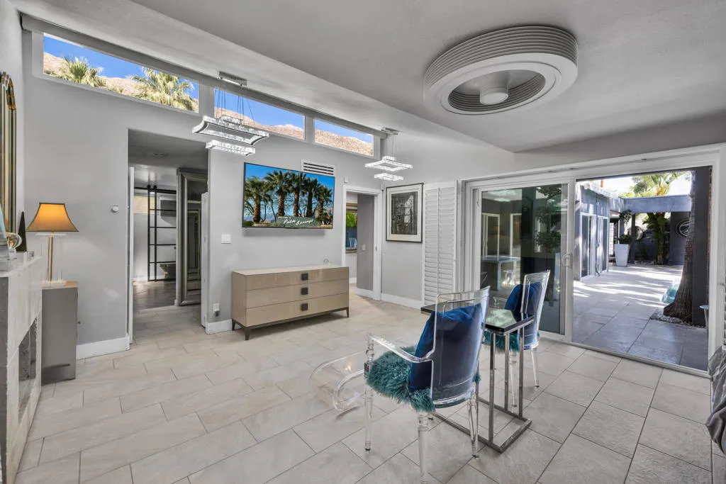 Palazzo Mesa is discreetly tucked behind private gates in the heart of the Mesa, offering a rare sense of privacy and serenity.Reminiscent of a European pied-a-terre, this stunning, recently remodeled contemporary residence is thoughtfully designed around a sparkling mosaic-tiled swimming pool, creating a seamless indoor-outdoor living experience. All principal rooms of the home including casita open to the pool.Located in the historic Mesa neighborhood of South Palm Springs--rich with Hollywood history and home to both past and present celebrities--this property embodies timeless elegance and modern sophistication.A gated courtyard welcomes you across a tranquil koi pond, setting the tone for the home's serene ambiance, enhanced by multiple water features throughout.The residence features three ensuite bedrooms, including a private detached casita, along with a dedicated office or optional fourth bedroom. Three fireplaces--located in the living room, primary suite, and guest suite--add warmth and character. The guest suite also offers a separate entrance, allowing it to function as an additional casita.The primary suite is highlighted by clerestory windows that frame stunning mountain views, filling the space with natural light.A charming and secluded rear patio, surrounded by mature trees and a peaceful water feature, provides the perfect setting for relaxation and quiet retreat. Property is offered mostly turnkey furnished.