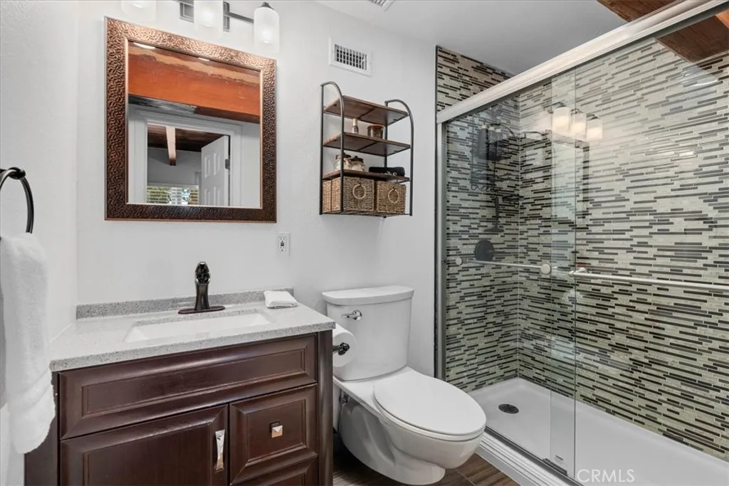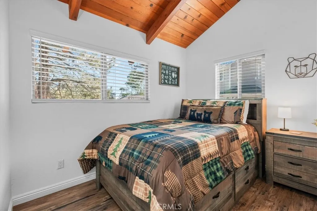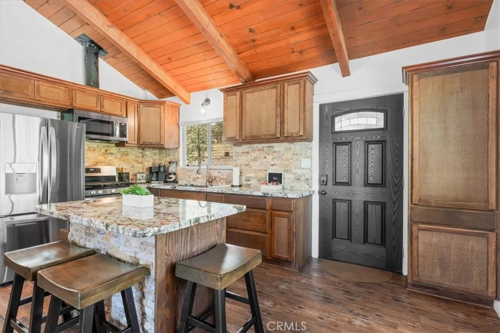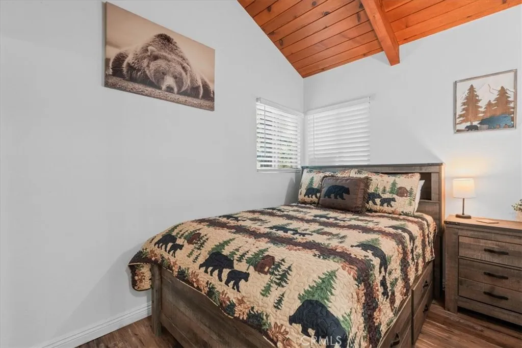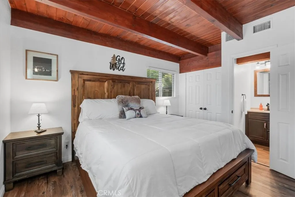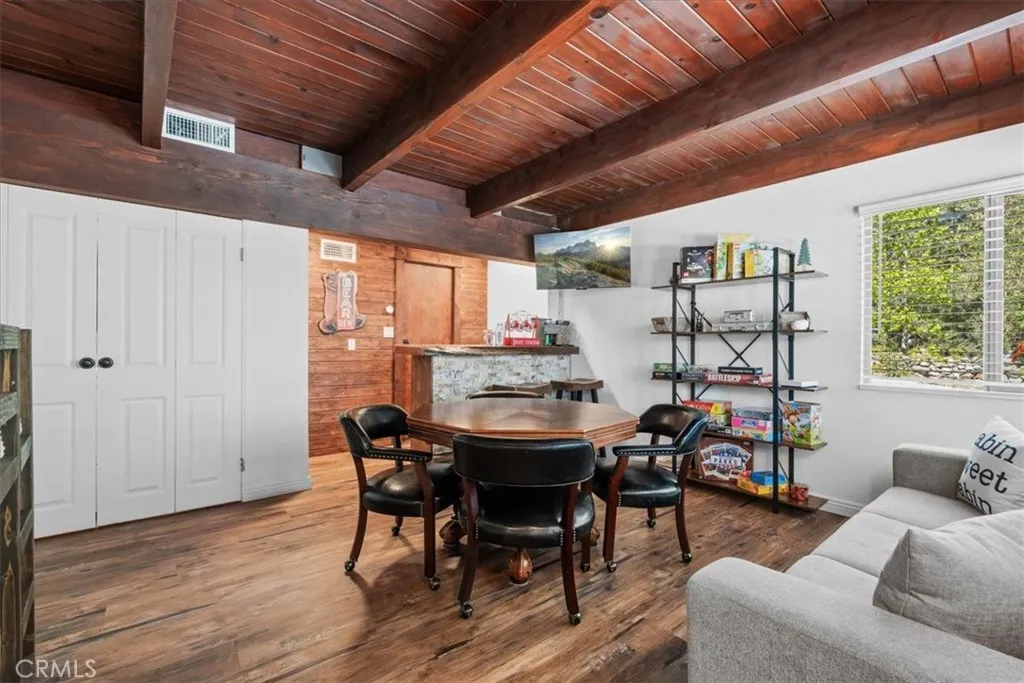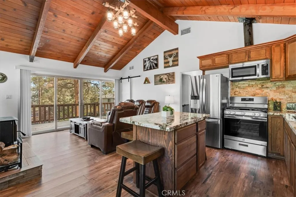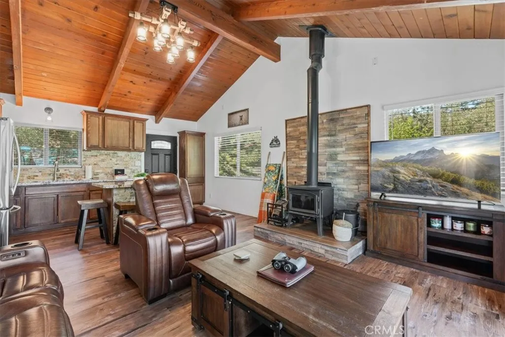 Sitting high above the clouds in picturesque Wrightwood, welcome to 5243 Desert View Dr.! Bring the RV and toys and that's about it, as this fully furnished home has everything you'll need to enjoy a getaway or investment in the Eastern an Gabriel Mountains. Offering three bedrooms and two bathrooms, this cabin is the perfect example of Mountain meets modern. Completely remodeled and taken down the studs in 2020, this majestic Mountain property blends designer granite finishes and vinyl dual pane windows, vinyl plank laminate and wood like tile flooring, stainless appliances with traditional features like knotty pine tongue and groove ceilings, open beam effects and an awesome free-standing wood burning stove that's not only beautiful but super productive. Two well appointed bedrooms and a full bathroom on the main floor, along with a large slider to your rear deck and balcony which overlook the Desert floor and your large backyard. Downstairs, the Primary Suite is your zen zone, with walk in shower that features a gorgeous tile overlay. The downstairs area also sports your family room/game room equipped with bar and access to the rear yard, more storage and nifty laundry closet. Outside, paramount views to the South from the front deck and peek a boo views to the North from your rear patio give perspective on how special this Desert View area is! New concrete driveway and stairs, room to park 6 plus cars, any size RV or Fifth wheel and still have room to play in the snow or develop your own fruit or veggie garden give the best of all worlds! Other amenities include A/C, water softener, forced air central heat, smart thermostat and keyless entry. This stunning property is ready for a BNB or weekend retreat and relaxation home straight away, but could also work as a primary residence and is only a quick 5 minute drive to the village, Elementary School and 10 minutes from the famous Mountain High Ski Resort! Come change your latitude with this stunner in sleepy Wrightwood!