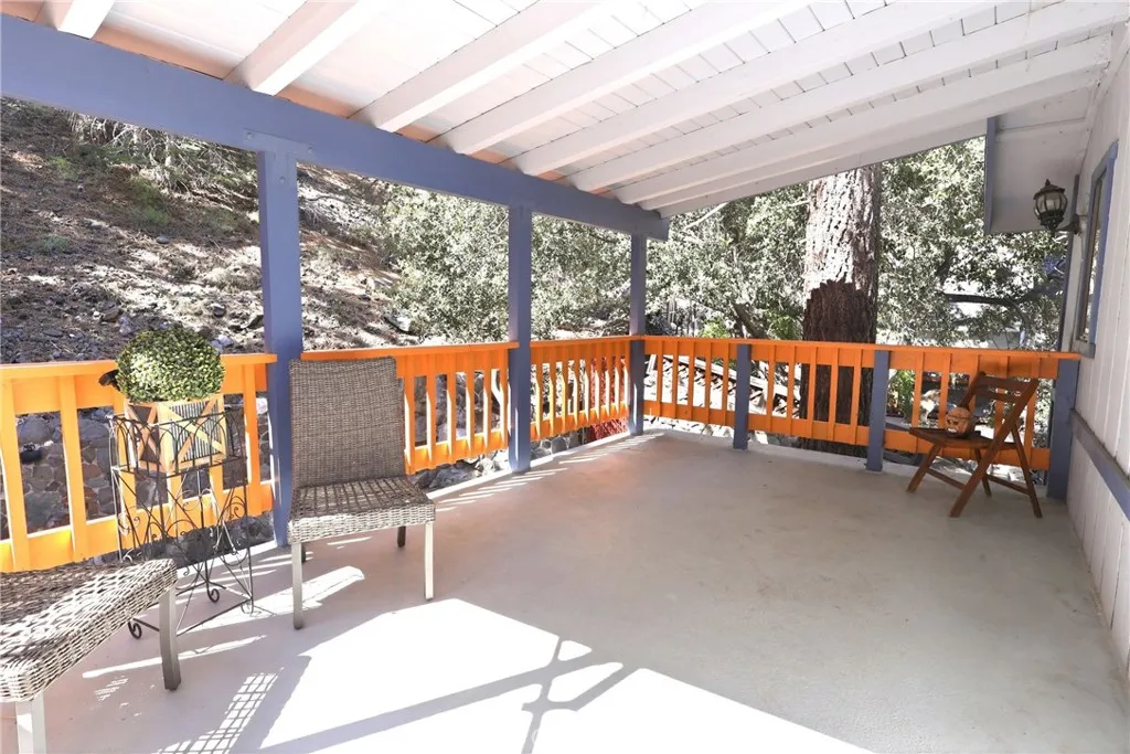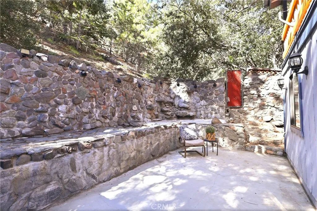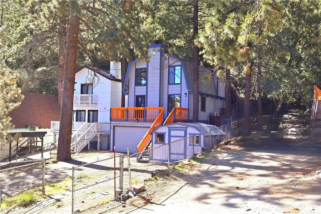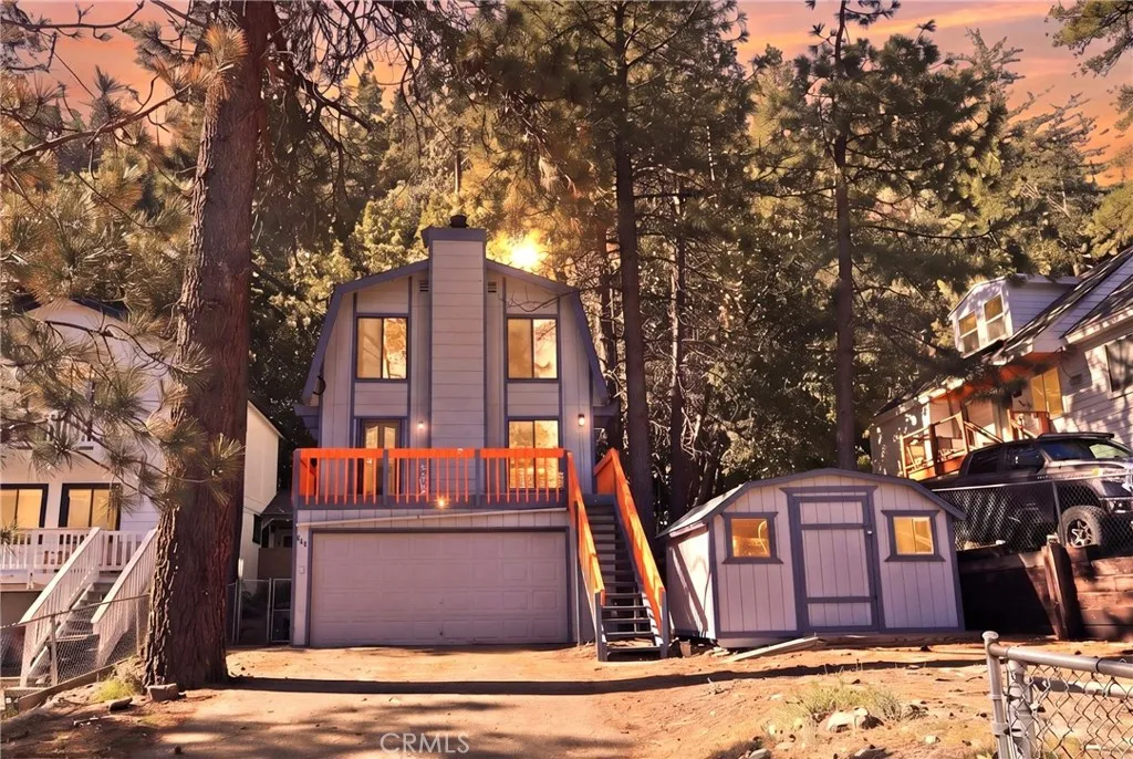 Charming tri-level mountain retreat nestled among mature pines with dual driveways and a 2-car garage—offering rare parking flexibility in a mountain setting. Built in 1987, this 3-bedroom, 1.5-bath home features approximately 1,640 sq ft of living space. The main level welcomes you with a spacious living room showcasing a cozy stone fireplace, wood-beamed ceilings, and abundant natural light. The adjacent kitchen offers ample cabinetry, updated countertops, and a functional layout that flows into a dedicated dining area—perfect for everyday living or entertaining. Step outside to an elevated deck surrounded by trees, creating a peaceful outdoor setting, plus a lower patio area with custom stonework that adds to the property’s charm and usability. The tri-level layout provides separation of space, with a bedroom on the entry level (garage level) and additional bedrooms on the upper floor. Interior features include wood-style flooring, ceiling fans, and a mix of updated and original character throughout. Additional highlights include a 10x12 storage shed (included), and two separate driveways—one approximately 27’ deep x 13’ wide and a second approximately 46’ deep x 18’ wide—ideal for multiple vehicles, guests, or recreational storage. A great opportunity for a full-time residence, second home, or investment in a desirable mountain setting.