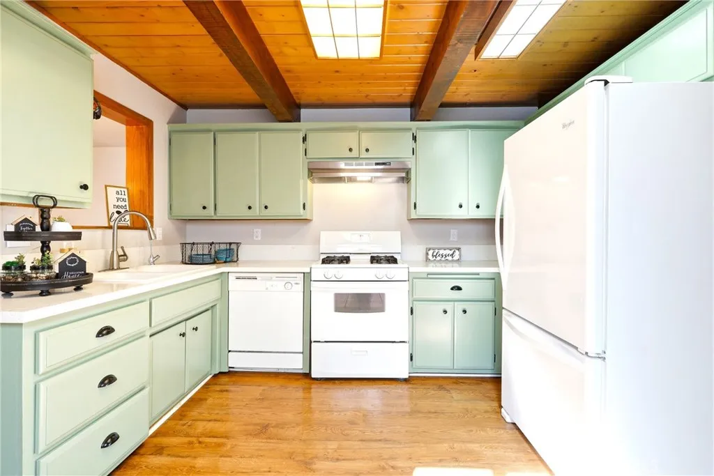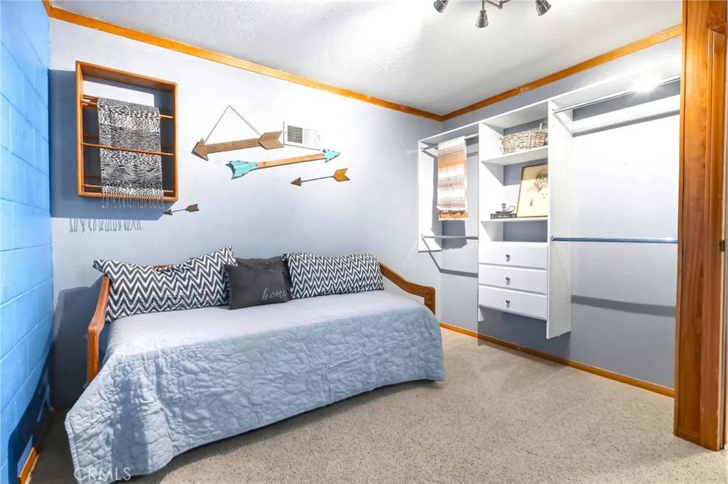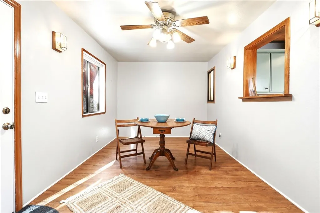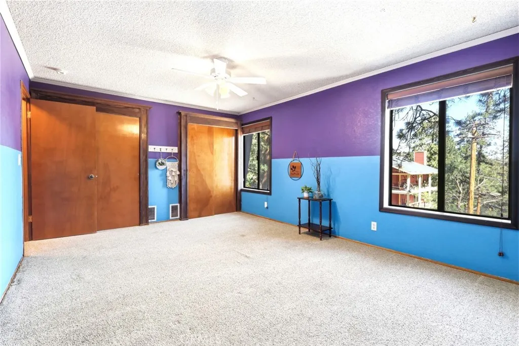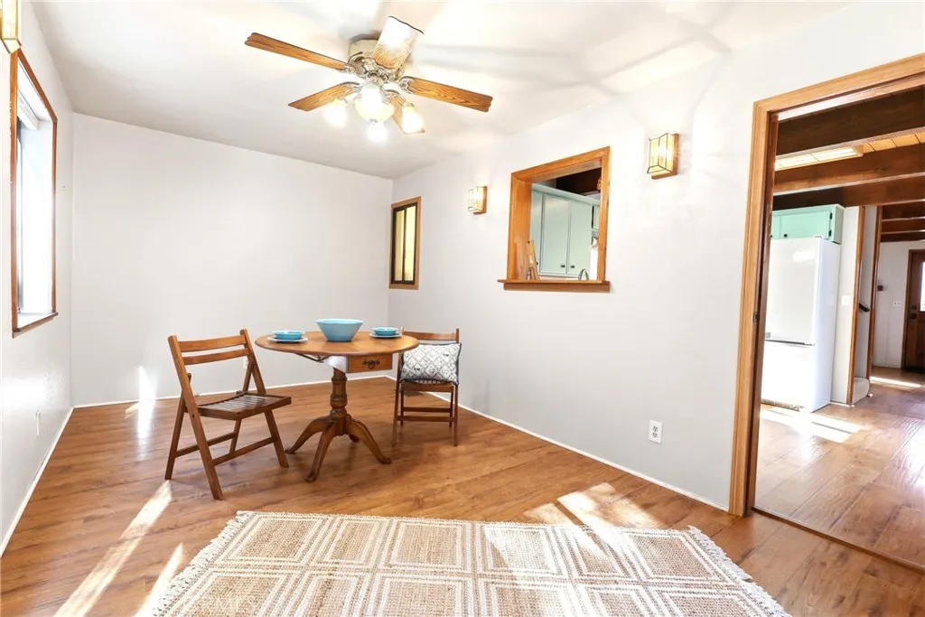 Charming tri-level mountain retreat nestled among mature pines with dual driveways and a 2-car garage—offering rare parking flexibility in a mountain setting. Built in 1987, this 3-bedroom, 1.5-bath home features approximately 1,640 sq ft of living space. The main level welcomes you with a spacious living room showcasing a cozy stone fireplace, wood-beamed ceilings, and abundant natural light. The adjacent kitchen offers ample cabinetry, updated countertops, and a functional layout that flows into a dedicated dining area—perfect for everyday living or entertaining. Step outside to an elevated deck surrounded by trees, creating a peaceful outdoor setting, plus a lower patio area with custom stonework that adds to the property’s charm and usability. The tri-level layout provides separation of space, with a bedroom on the entry level (garage level) and additional bedrooms on the upper floor. Interior features include wood-style flooring, ceiling fans, and a mix of updated and original character throughout. Additional highlights include a 10x12 storage shed (included), and two separate driveways—one approximately 27’ deep x 13’ wide and a second approximately 46’ deep x 18’ wide—ideal for multiple vehicles, guests, or recreational storage. A great opportunity for a full-time residence, second home, or investment in a desirable mountain setting.