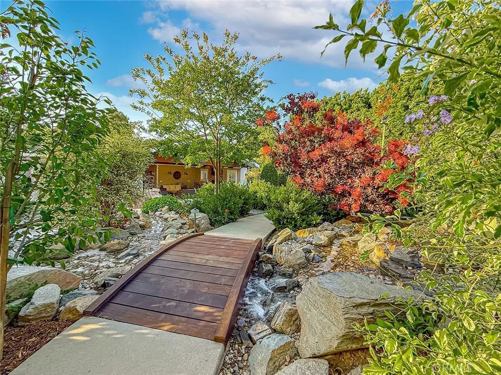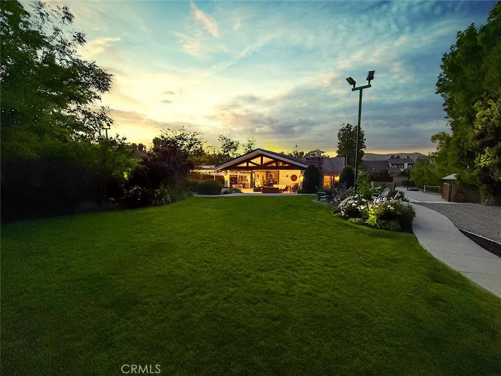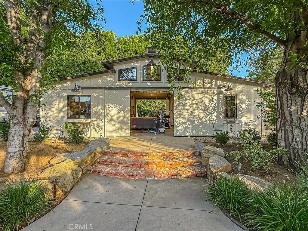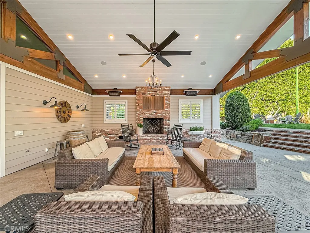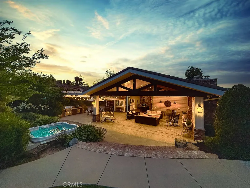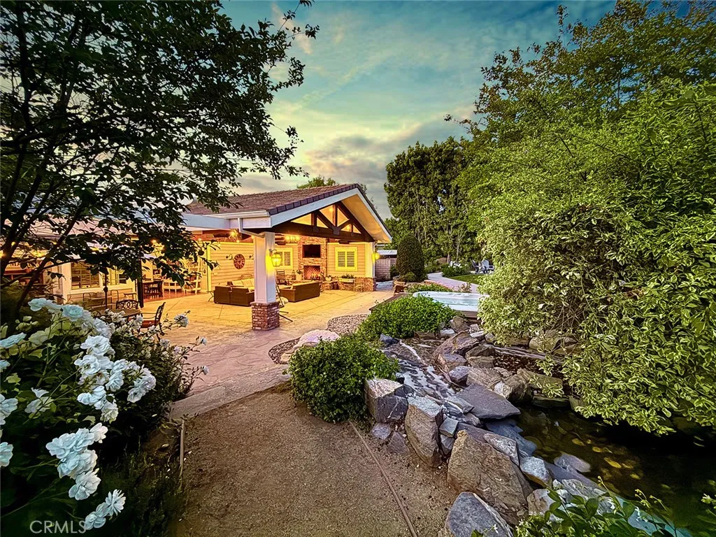 Welcome to 186 Stonebrook, a rare single story farmhouse-inspired home set on a large approximately 32,670 sq ft lot, tucked on a cul-de-sac in the highly desirable Coyote Hills area off Sinaloa and Highland, where luxury and a relaxed country feel come together. From the moment you arrive, the front yard makes a lasting impression with dry river rock, blooming roses, and mature trees. Inside, vaulted ceilings, natural light, and a striking red brick fireplace define the main living space. Expansive folding glass doors open fully, creating a seamless indoor outdoor connection. The kitchen offers stunning upgrades, a butcher block island, and a farmhouse sink beneath a window overlooking the yard. Adjacent library with built-in cabinetry and side yard access. Solid core doors, recessed LED lighting, and numerous upgrades run throughout. Both bathrooms have been fully renovated, most recently in 2025. The backyard is designed for year-round enjoyment with an incredible sense of space, lush green grass, and room to truly spread out. A spectacular covered patio of approximately 780 sq ft features a hardwood tongue and groove ceiling, chandeliers, recessed LED lighting, an industrial fan, and four gas heaters, along with an outdoor fireplace and TV, with the vaulted ceiling continuing from inside to out. Additional outdoor features include a lattice patio cover off the kitchen, built in BBQs, above ground jacuzzi spa, pondless water feature, DG and concrete pathways, master bedroom courtyard, and extensive landscape lighting. The barn has been highly upgraded and offers approximately 864 sq ft of interior space plus an additional 144 sq ft of storage. Complete with concrete flooring, electrical, gas, and plumbing, this versatile structure features sliding barn doors, a rear roll up door for drive through access, and is well suited for a workshop, guest house conversion, or a variety of uses. The property also offers rare RV access extending approximately 280 feet from the street to the rear of the lot. Major infrastructure upgrades include a 400 amp electrical service with subpanels servicing the home, backyard, and barn, along with a gas line extended to the barn and sewer line improvements. Additional features include epoxy garage flooring, tankless water heater, updated HVAC components, and included security system. Lynx gas grill and Big Green Egg BBQ are included. Located within the Fountainwood community with a low HOA