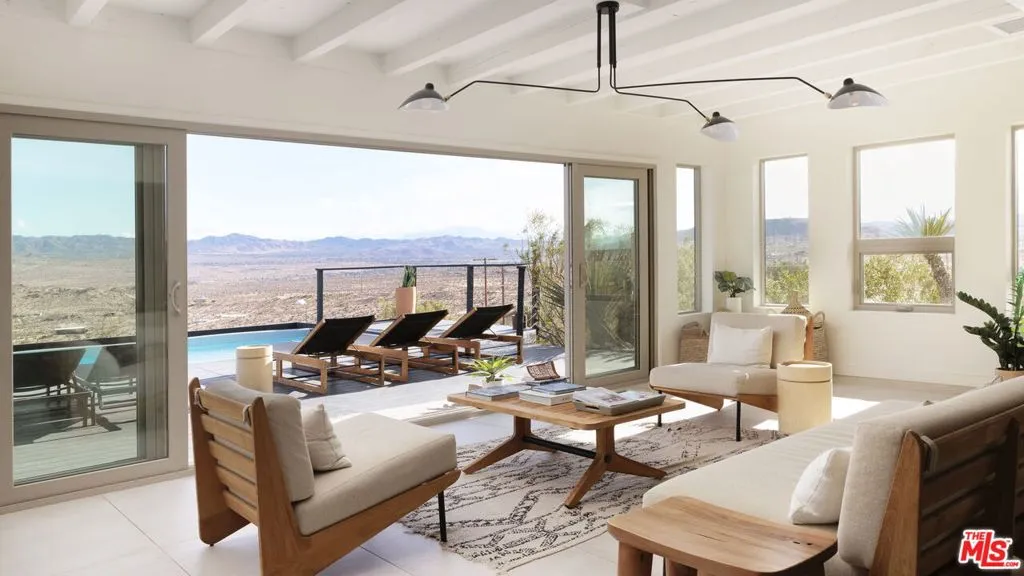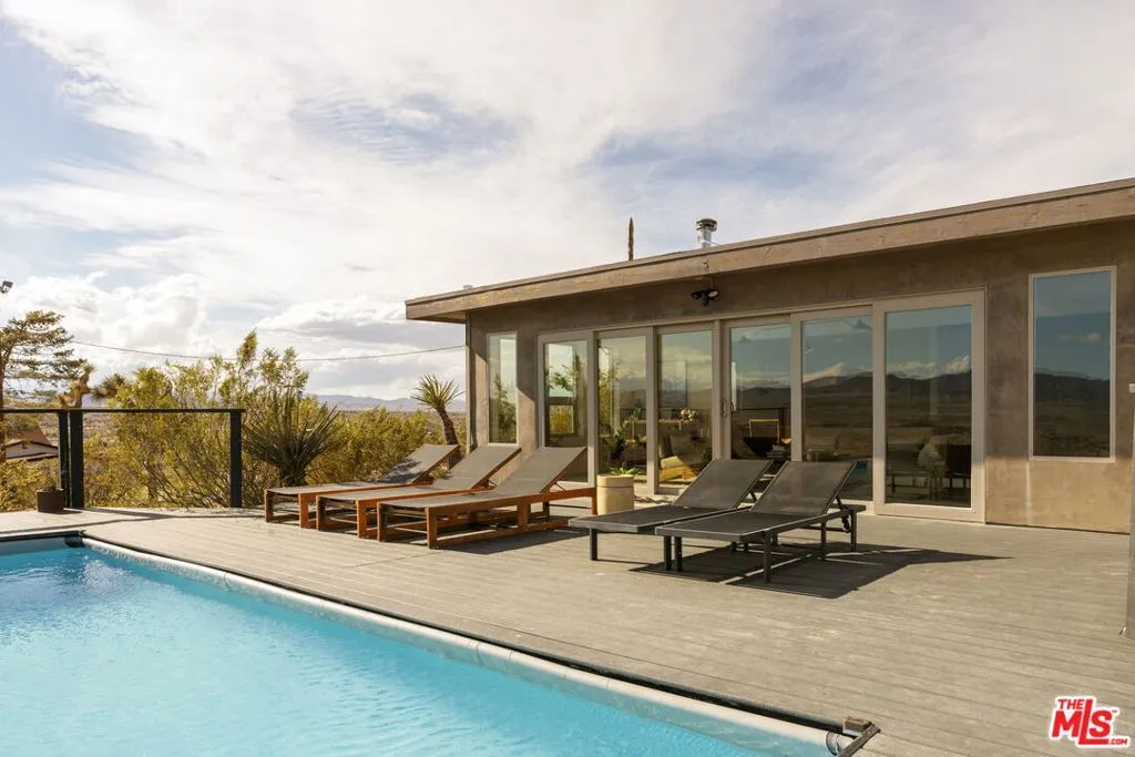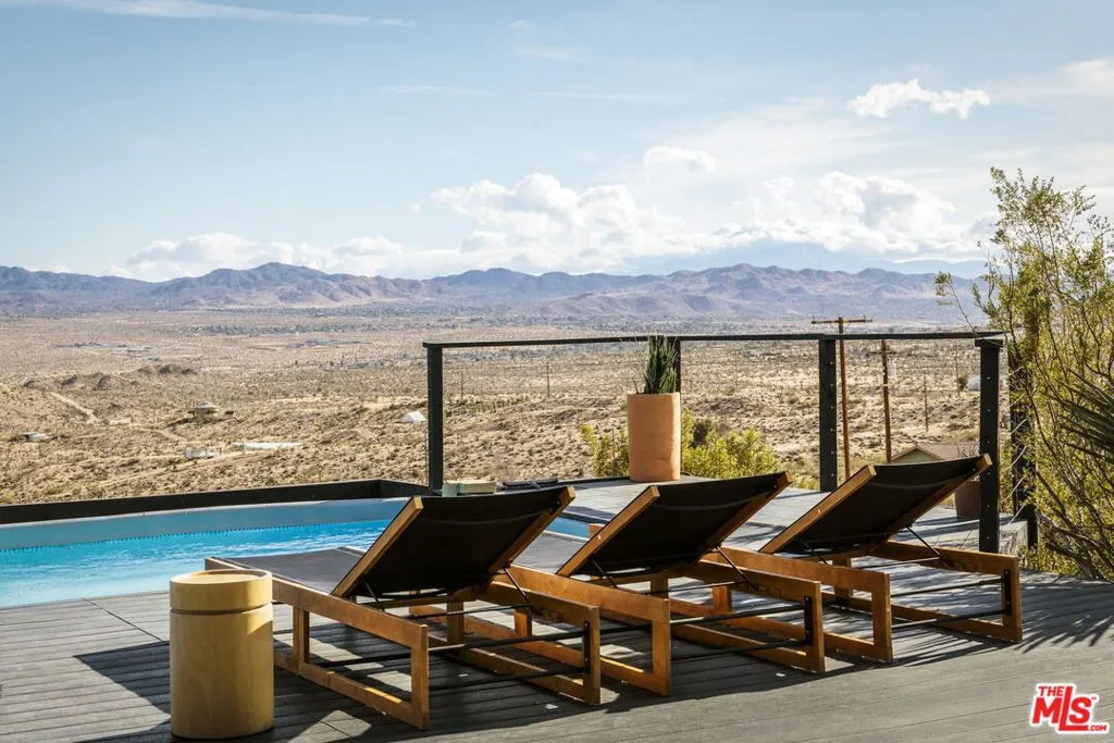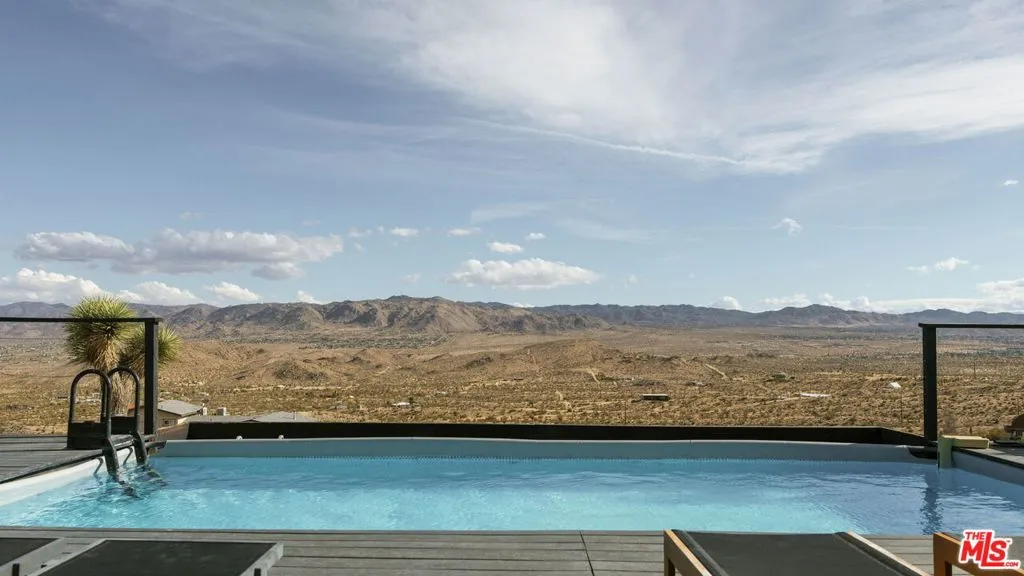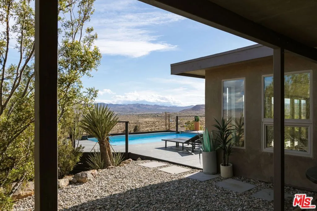 Welcome to Bartlett Ridge, a reimagined Mid-Century retreat set on 2.5 private acres in one of the most coveted enclaves of the high desert, where sweeping panoramic views stretch across the Mojave to the crest of Joshua Tree National Park. This fully renovated Mid-Century gem blends vintage soul with modern luxury, offering a seamless indoor-outdoor living experience designed for the ultimate desert escape. Natural light fills the open-concept living space, where beamed ceilings and expansive glass frame the surrounding landscape. Offering three bedrooms and two bathrooms, the home is thoughtfully designed for both comfort and ease of living. A cozy wood-burning stove anchors the space, while the updated kitchen flows effortlessly into the main living and dining areas. Sliding glass walls open to the outdoors, creating a fluid connection between the interior and the surrounding desert setting. Outside, a striking infinity-edge pool and expansive deck take center stage, perfectly positioned for sunset lounging, stargazing, and unforgettable gatherings under wide open skies. Currently operating as a successful short-term rental, the property offers strong appeal for investors seeking a high-performing desert asset. With its premium location, privacy, and standout design, Bartlett Ridge delivers a rare opportunity to own a high-performing desert retreat that seamlessly blends lifestyle, income potential, and long-term value.