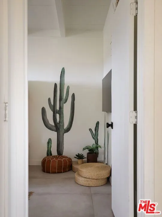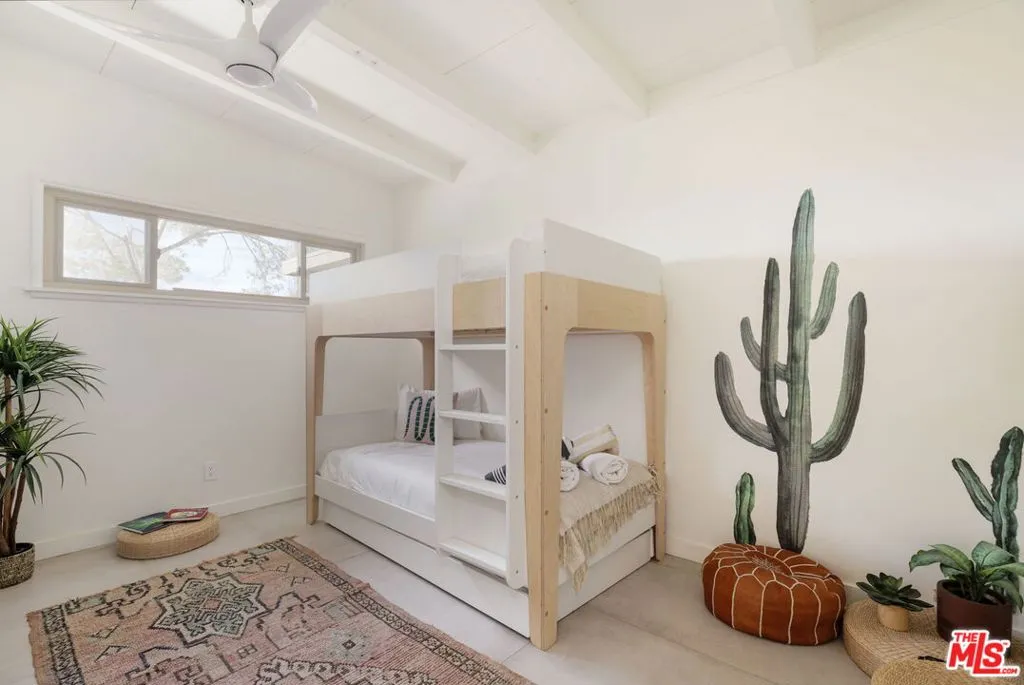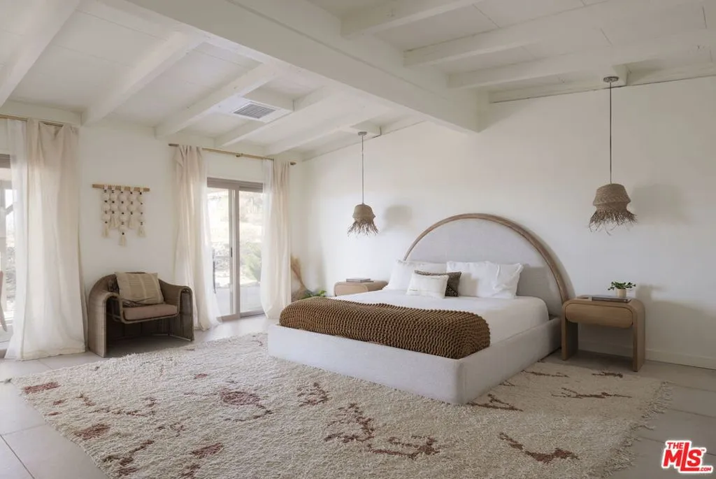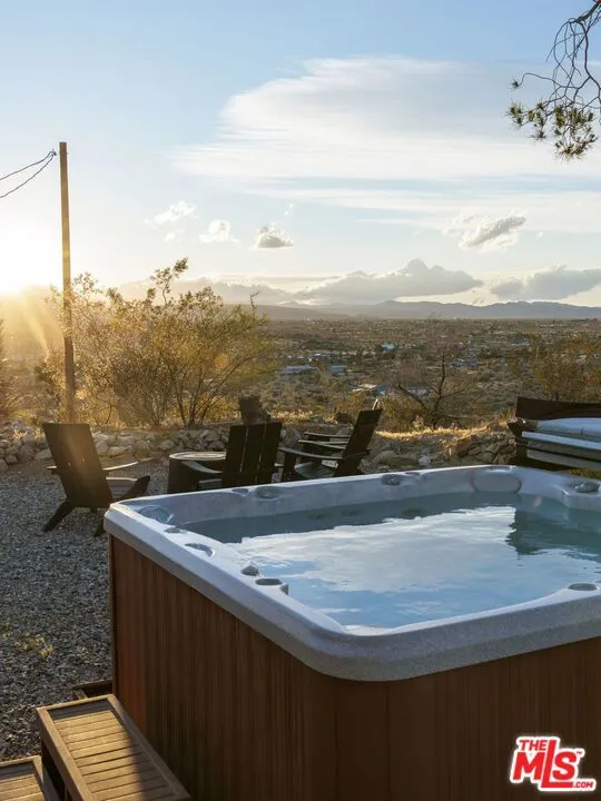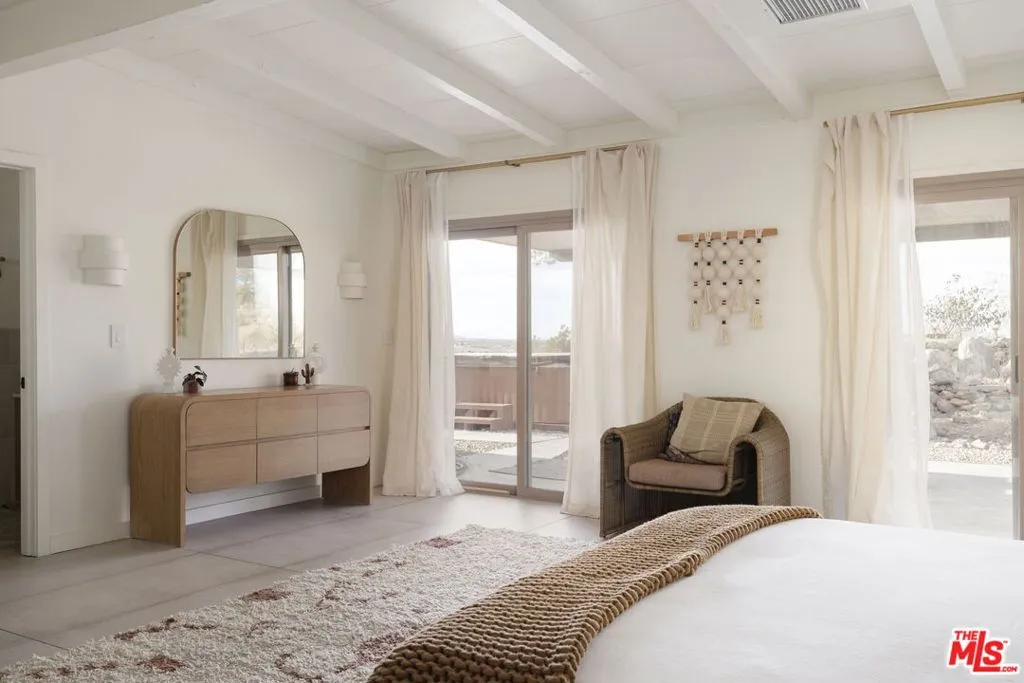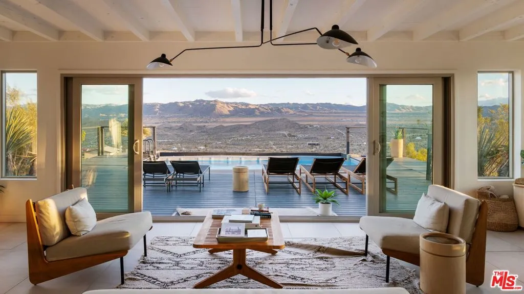 Welcome to Bartlett Ridge, a reimagined Mid-Century retreat set on 2.5 private acres in one of the most coveted enclaves of the high desert, where sweeping panoramic views stretch across the Mojave to the crest of Joshua Tree National Park. This fully renovated Mid-Century gem blends vintage soul with modern luxury, offering a seamless indoor-outdoor living experience designed for the ultimate desert escape. Natural light fills the open-concept living space, where beamed ceilings and expansive glass frame the surrounding landscape. Offering three bedrooms and two bathrooms, the home is thoughtfully designed for both comfort and ease of living. A cozy wood-burning stove anchors the space, while the updated kitchen flows effortlessly into the main living and dining areas. Sliding glass walls open to the outdoors, creating a fluid connection between the interior and the surrounding desert setting. Outside, a striking infinity-edge pool and expansive deck take center stage, perfectly positioned for sunset lounging, stargazing, and unforgettable gatherings under wide open skies. Currently operating as a successful short-term rental, the property offers strong appeal for investors seeking a high-performing desert asset. With its premium location, privacy, and standout design, Bartlett Ridge delivers a rare opportunity to own a high-performing desert retreat that seamlessly blends lifestyle, income potential, and long-term value.