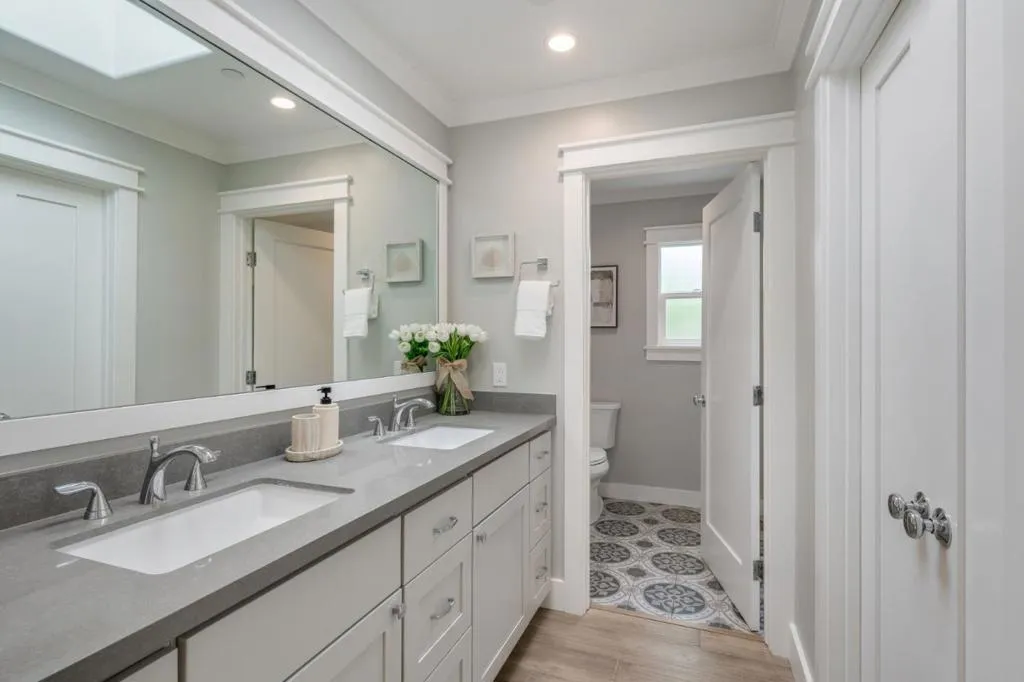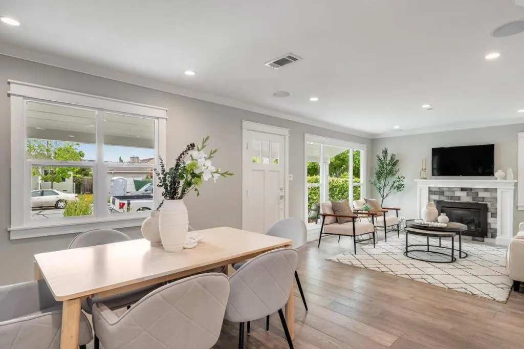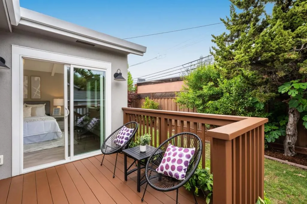 Where form, function, scale, and light seamlessly coexist, this extensively renovated 4BR/2BA showpiece in San Mateo Village offers a transformative living experience. Elegantly composed and spanning approximately 1,536 SF, the refined floor plan is elevated by wide plank flooring, crown moldings, premium millwork, contemporary fixtures, and a designer color palette. The spacious living room flows effortlessly into the dining area and ideally positioned kitchen, beautifully appointed with quartz countertops, shaker cabinetry, a gas range, and stainless-steel appliances. Privately situated, the magnificent primary suite is distinguished by a soaring cathedral open-beam ceiling, direct access to the rear deck, a walk-in closet, and a sumptuous bath featuring a skylight, dual vanities, and an impressive, oversized shower. Three additional bedrooms, a full bath, a laundry room, and an attached one-car garage complete the interior. Outside, an inviting lounging terrace transitions seamlessly to a pergola-covered dining pavilion with integrated heaters, a built-in barbecue, and an artisan pizza oven, creating an exceptional setting for year-round outdoor enjoyment. A sizable lawn, expansive paved side yard, and storage shed further enhance the thoughtfully designed grounds.