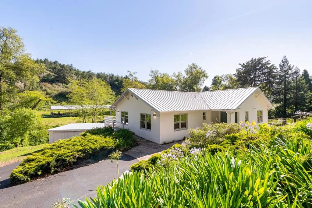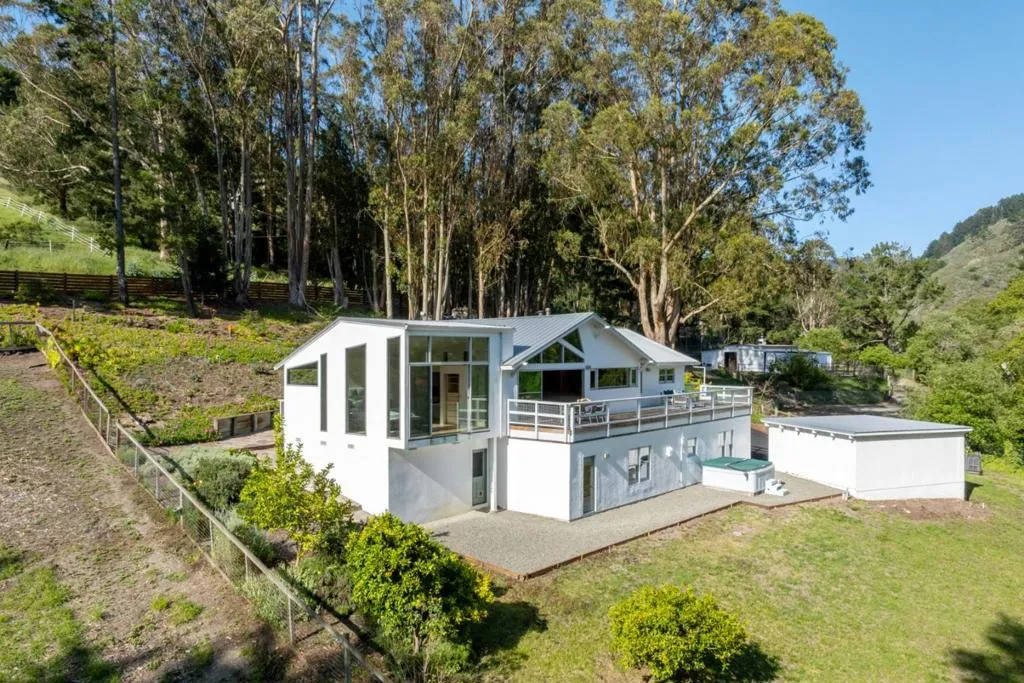 Set on approximately 8.5 private acres in coveted Half Moon Bay, this beautifully remodeled contemporary ranch offers the rare combination of refined living and exceptional equestrian amenities just minutes from town. The home has been thoughtfully redesigned with a clean, modern aesthetic and an effortless indoor-outdoor flow. A dramatic living room anchored by an architectural steel fireplace opens to large deck while the formal dining area creates an elegant setting for entertaining. The chefs kitchen is finished with European cabinetry and top-tier appliances including a Gaggenau stove and steamer, Miele dishwasher, oven and refrigerator, and wine fridge. A spacious family room and office add flexibility for both relaxed living and working from home. A well-designed barn offers three stalls, tack room and hay storage, complemented by paddocks, an arena, and open pasture. Direct trail access makes it ideal for riders seeking both privacy and immediate connection to the coastal trail system. Detached two-car garage, separate one-bedroom mobile home with kitchen, living room and bathperfect for guests or caretaker use. Gated and peaceful, yet just minutes from the charm of downtown and the coast, this is a rare opportunity to own a turnkey ranch property.
