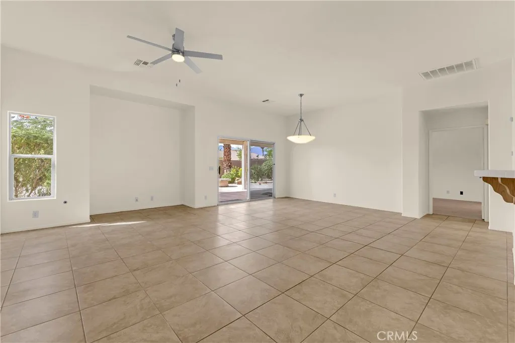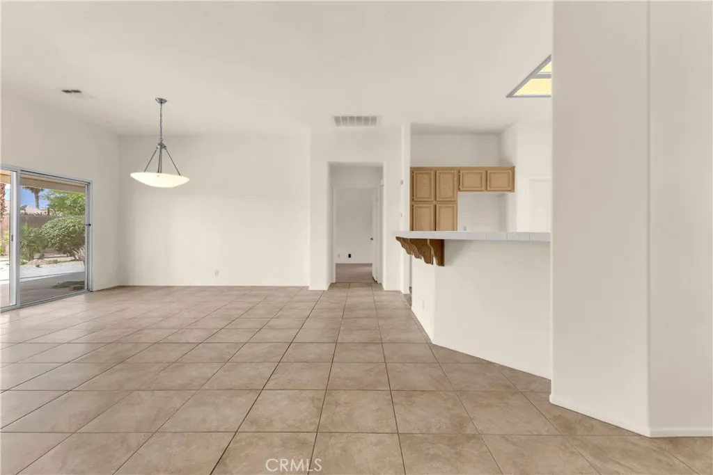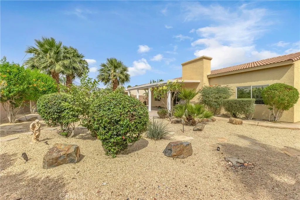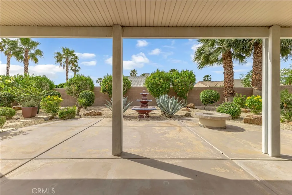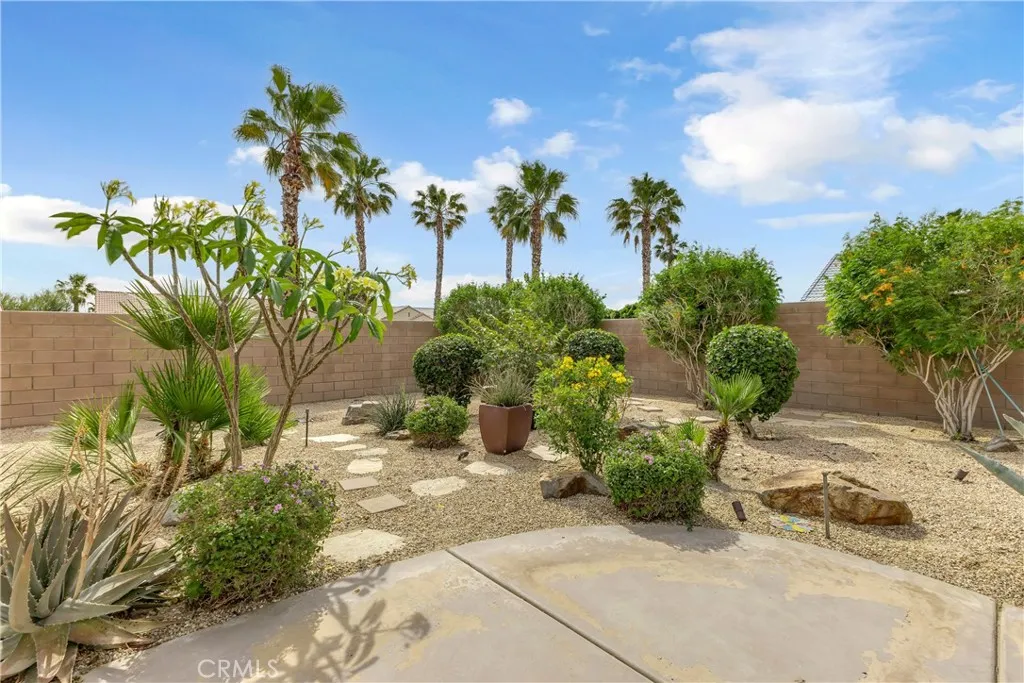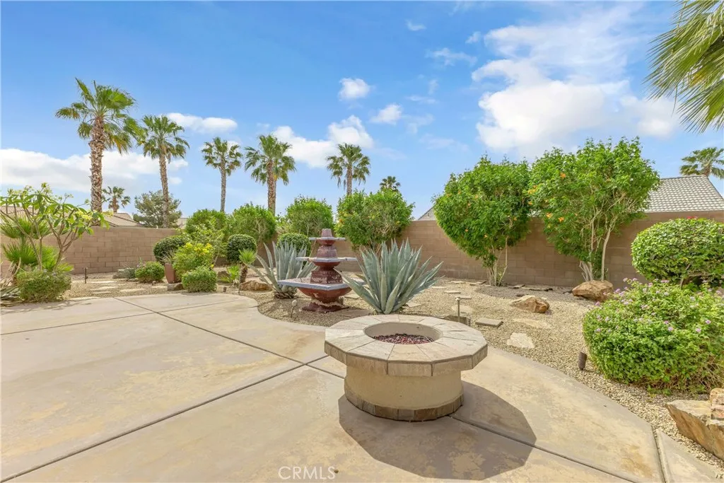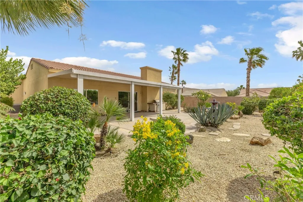 This single level home sits on a quiet corner lot with mature desert landscaping and a clean, well maintained exterior that creates a strong first impression, with curved walkways, palms, and layered plantings adding both character and privacy while the setting captures open sky and distant mountain views; inside, the layout opens immediately into a large main living area with high ceilings, expansive tile flooring, and abundant natural light, giving the space a bright and functional feel that easily accommodates both everyday living and larger gatherings, while the adjacent dining area connects directly to the backyard through wide sliding glass doors, reinforcing an easy indoor outdoor flow; the kitchen is positioned just off the main living space with generous counter space, a wraparound breakfast bar, and ample cabinetry, offering a practical footprint that allows for casual seating and clear sightlines into the living and dining areas; the primary suite is set apart with brand new LVP flooring, a spacious layout, and direct access to a well sized bathroom and walk in closet, creating a comfortable retreat within the home, while additional bedrooms also feature brand new LVP flooring and continue the same clean, move in ready condition with neutral finishes that allow flexibility for different uses; the backyard is designed for low maintenance enjoyment with desert landscaping, mature trees, and multiple seating areas, anchored by a covered patio that provides consistent shade and an outdoor built in grill area that supports year round use, while a central fountain feature adds a focal point and a sense of separation between entertaining and relaxation spaces; overall, the home offers a combination of open interior layout, practical design, and private outdoor space, positioned on a corner lot that enhances both curb appeal and livability.