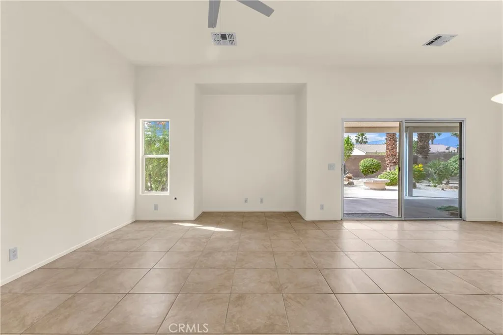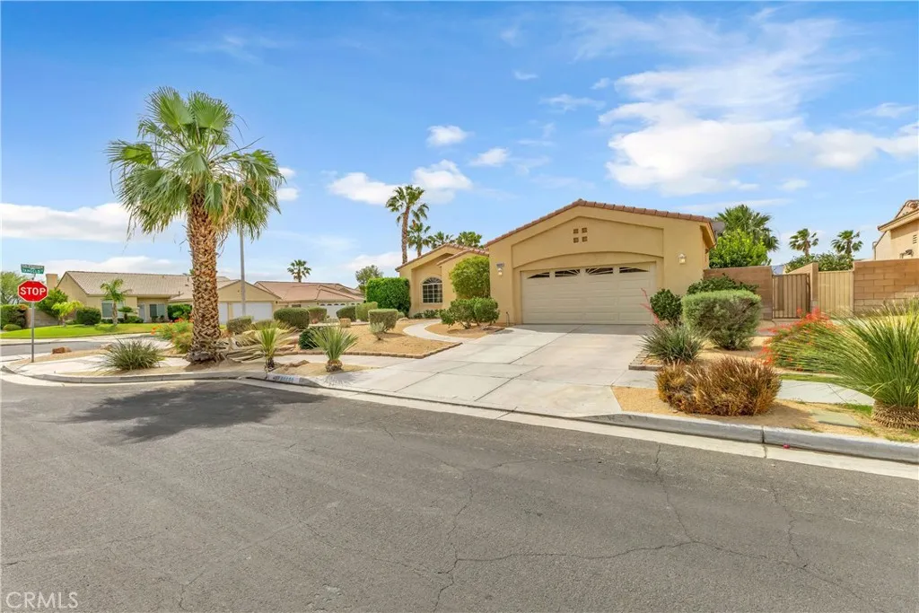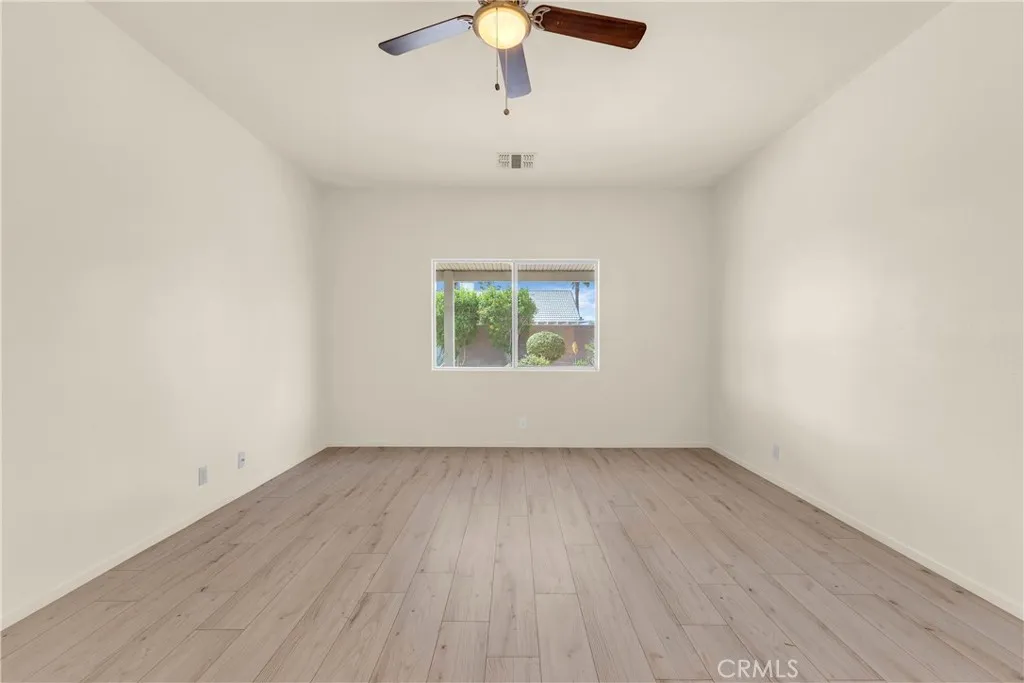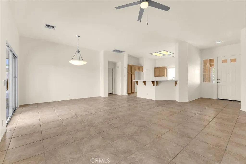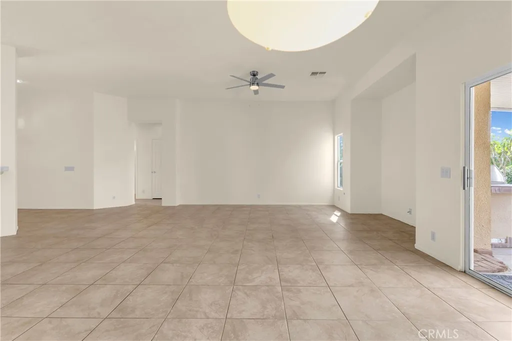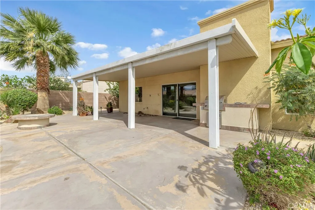 This single level home sits on a quiet corner lot with mature desert landscaping and a clean, well maintained exterior that creates a strong first impression, with curved walkways, palms, and layered plantings adding both character and privacy while the setting captures open sky and distant mountain views; inside, the layout opens immediately into a large main living area with high ceilings, expansive tile flooring, and abundant natural light, giving the space a bright and functional feel that easily accommodates both everyday living and larger gatherings, while the adjacent dining area connects directly to the backyard through wide sliding glass doors, reinforcing an easy indoor outdoor flow; the kitchen is positioned just off the main living space with generous counter space, a wraparound breakfast bar, and ample cabinetry, offering a practical footprint that allows for casual seating and clear sightlines into the living and dining areas; the primary suite is set apart with brand new LVP flooring, a spacious layout, and direct access to a well sized bathroom and walk in closet, creating a comfortable retreat within the home, while additional bedrooms also feature brand new LVP flooring and continue the same clean, move in ready condition with neutral finishes that allow flexibility for different uses; the backyard is designed for low maintenance enjoyment with desert landscaping, mature trees, and multiple seating areas, anchored by a covered patio that provides consistent shade and an outdoor built in grill area that supports year round use, while a central fountain feature adds a focal point and a sense of separation between entertaining and relaxation spaces; overall, the home offers a combination of open interior layout, practical design, and private outdoor space, positioned on a corner lot that enhances both curb appeal and livability.