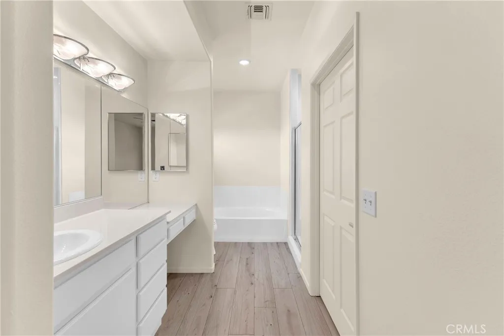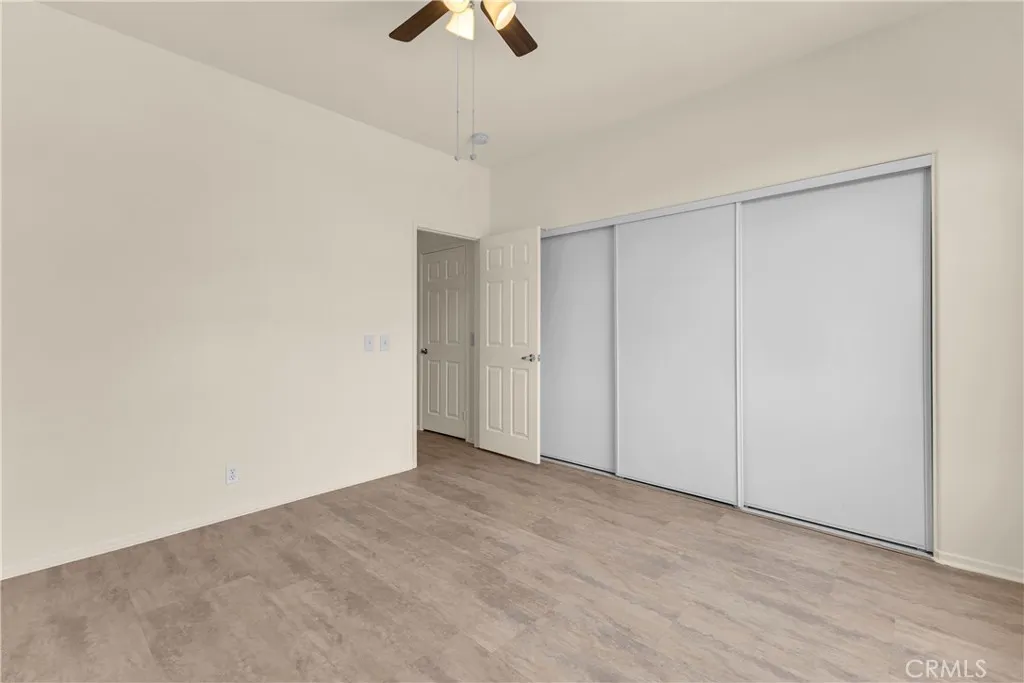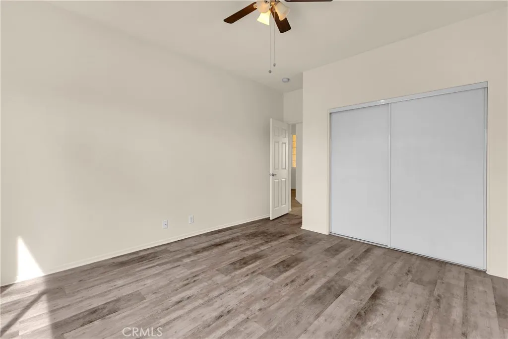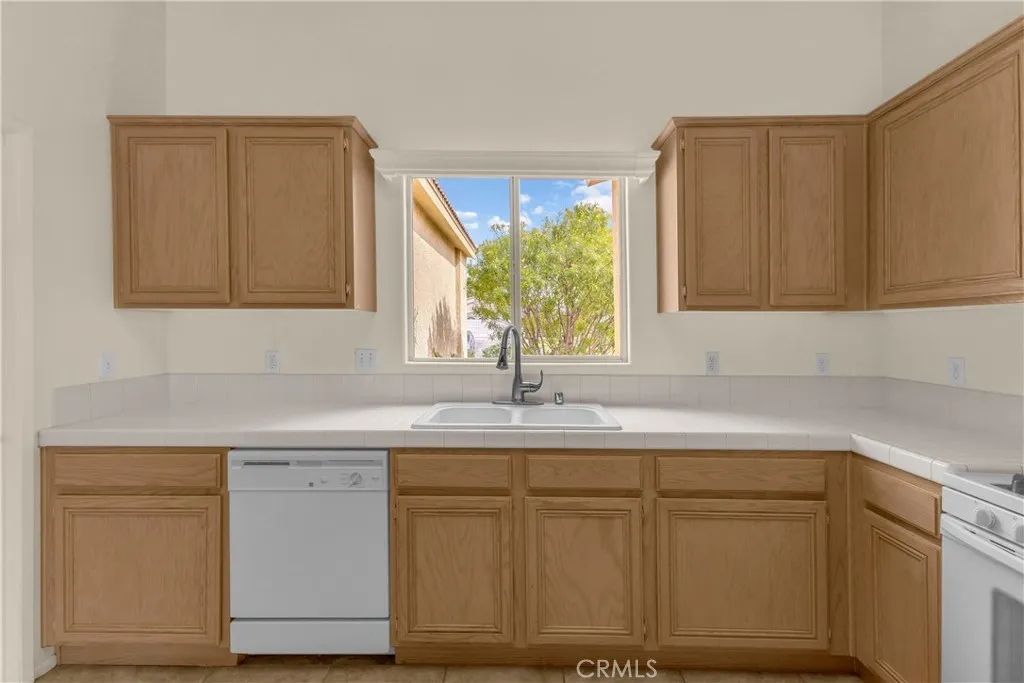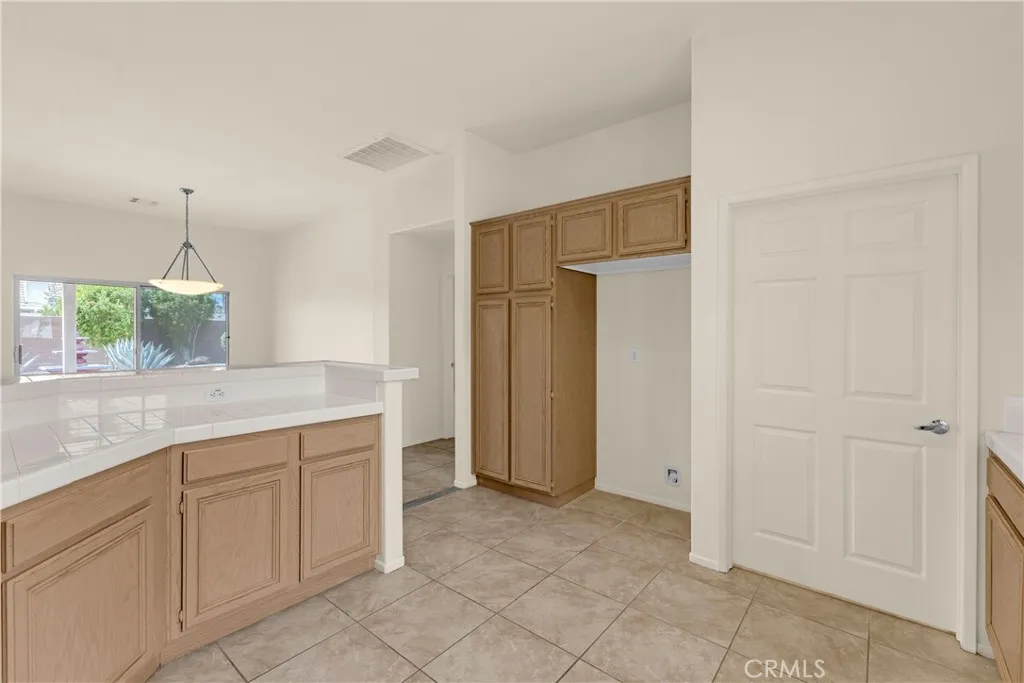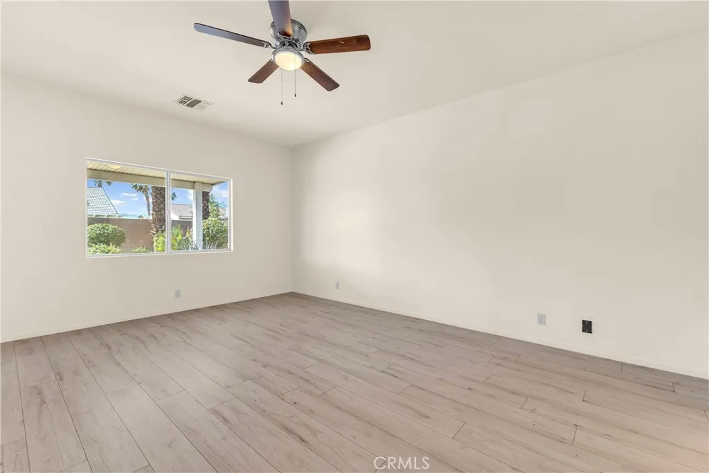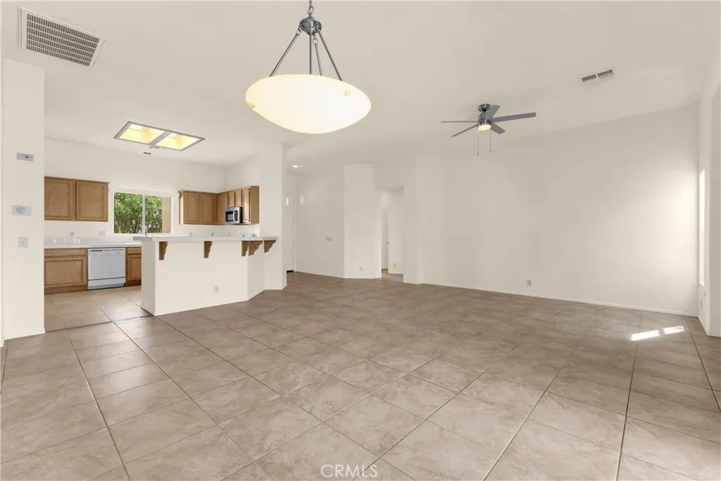 This single level home sits on a quiet corner lot with mature desert landscaping and a clean, well maintained exterior that creates a strong first impression, with curved walkways, palms, and layered plantings adding both character and privacy while the setting captures open sky and distant mountain views; inside, the layout opens immediately into a large main living area with high ceilings, expansive tile flooring, and abundant natural light, giving the space a bright and functional feel that easily accommodates both everyday living and larger gatherings, while the adjacent dining area connects directly to the backyard through wide sliding glass doors, reinforcing an easy indoor outdoor flow; the kitchen is positioned just off the main living space with generous counter space, a wraparound breakfast bar, and ample cabinetry, offering a practical footprint that allows for casual seating and clear sightlines into the living and dining areas; the primary suite is set apart with brand new LVP flooring, a spacious layout, and direct access to a well sized bathroom and walk in closet, creating a comfortable retreat within the home, while additional bedrooms also feature brand new LVP flooring and continue the same clean, move in ready condition with neutral finishes that allow flexibility for different uses; the backyard is designed for low maintenance enjoyment with desert landscaping, mature trees, and multiple seating areas, anchored by a covered patio that provides consistent shade and an outdoor built in grill area that supports year round use, while a central fountain feature adds a focal point and a sense of separation between entertaining and relaxation spaces; overall, the home offers a combination of open interior layout, practical design, and private outdoor space, positioned on a corner lot that enhances both curb appeal and livability.