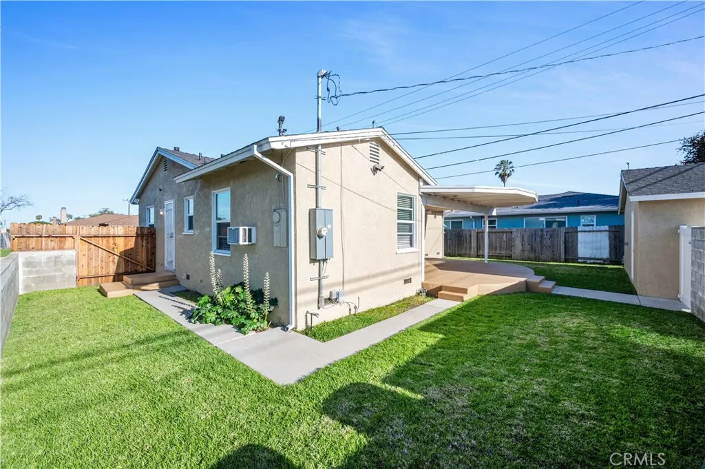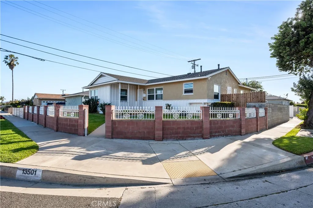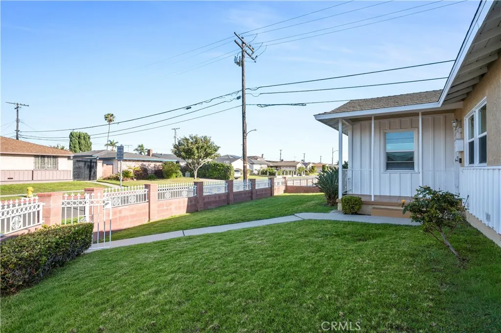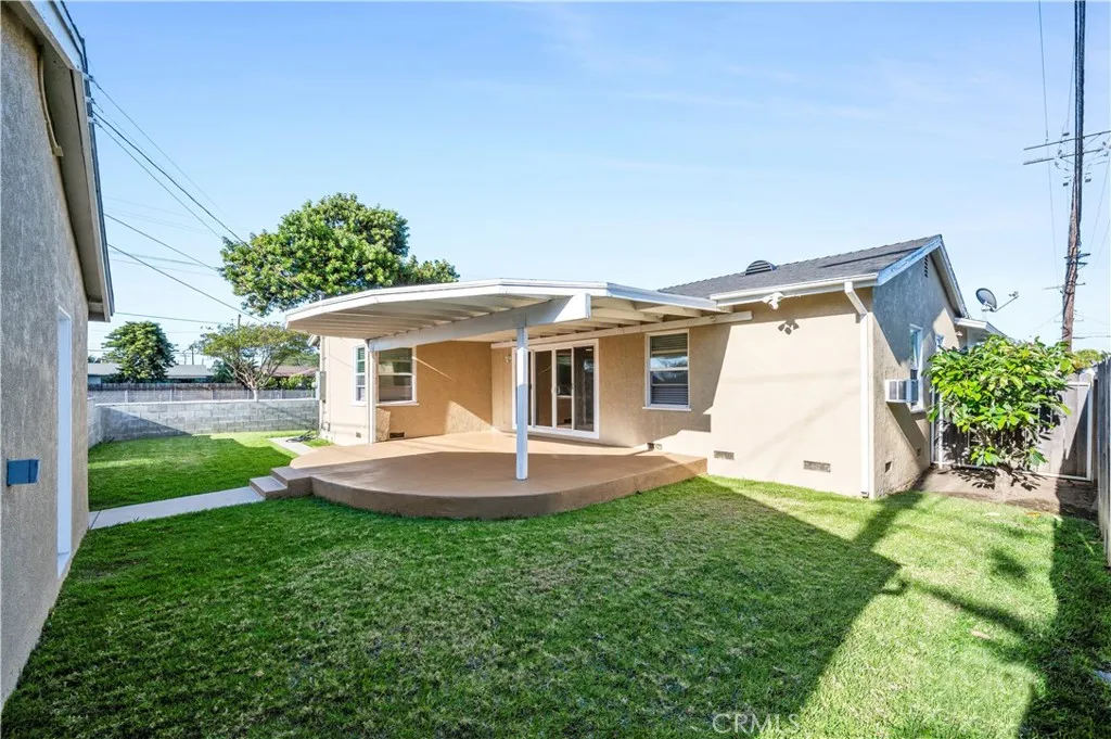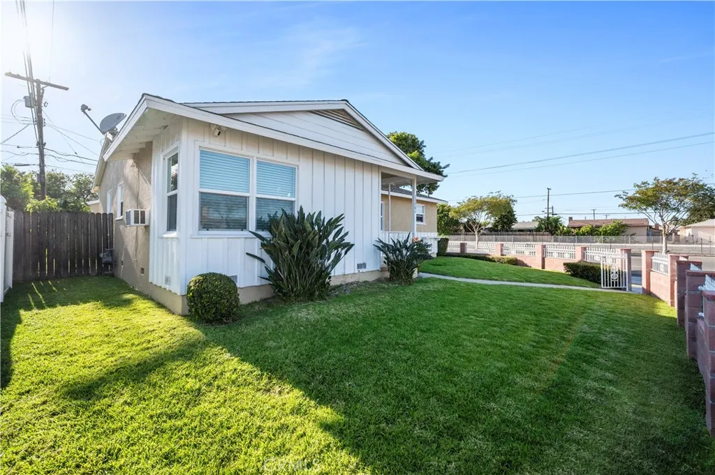 Located in the highly sought-after Hollypark neighborhood of Gardena, this well-maintained 3-bedroom, 2-bath home sits on a spacious corner lot and is filled with natural light throughout. A welcoming front porch leads into the generous main living area, where sliding glass doors open to the backyard, creating an easy indoor-outdoor flow. Recessed lighting and beautiful laminate flooring add a fresh, modern touch. Just off the living room, the dining area is perfectly positioned for everyday meals and effortless entertaining. The kitchen features warm wood cabinetry, granite countertops, and tile flooring, while a separate laundry room offers added convenience and extra storage. The functional floor plan provides privacy and flexibility, with one bedroom located on one wing of the home and two additional bedrooms on the other. One bedroom includes an attached bath with a walk-in shower. Both bathrooms feature an updated vanity with quartz countertops. All bedrooms are equipped with ceiling fans and mini A/C units for added comfort during warmer months. Step outside to the expansive covered patio overlooking a lush grassy yard—ideal for outdoor dining, relaxing in the sun, or enjoying evening gatherings. The detached garage is accessed through the backyard and is complemented by an extra-wide driveway for additional parking. Don’t miss this opportunity to own a lovingly cared-for home at an exceptional value in the South Bay.