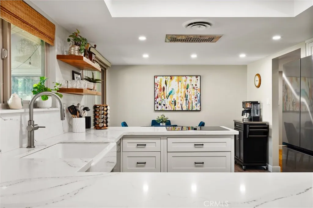 Move in ready with high quality improvements! This thoughtfully upgraded home showcases a stunning, light-filled kitchen featuring quartz countertops, a farmhouse sink, new stainless-steel appliances, and custom floating wood shelving that adds warmth & style. The open layout flows seamlessly into the living area, creating an inviting space perfect for both everyday living & entertaining. Enjoy Sundale golf course views from kitchen, fam rm & primary bdrm. The home features newer durable and stylish LVP flooring throughout the downstairs, complemented by plush newer carpeting upstairs. Both bathrooms have been tastefully remodeled with modern vanities, updated fixtures, and a sleek glass-enclosed walk-in shower that creates a spa-like retreat. Additional upgrades include a new water heater, updated electrical panel, and all-new outlets. A versatile flex room equipped with a split mini system offers efficient, customizable climate control—ideal for a home office, gym, or bonus space.