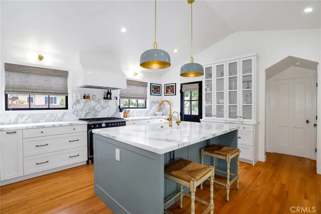 BIXBY KNOLLS! Built in 1941, poised majestically on just over a .25 acre lot, this home will appeal! The front yard faces Olive & Cartagena and boasts drought tolerant landscaping plus is completed with a white picket fence. Enter to appreciate the classic architecture & layout of the upscale 1940s era. Formal entry welcomes guests. Go through to the formal dining room - imagine hosting a dinner party. Formal living room features a fireplace, classic mantle & sconces. Details include classic 1940s hardware, trim & finishes. The double hung wood windows let in plenty of natural light in every room. Completely remodeled in 2021, the custom kitchen is the heartbeat of this home! Vaulted ceiling, Calcutta marble counters & backsplash, plus center island equipped with a Kohler farm sink, upscale faucet and an instant-hot water dispenser (perfect for morning tea), finished with Calcutta marble countertop and a breakfast bar. Custom cabinets include pan drawers, appliance storage, a built-in China cabinet with glass doors, plus a large built in pantry. Bertazzoni 36-inch range, hood, refrigerator, microwave & dishwasher. An LG laundry center is down the hall. Custom French doors open to the private backyard which creates an indoor outdoor ease of living and entertaining. Completing this level, privately situated at the back, is a main-floor primary suite, with it's own garden area. Upstairs are two ensuite bedrooms. The primary bedroom, with east & north windows enjoys plenty of natural light, two closets plus space for home office/seating area. The ensuite remodeled primary bath has a freestanding soaking tub, custom vanity & spacious shower. An additional bedroom w/dressing area (1940s feature) & ensuite bathroom with shower completes this level. Enhancing this home's value as well: Fully-owned solar system, roof replaced in 2021, two HVAC systems, all exterior siding replaced with HardieBoard. Completing this home is a two-car garage, workshop, basketball/play/sport area and a fully fenced backyard featuring an English garden-style hedge. This creates a private oasis and yet this home has a Walk score of 9.3. Stroll to First Fridays on Atlantic featuring music and community events. Enjoy the close proximity to Longfellow Elementary & Hughes Middle Schools. Shop at Fingerprints Music. Dine at Lola's, Nonna Mercato, Bake & Broil just a few of many other coffee shops, dining options & boutiques on Atlantic Ave. Welcome home!
