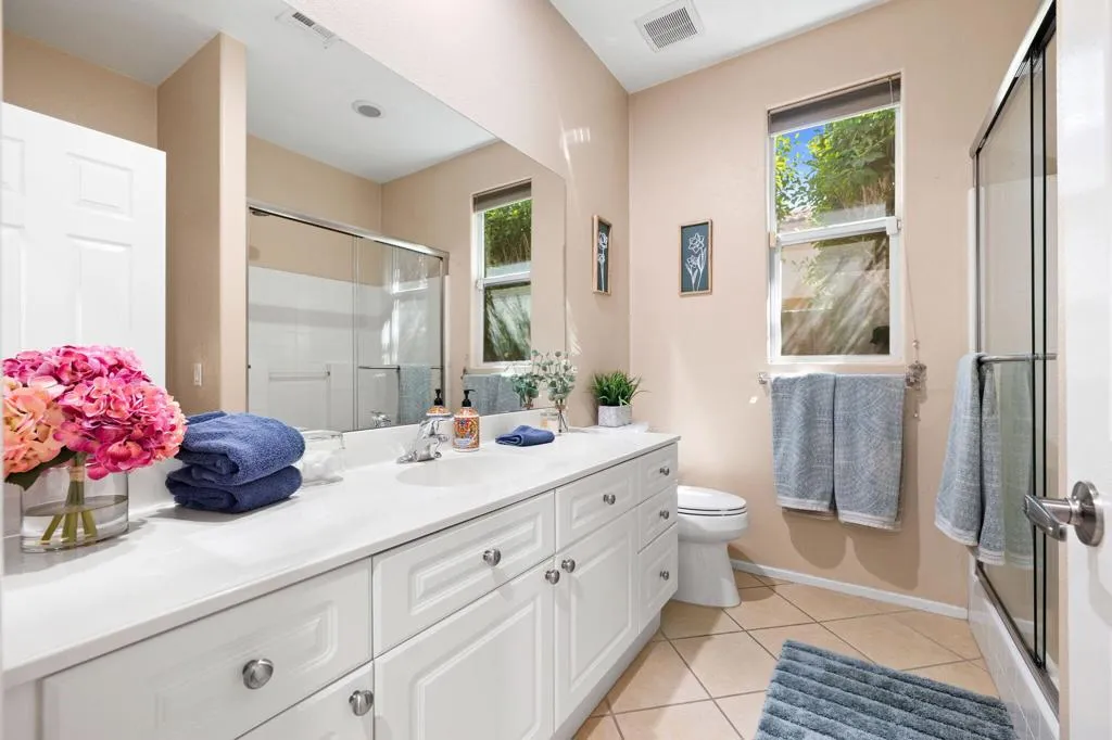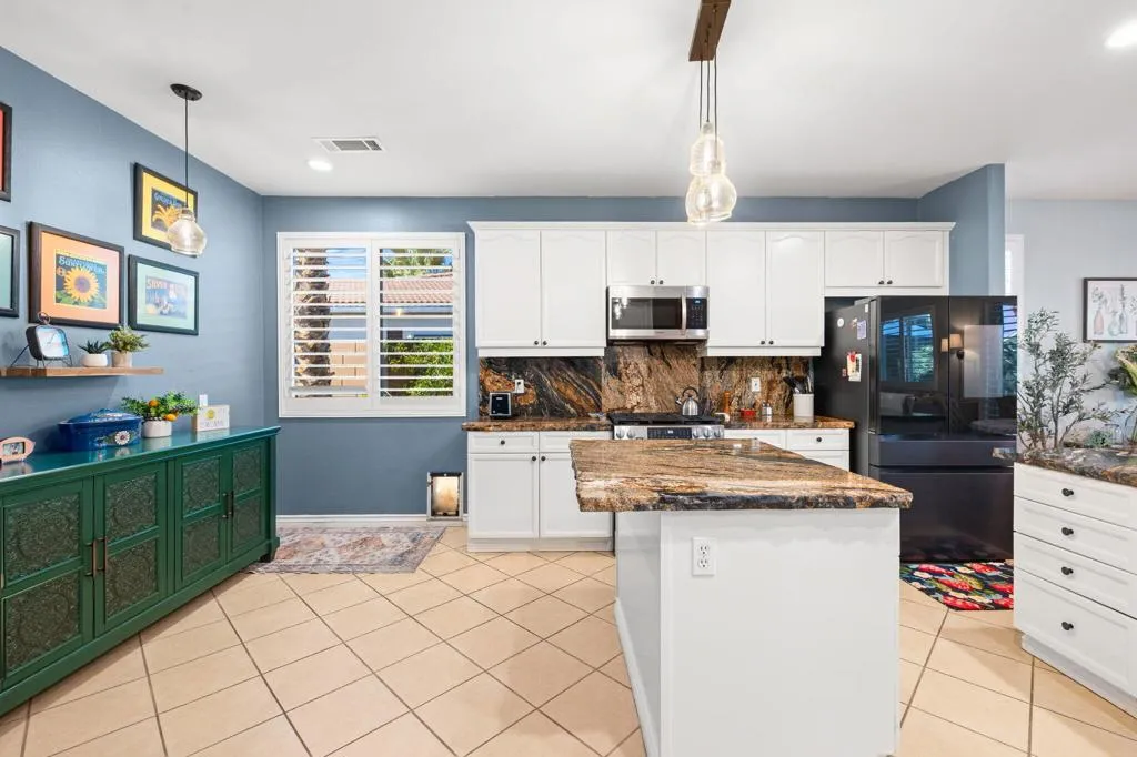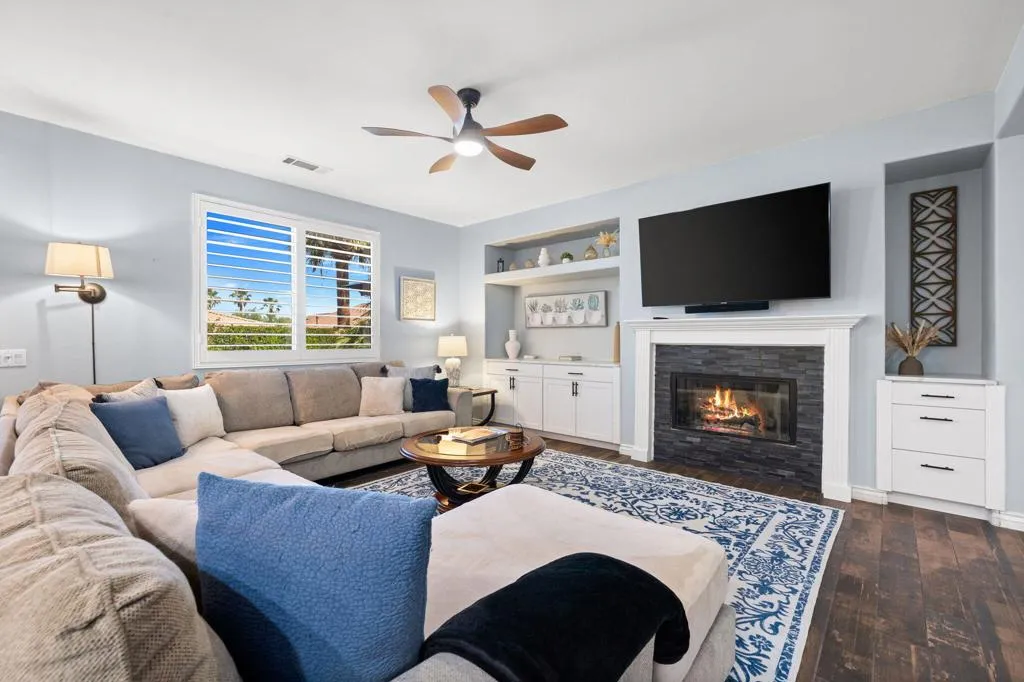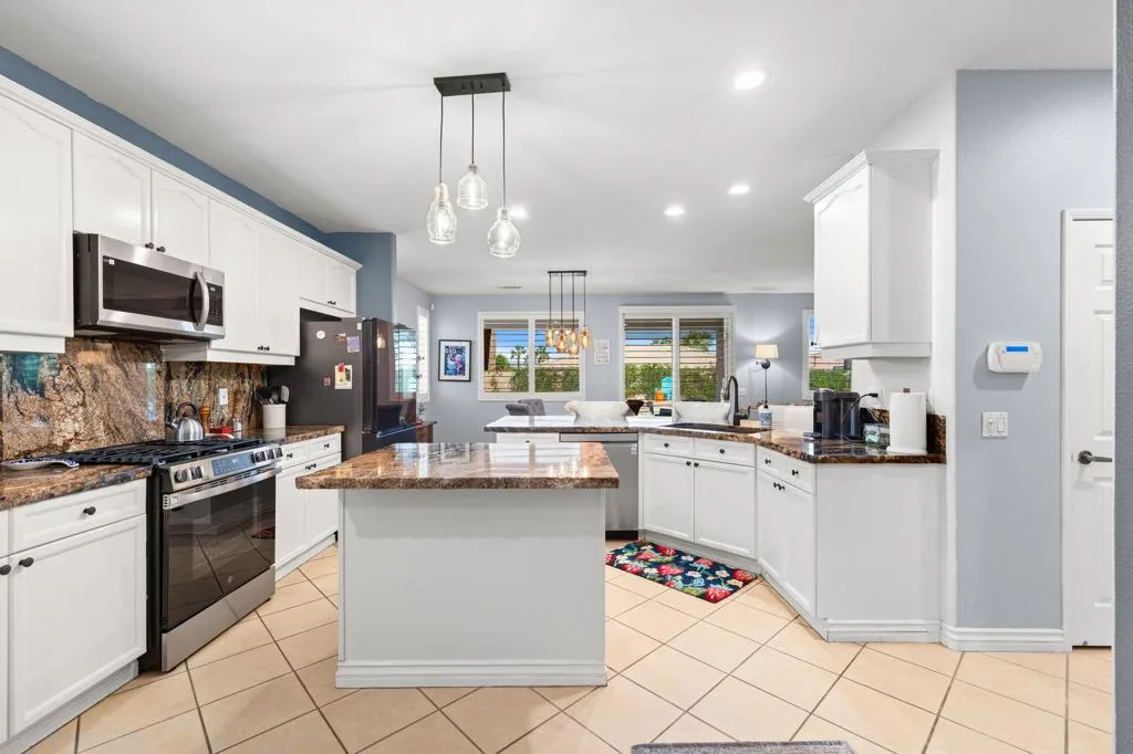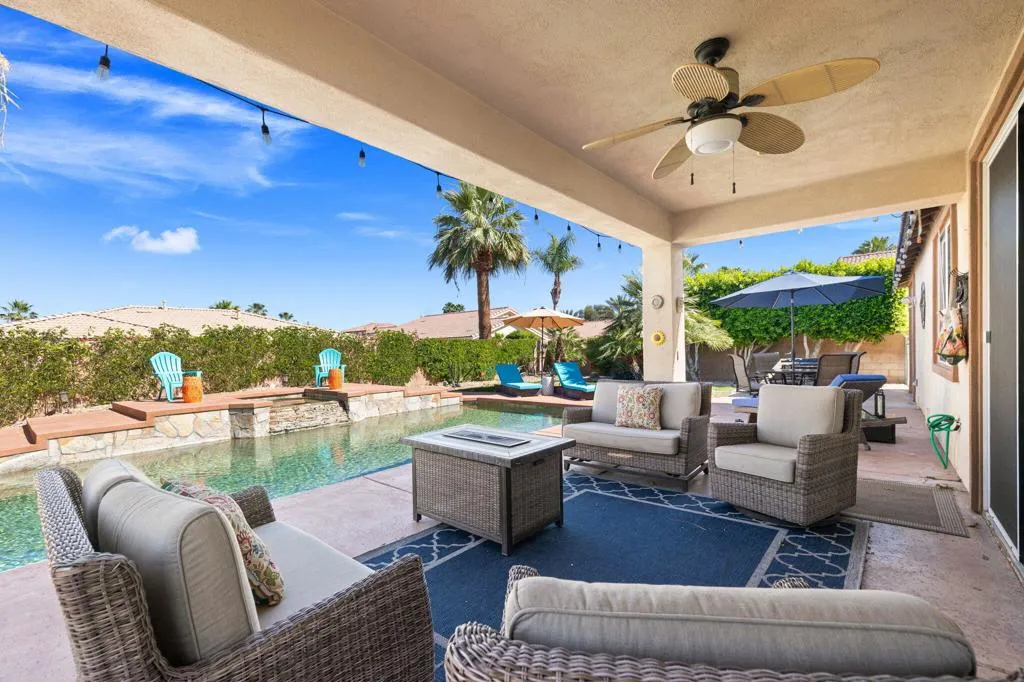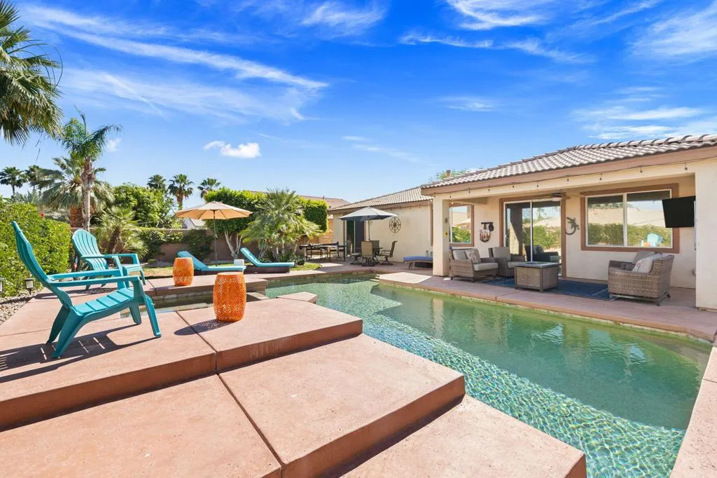 Here is the dream home you have been waiting for! This home has a 3.5% assumable mortgage with approximately $400,000 balance with lender approval This pristine and well-maintained home is the perfect primary home, second home or short term rental. The home has the Indio license for short term rentals but has mainly been the primary residence for the homeowners. You will love the gorgeous pool and spa with coping and decking recently redone. The home features 3 bedrooms, 2 baths, 2 car oversized garage with upgrades galore. The great room is spacious with open dining area and views to the lush back yard with covered patio and large pool and spa. The kitchen has slab granite counters with chiseled edge and stainless appliances. The main bedroom has a walk in closet and ensuite bath with double vanities and walk in shower plus soaking tub. The 2nd bath is also upgraded with double vanities and convenient to bedrooms 2 and 3. All the floors are hard surface. Ceiling fans help cool and circulate air. The garage has storage cabinets and plenty of room for 2 cars. This home is conveniently located to events, stores restaurants, and schools. You will love this home and the wonderful life you will enjoy.