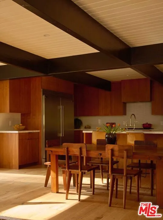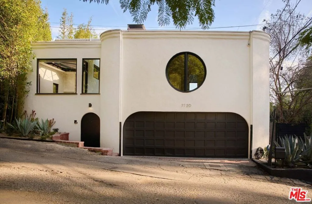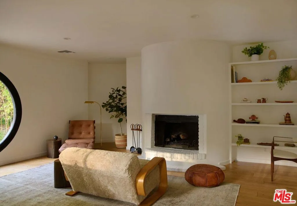 On a quiet cul-de-sac in the Hollywood Hills, this celebrity-owned reimagined 3 bedroom, 3.5 bath mid-century home offers a deep connection to its natural surroundings. Intimate, yet open and inviting, this home brims with natural light, framed by views of the canyons beyond. The main level features a warm open plan chef's kitchen with a generous island and seamless sightlines to the outdoor patio, firepit, pool, and treetop views. A large fireplace anchors the living room, where expansive windows invite sunshine throughout the day, allowing for constant dialogue between indoors and out. Two bedrooms with a shared bath, a powder room, and a cozy nook complete the first floor. Upstairs, dramatic skylights illuminate a den with floor-to-ceiling bookshelves and ample space to relax. Just across the hall lies the primary suite, private and serene, with a fireplace, a walk-in closet, and a large bathroom with a soaking tub and separate shower. An attached two-car garage allows for easy access and security. A perfect balance of mid-century modern details matched with contemporary comforts within a peaceful hillside setting make this an inviting retreat that captures the quiet, timeless spirit of the Hollywood Hills.