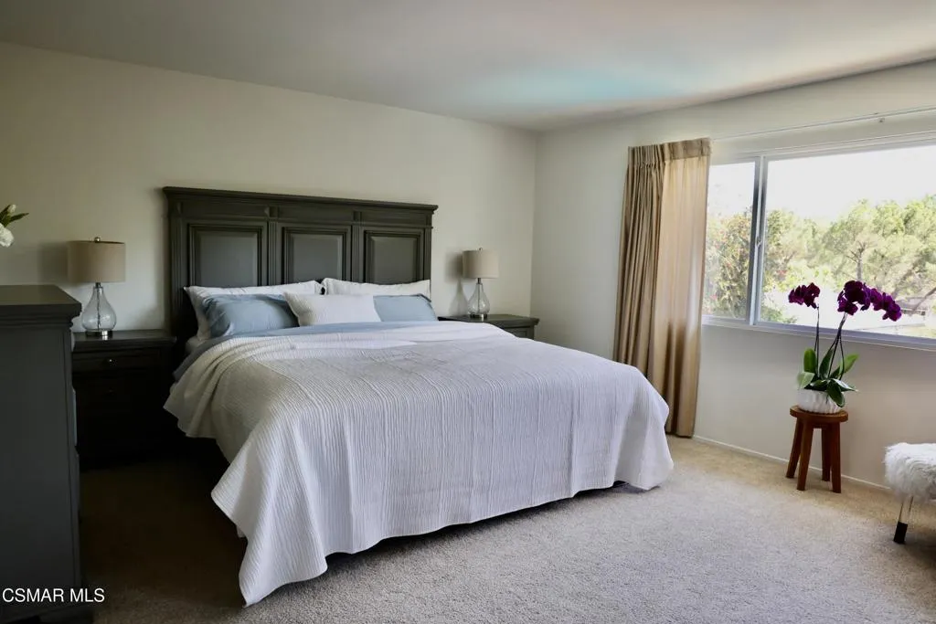 Located in a quiet Foxmoor Hills cul-de-sac, this private house offers architectural character, abundant natural light, and a serene setting. A long paver driveway leads to mature landscaping and a welcoming entry.Inside, soaring ceilings and floor-to-ceiling windows create an open, light-filled living space with views of the pool and garden. The kitchen provides ample cabinetry, counter space, and a breakfast bar opening to flexible work or lounge areas. Multiple living spaces, including a media room with fireplace, add versatility. A main-level bedroom with a renovated full bath enhances layout flexibility.Upstairs, the primary suite features peaceful mountain views, dual vanities, soaking tub, walk-in shower, and a sunlit walk-in closet. Additional bedrooms are thoughtfully arranged with an upgraded bath.The private backyard is designed for relaxed California living with a sparkling pool, flagstone patio, pergola-covered dining area, firepit, BBQ space, and lush greenery. French doors and oversized windows create seamless indoor-outdoor flow.Features include: hardwood flooring upstairs, fully owned solar, Tesla EV charger, and a garage with built-in storage and gym/office setup.Conveniently located near shopping, dining, hiking trails, freeway access, and minutes to the beach.