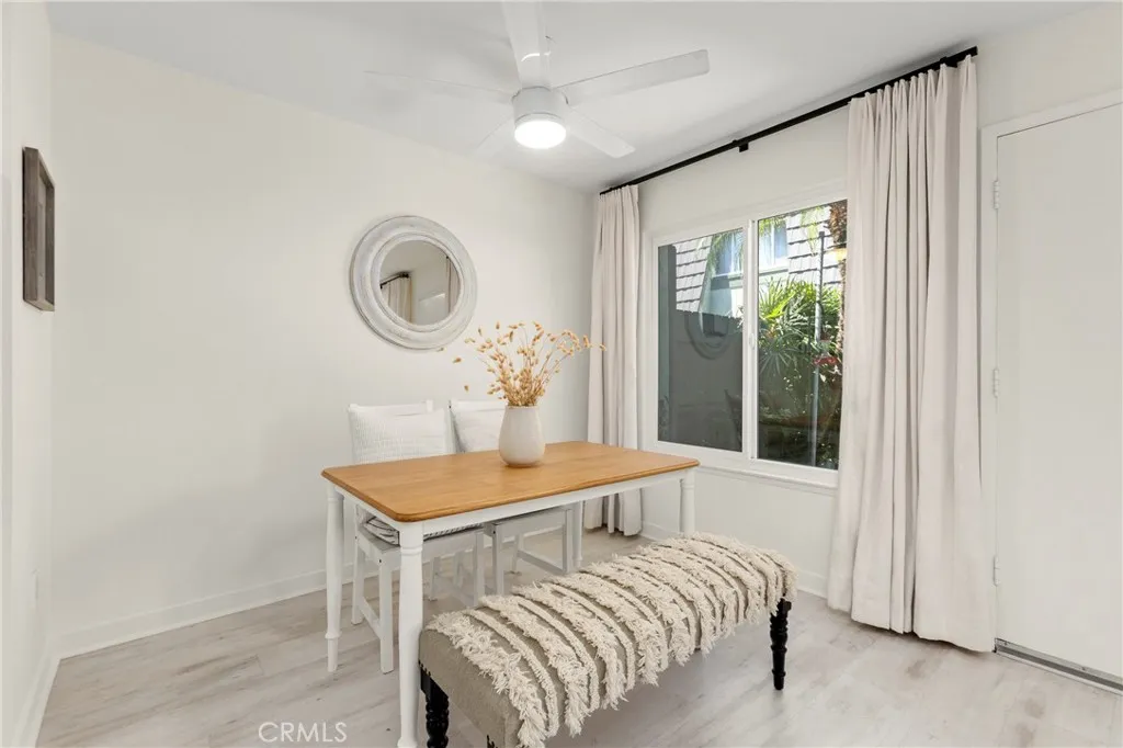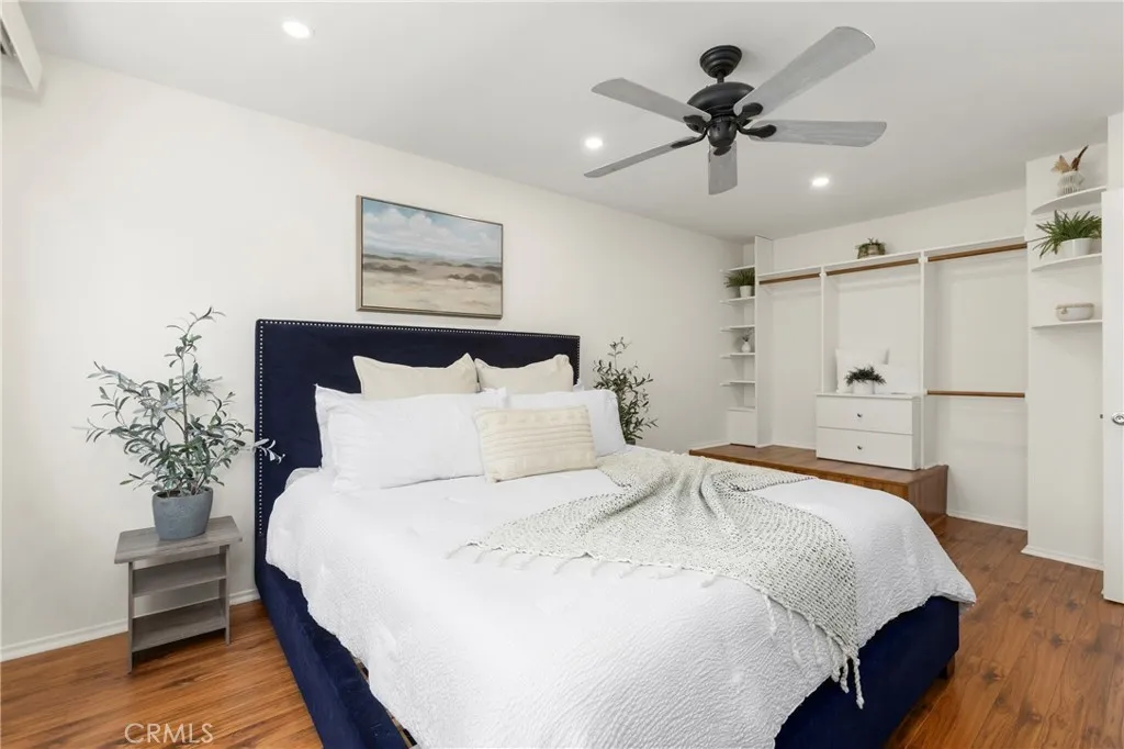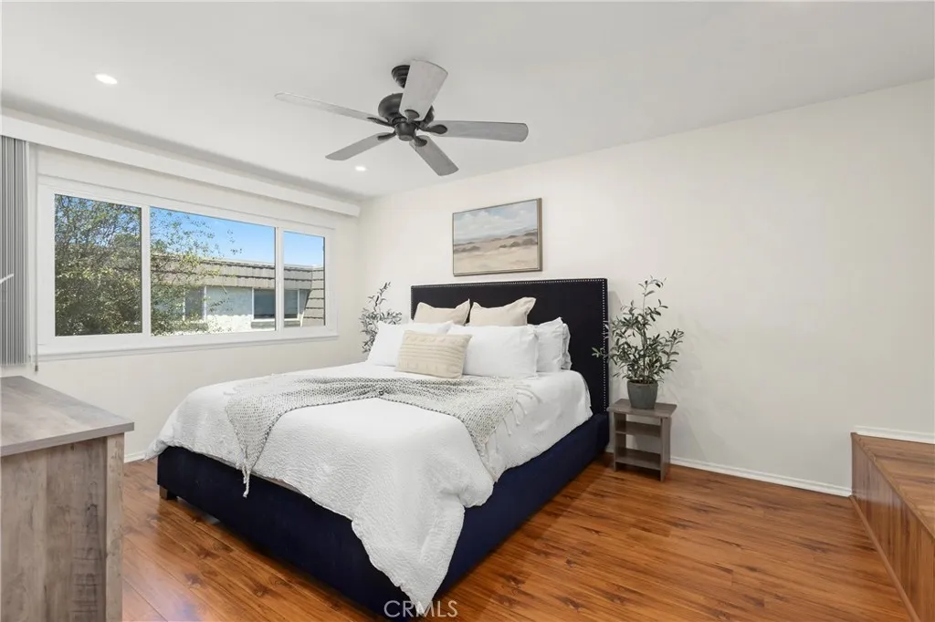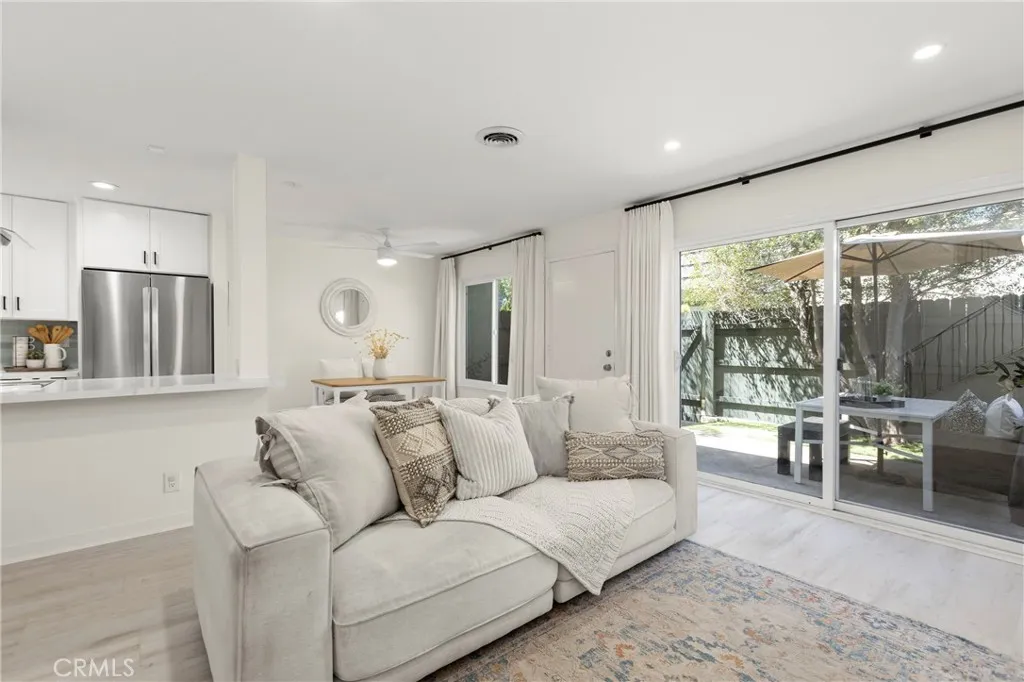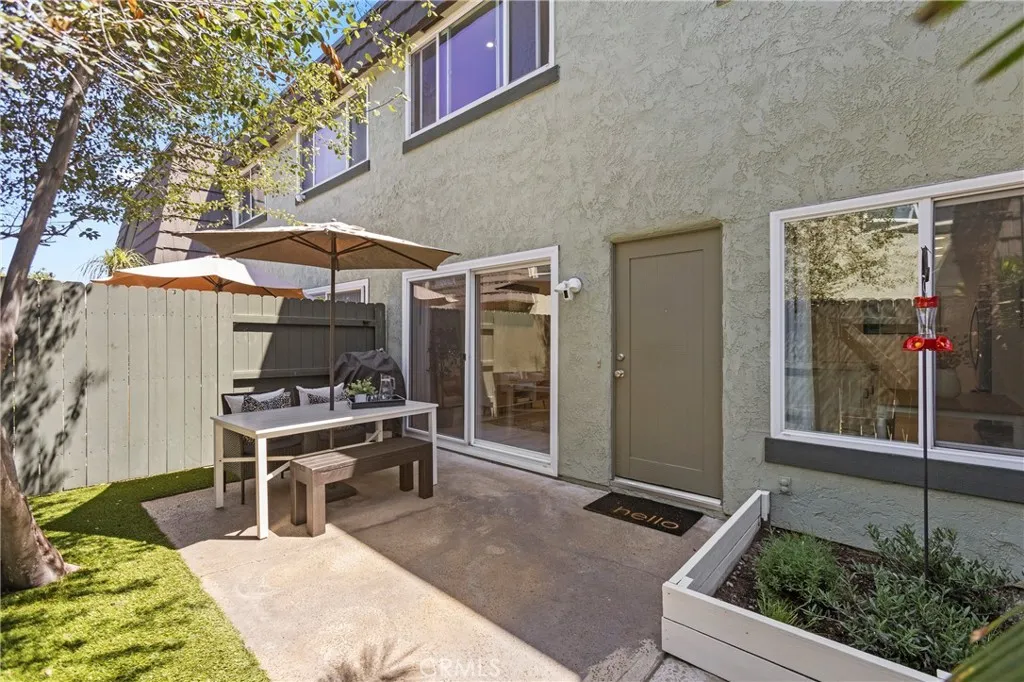 Welcome Home to Mesa Verde Villas in the heart of Costa Mesa! This highly renovated 2 bedroom, 1 bath residence has been freshly painted throughout, creating a neutral palette complementary to soft-toned Rigid Core Vinyl Plank Flooring on the main-level, and Luxury Laminate Flooring on the upper-level, with dimmable recessed lighting, ceiling fans, dual pane windows and custom window treatments. This modern home features a unique open-concept Kitchen Remodel, with full views to the spacious dining and living area, including Shaker soft-close cabinets, Quartz countertops, tastefully chosen backsplash, large stainless sink, Smart Oven, Everpure Drinking Water Purification System, and newer LG Stainless Steel Refrigerator, all included! A dual pane sliding door just off the living room with a perfectly positioned and included TV for easy viewing from all main-level areas, provides increased air flow and natural sunlight with direct access to the custom landscaped patio where low maintenance Turf, rose bushes, mature palms and silver sheen give privacy and offer a peaceful retreat. A hallway window has been added to enhance natural light upstairs, along with a Smart Thermostat for central A/C and heating, newer water heater and stairway carpet. Exterior walls and upstairs ceilings have been fully insulated for increased thermal protection. The spacious master bedroom features custom blinds, modern ceiling fan, open-concept closet and built-in shelving. The gorgeous velvet Master bed frame, dresser, side tables, and TV are all included! The bright secondary bedroom offers a motorized dual-light cell shade, ceiling fan and a full-sized closet. The full bath was renovated in 2013 with tiled flooring, tiled shower, soaking tub, vanity and fixtures. It was updated in 2022 with a new commode, dual shower heads and most recently, sconce lighting. Parking includes an attached garage with one additional designated parking space and street parking. The garage has been walled-in with a newer Smart automatic garage door, insulated side walls, washer/dryer hookups, storage, and epoxy flooring. Washer and dryer are included! This special home is truly turnkey, located steps away from the community pool and BBQ area. Walking distance to schools, parks, Mesa Verde Golf Course, Santa Ana River Trail, and a short bike ride to the beach, SOCO & the OC Mix, with convenient access to major freeways, South Coast Plaza and John Wayne Airport.