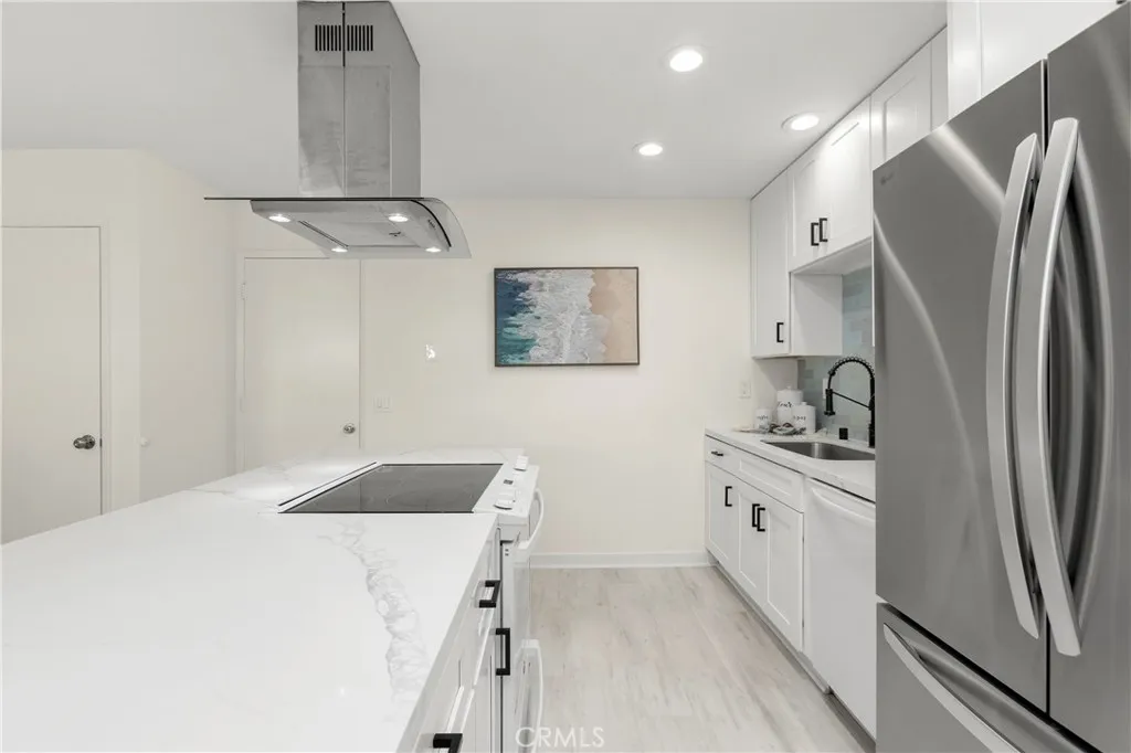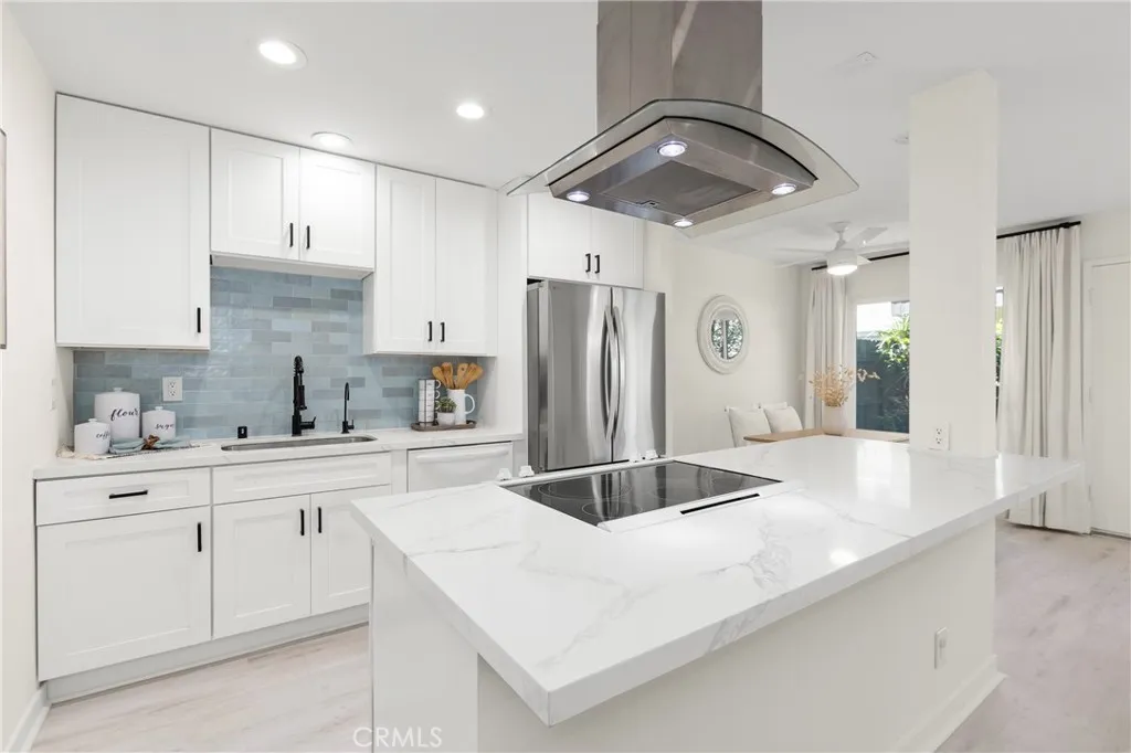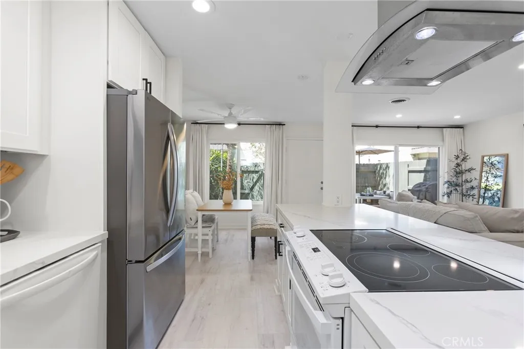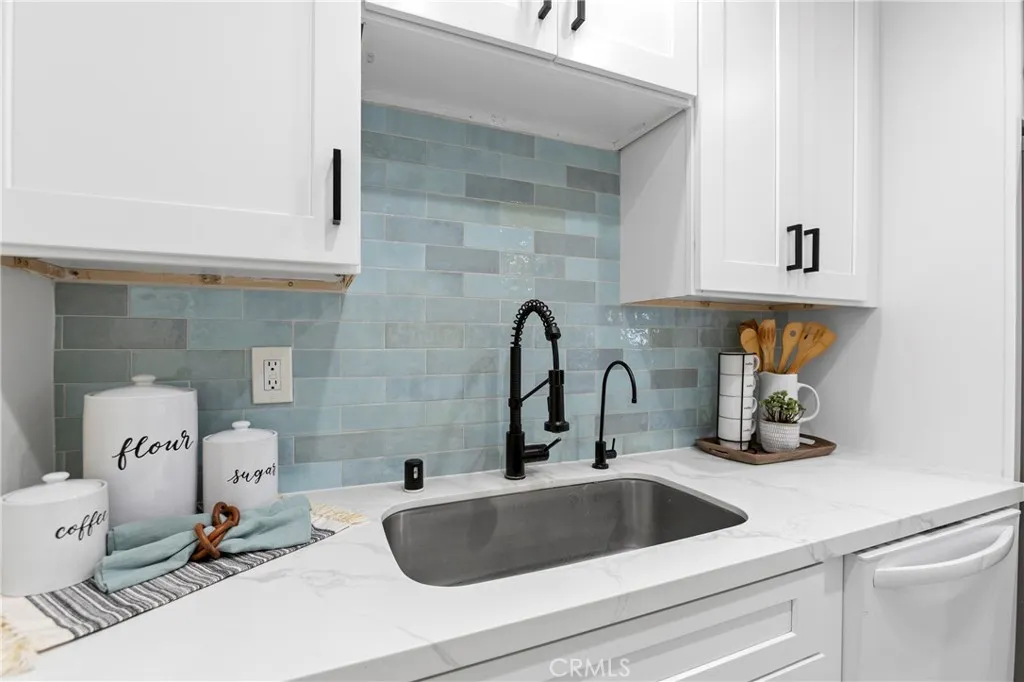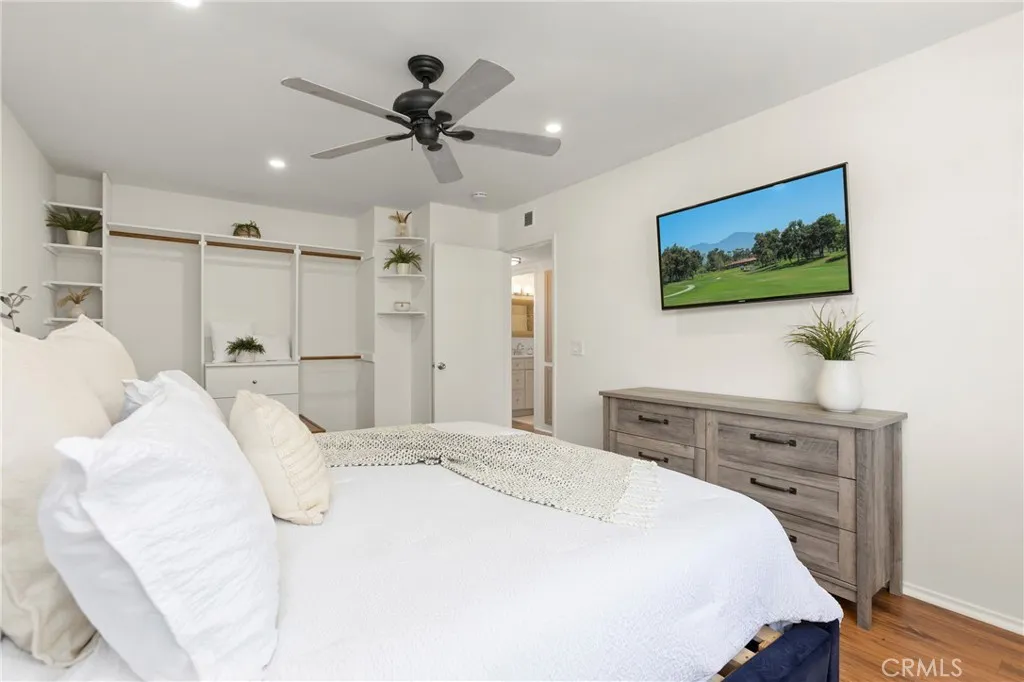 Welcome Home to Mesa Verde Villas in the heart of Costa Mesa! This highly renovated 2 bedroom, 1 bath residence has been freshly painted throughout, creating a neutral palette complementary to soft-toned Rigid Core Vinyl Plank Flooring on the main-level, and Luxury Laminate Flooring on the upper-level, with dimmable recessed lighting, ceiling fans, dual pane windows and custom window treatments. This modern home features a unique open-concept Kitchen Remodel, with full views to the spacious dining and living area, including Shaker soft-close cabinets, Quartz countertops, tastefully chosen backsplash, large stainless sink, Smart Oven, Everpure Drinking Water Purification System, and newer LG Stainless Steel Refrigerator, all included! A dual pane sliding door just off the living room with a perfectly positioned and included TV for easy viewing from all main-level areas, provides increased air flow and natural sunlight with direct access to the custom landscaped patio where low maintenance Turf, rose bushes, mature palms and silver sheen give privacy and offer a peaceful retreat. A hallway window has been added to enhance natural light upstairs, along with a Smart Thermostat for central A/C and heating, newer water heater and stairway carpet. Exterior walls and upstairs ceilings have been fully insulated for increased thermal protection. The spacious master bedroom features custom blinds, modern ceiling fan, open-concept closet and built-in shelving. The gorgeous velvet Master bed frame, dresser, side tables, and TV are all included! The bright secondary bedroom offers a motorized dual-light cell shade, ceiling fan and a full-sized closet. The full bath was renovated in 2013 with tiled flooring, tiled shower, soaking tub, vanity and fixtures. It was updated in 2022 with a new commode, dual shower heads and most recently, sconce lighting. Parking includes an attached garage with one additional designated parking space and street parking. The garage has been walled-in with a newer Smart automatic garage door, insulated side walls, washer/dryer hookups, storage, and epoxy flooring. Washer and dryer are included! This special home is truly turnkey, located steps away from the community pool and BBQ area. Walking distance to schools, parks, Mesa Verde Golf Course, Santa Ana River Trail, and a short bike ride to the beach, SOCO & the OC Mix, with convenient access to major freeways, South Coast Plaza and John Wayne Airport.